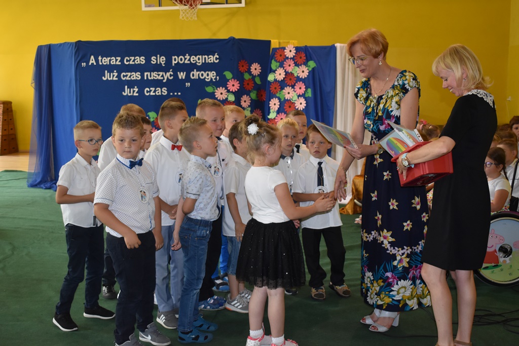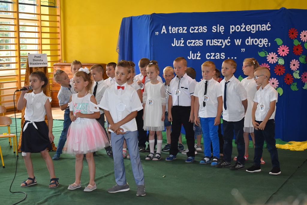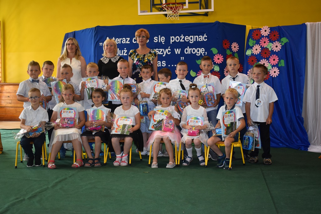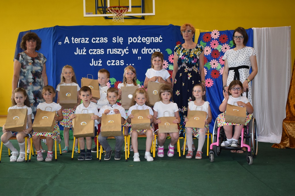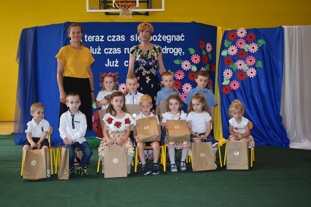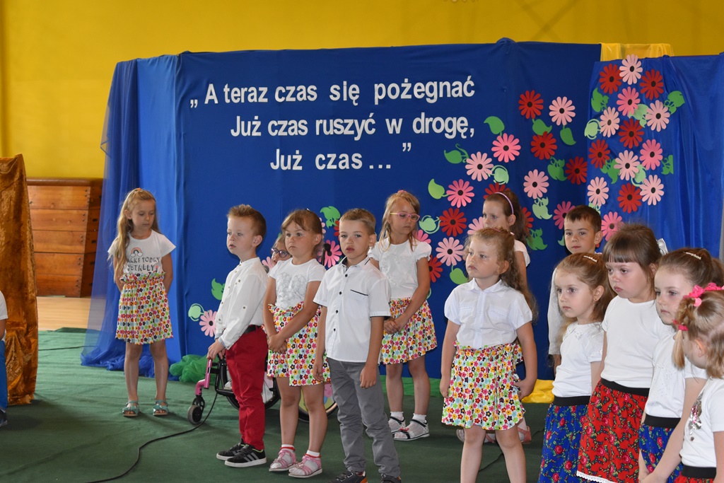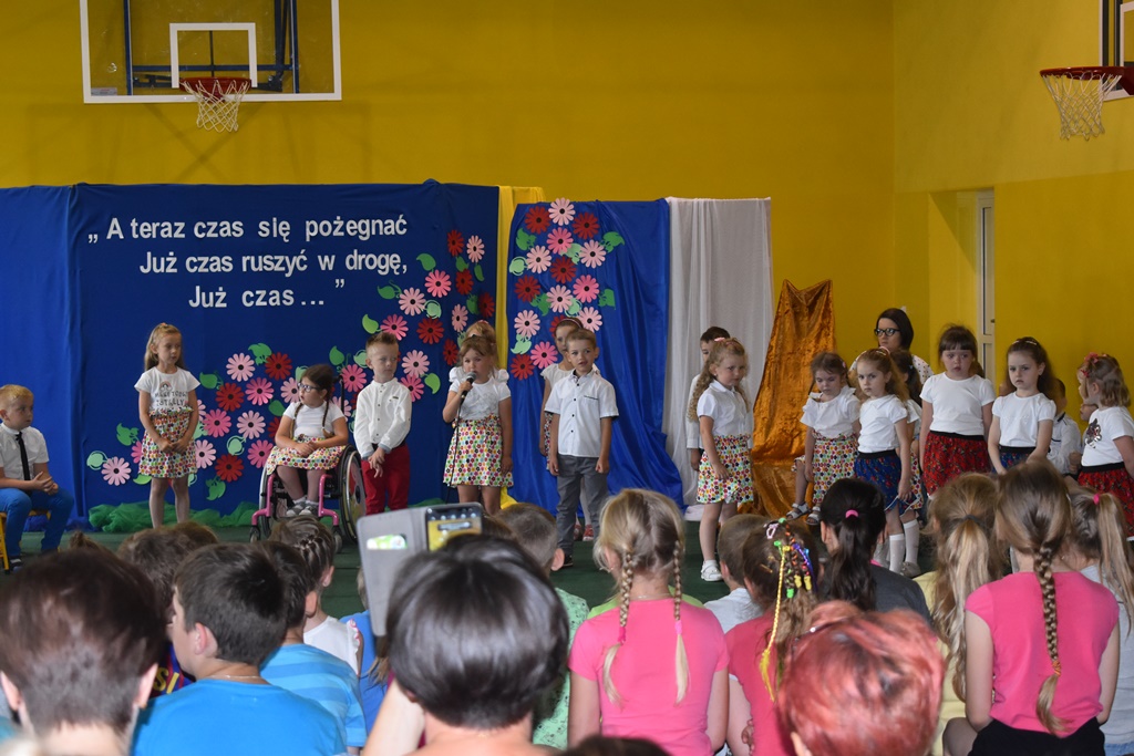 18 czerwca 2019 r. w sali gimnastycznej naszej szkoły dzieci z oddziałów przedszkolnych pożegnały się z przedszkolem. Młodsze przedszkolaki tylko na czas wakacji, natomiast 6-latki opuszczają salę przedszkolną, aby we wrześniu rozpocząć naukę w klasie I. Pogram artystyczny rozpoczęły młodsze grupy, a w swoich piosenkach i wierszach przypominały o zachowaniu bezpieczeństwa podczas wakacji. Następnie podziękowały swoim Paniom za całoroczną pracę i pożegnały starszych kolegów i koleżanki. W kolejnym punkcie uroczystości to sześciolatki żegnały się z przedszkolem, wspominając pierwsze chwile w nim spędzone, dziękując Paniom i dyrekcji szkoły. Były kwiaty, uśmiechy ale także łzy wzruszenia. Kochane Starszaki życzymy Wam wspaniałego startu w klasie pierwszej już od września!!