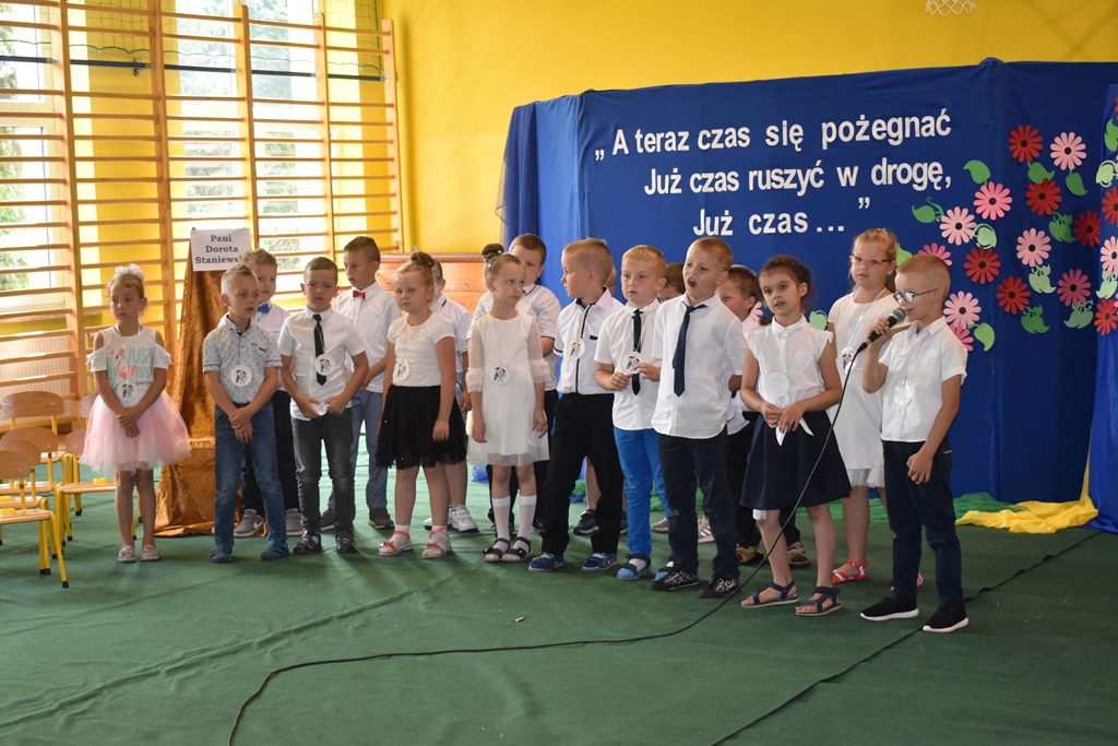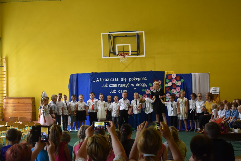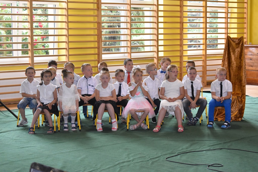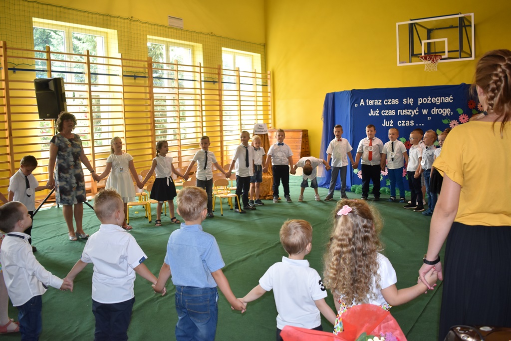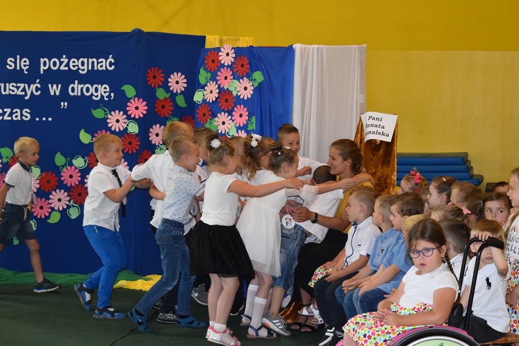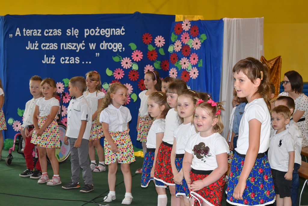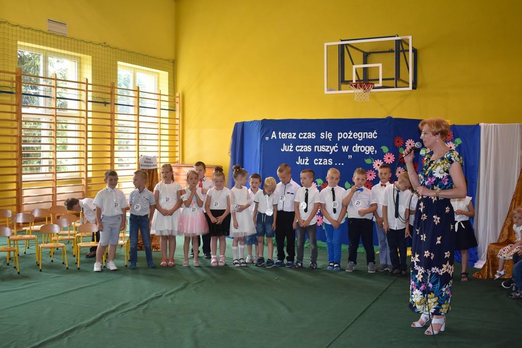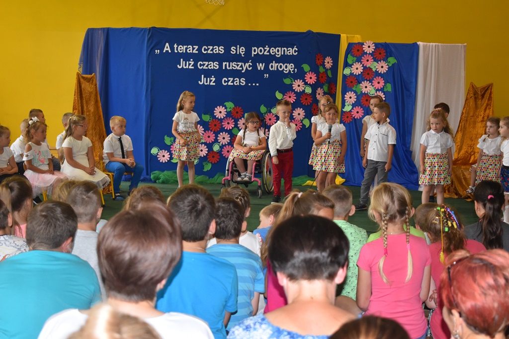 18 czerwca 2019 r. w sali gimnastycznej naszej szkoły dzieci z oddziałów przedszkolnych pożegnały się z przedszkolem. Młodsze przedszkolaki tylko na czas wakacji, natomiast 6-latki opuszczają salę przedszkolną, aby we wrześniu rozpocząć naukę w klasie I. Pogram artystyczny rozpoczęły młodsze grupy, a w swoich piosenkach i wierszach przypominały o zachowaniu bezpieczeństwa podczas wakacji. Następnie podziękowały swoim Paniom za całoroczną pracę i pożegnały starszych kolegów i koleżanki. W kolejnym punkcie uroczystości to sześciolatki żegnały się z przedszkolem, wspominając pierwsze chwile w nim spędzone, dziękując Paniom i dyrekcji szkoły. Były kwiaty, uśmiechy ale także łzy wzruszenia. Kochane Starszaki życzymy Wam wspaniałego startu w klasie pierwszej już od września!!