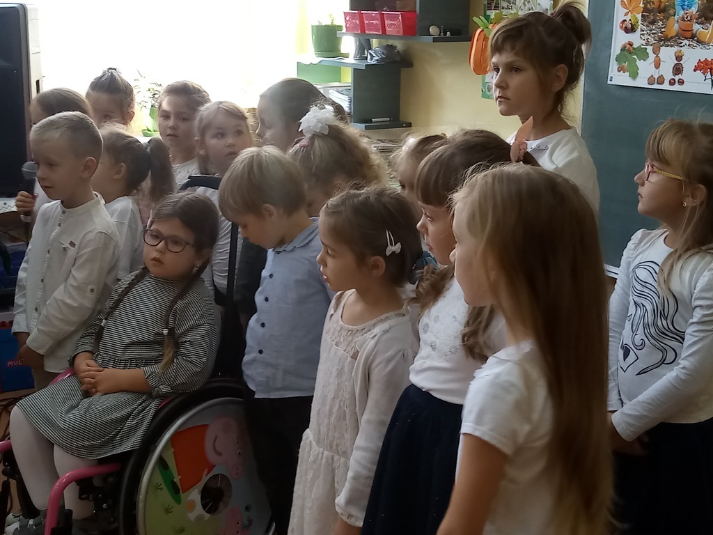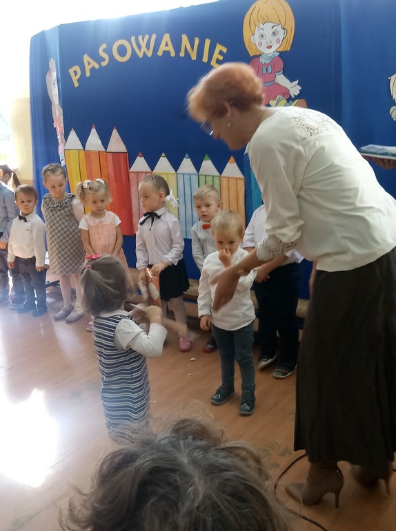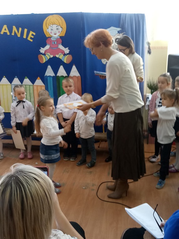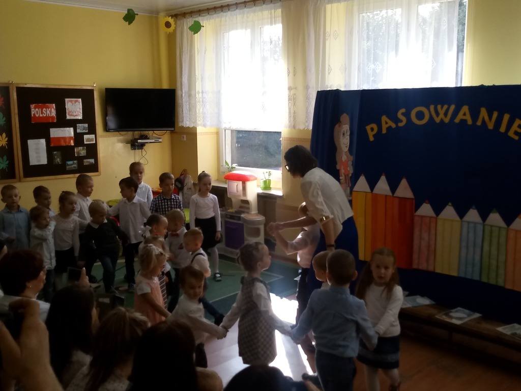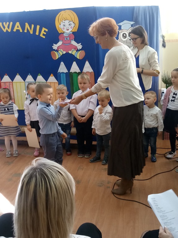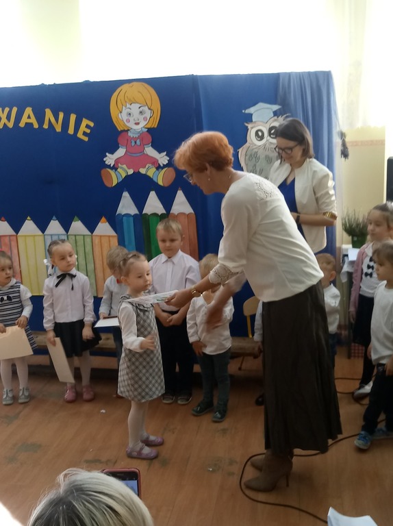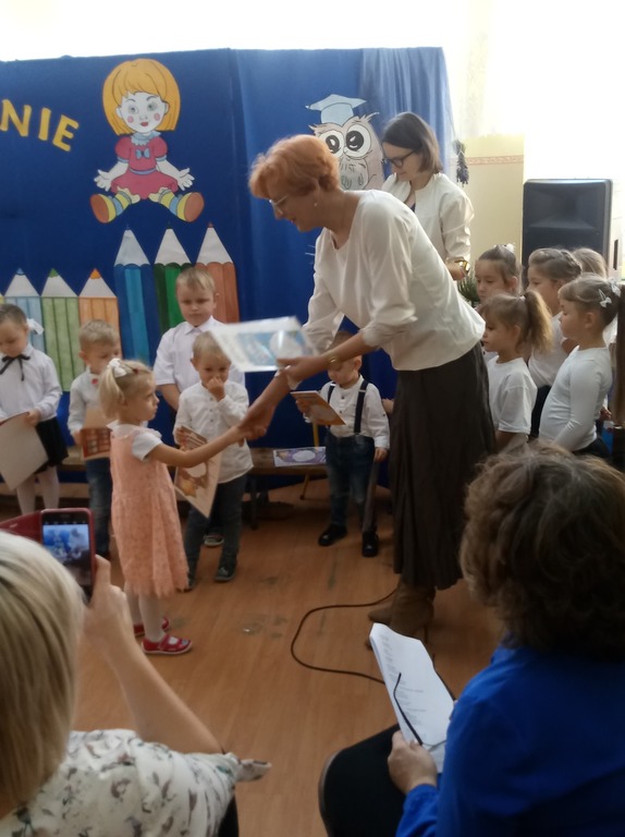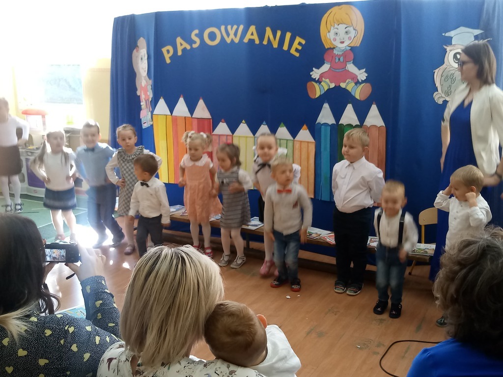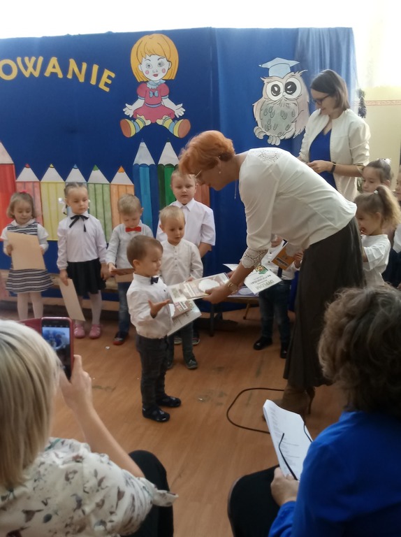 W naszej uroczystości udział wzięły Panie Dyrektor, rodzice oraz nauczyciele edukacji przedszkolnej. Starsi koledzy i koleżanki z ogromnym zaangażowaniem pomogli maluchom w przygotowaniu części artystycznej, którą wspólnie zaprezentowali, natomiast czas spędzony na próbach przyczynił się do integracji dzieci oraz wdrożenia w realia życia przedszkolnego.