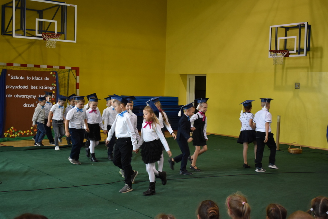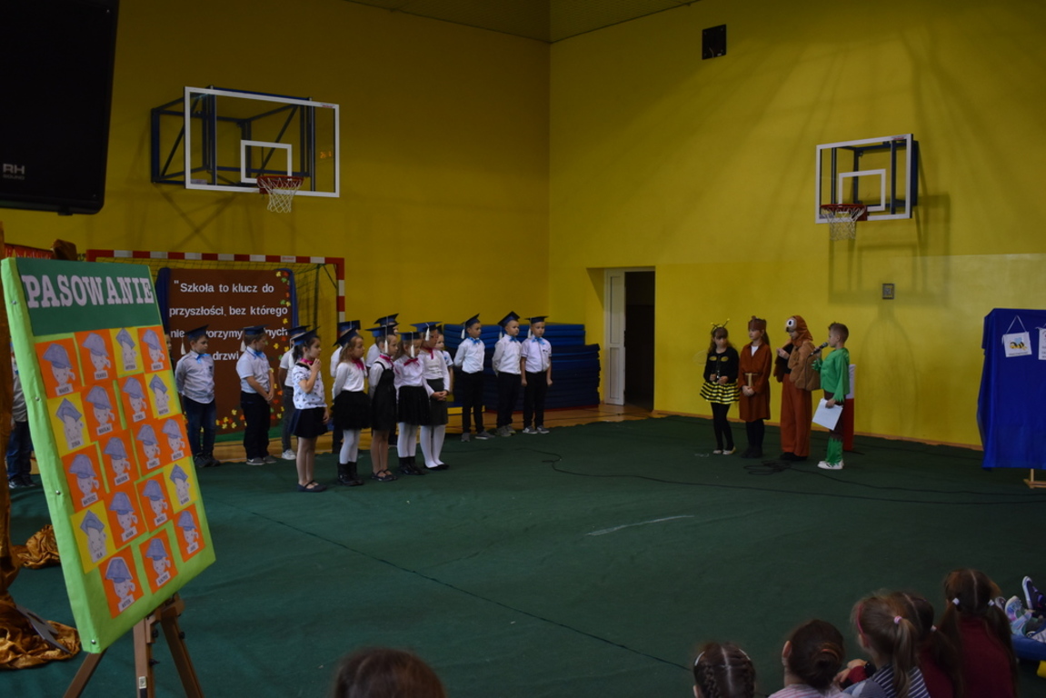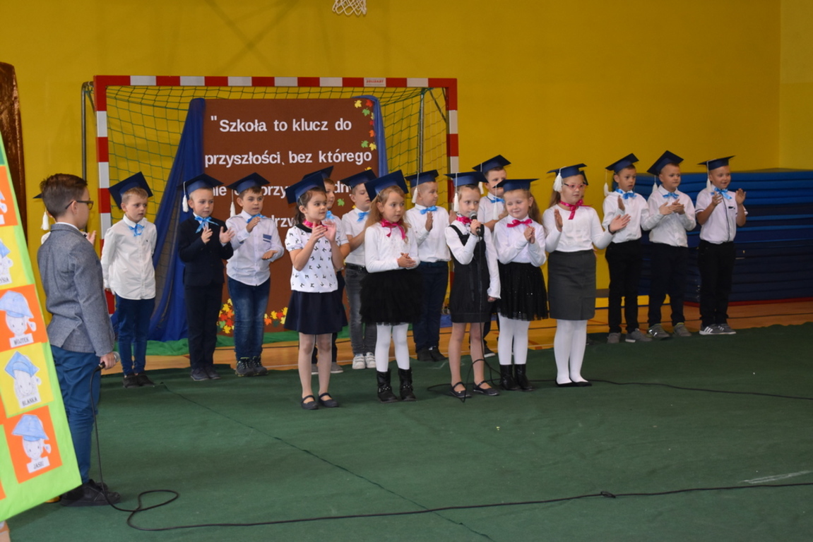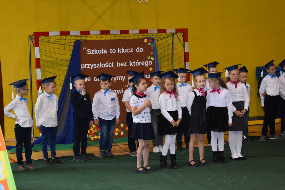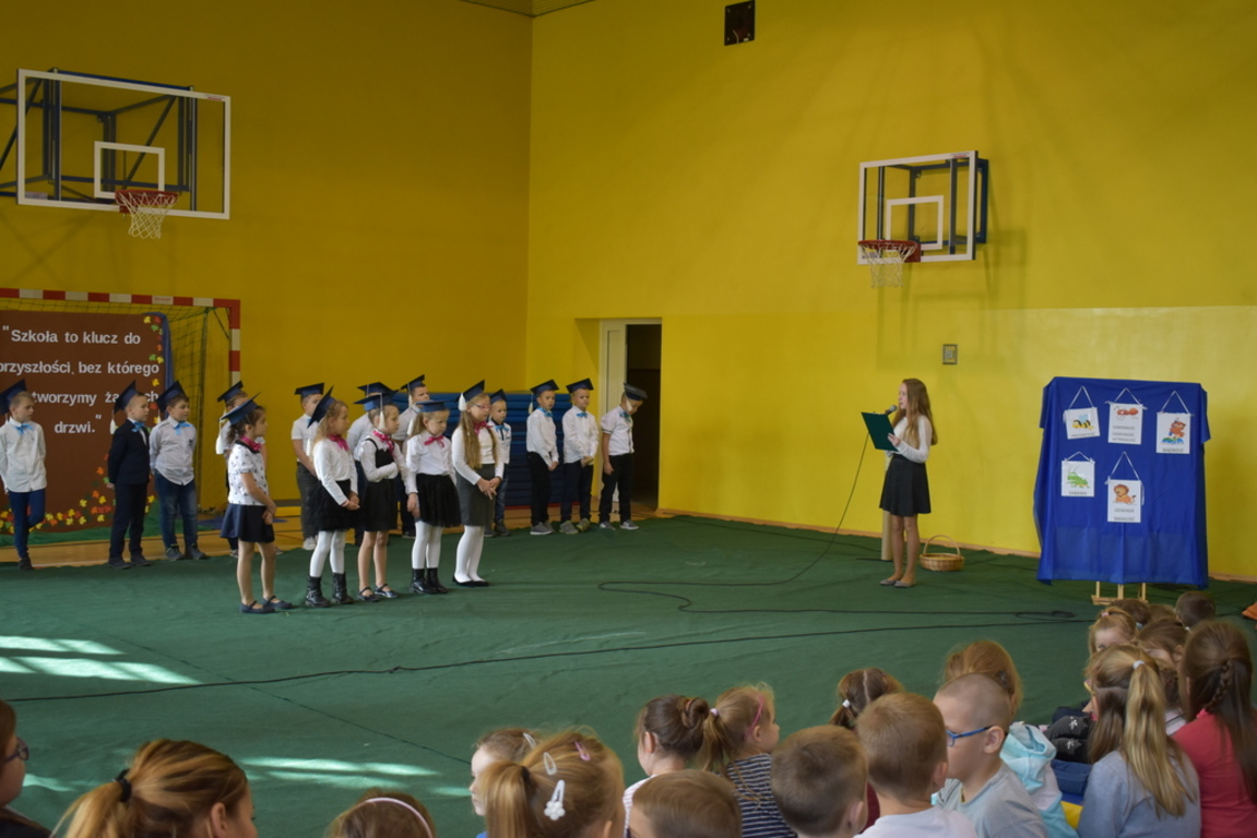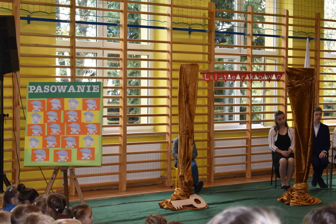 Kiedy nadszedł moment rozpoczęcia uroczystości, uczennica klasy szóstej Anna Wawrzyniak powitała serdecznie dyrekcję, rodziców, nauczycieli, uczniów, a szczególnie klasę pierwszą, której "oddała głos". Dzieci w przygotowanej scenerii zaprezentowały swoje umiejętności aktorskie przedstawiając inscenizację pt. "W Literkowie". Podczas przedstawienia otrzymali mnóstwo prezentów od koleżanek i kolegów z klasy trzeciej, a tym samym byli gotowi wejść do LITERKOWA, gdzie zaprosił ich Pan Alfabet. Po burzy oklasków, w odświętnych strojach, w kolorowych biretach na głowach pierwszacy błysnęli talentem. Znajomość przepisów ruchu drogowego, pięknie zaśpiewane piosenki, przyjaźń i koleżeństwo w grupie rówieśniczej to dowód, że dzieci są gotowe do sumiennej pracy w szkole.