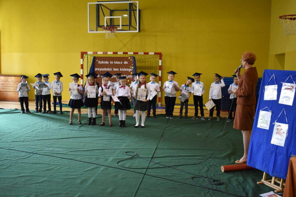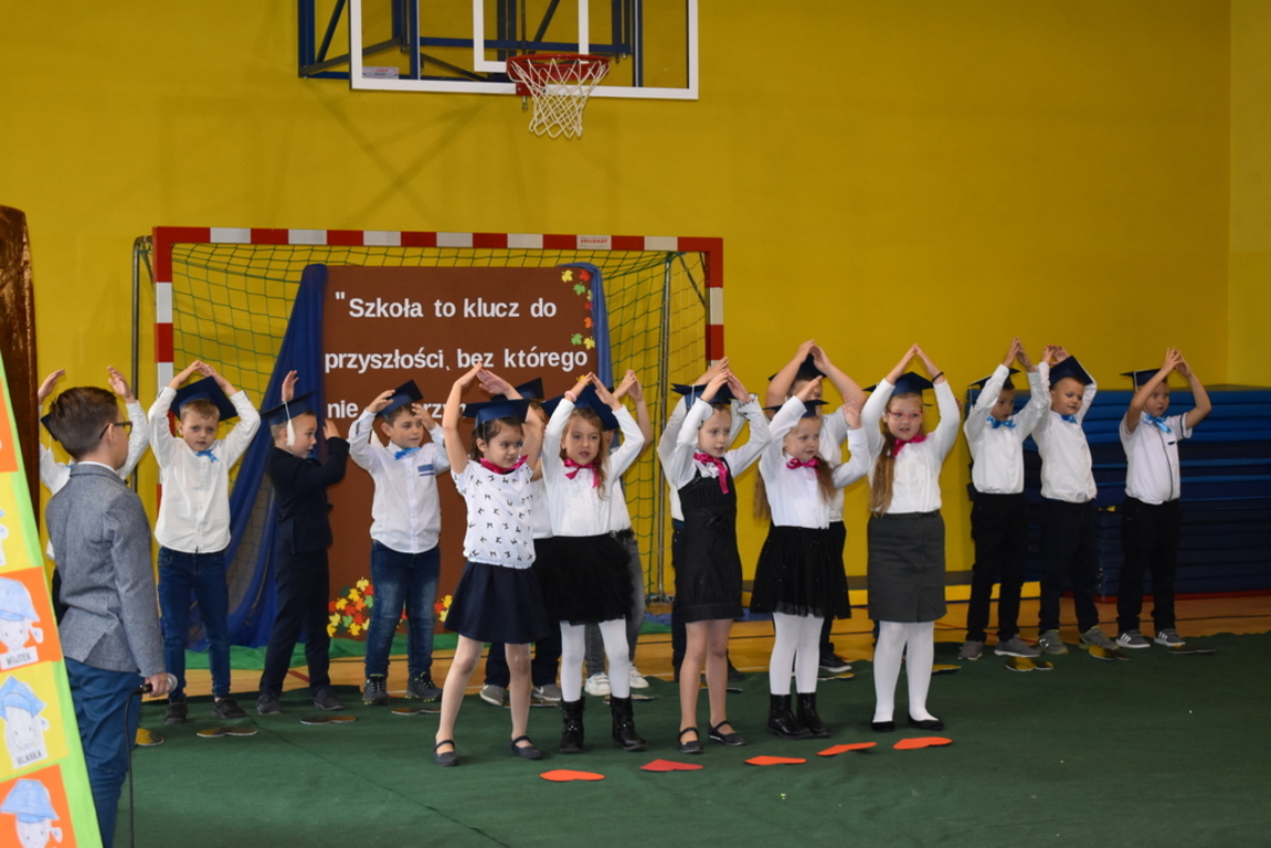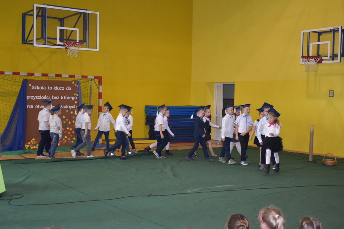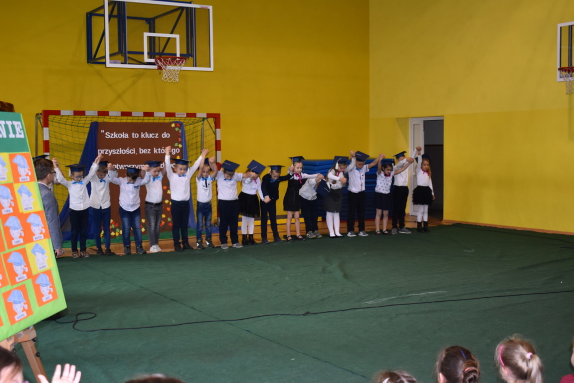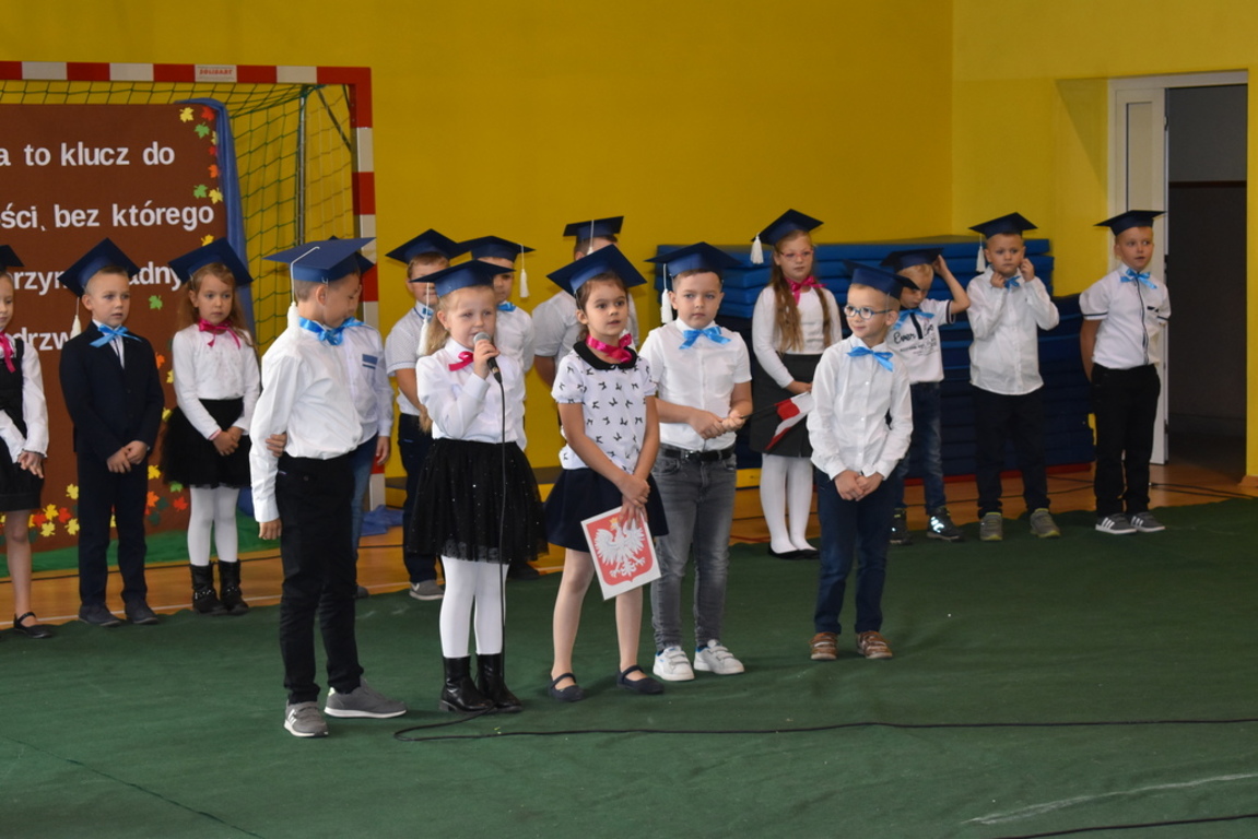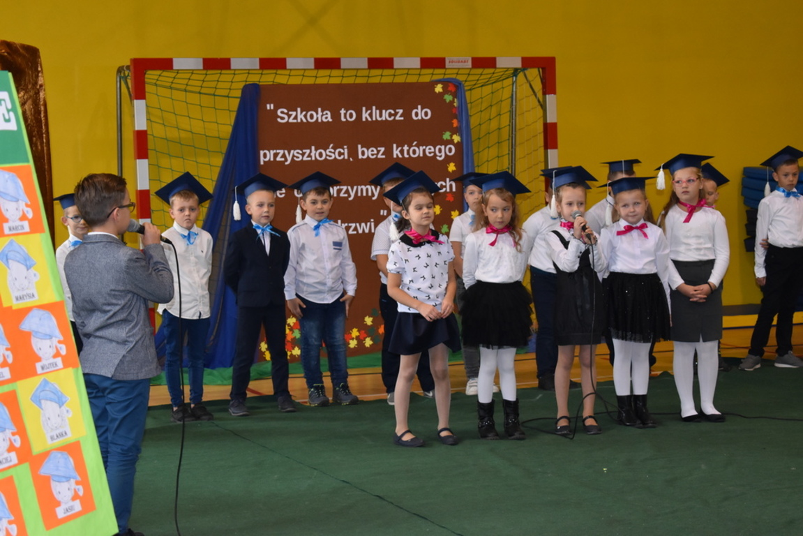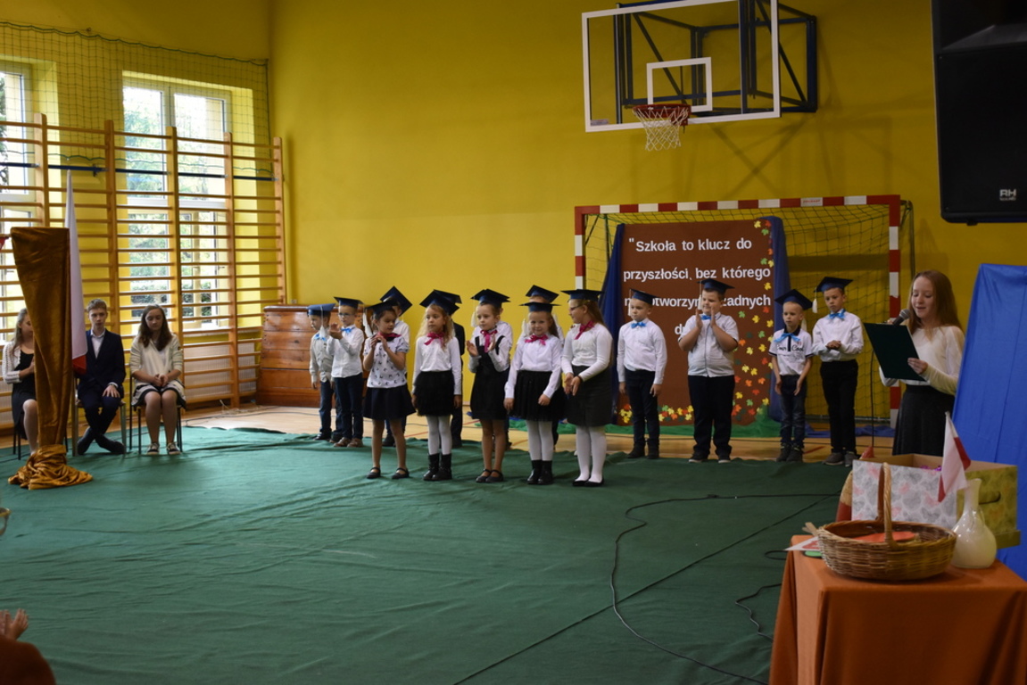 Kiedy nadszedł moment rozpoczęcia uroczystości, uczennica klasy szóstej Anna Wawrzyniak powitała serdecznie dyrekcję, rodziców, nauczycieli, uczniów, a szczególnie klasę pierwszą, której "oddała głos". Dzieci w przygotowanej scenerii zaprezentowały swoje umiejętności aktorskie przedstawiając inscenizację pt. "W Literkowie". Podczas przedstawienia otrzymali mnóstwo prezentów od koleżanek i kolegów z klasy trzeciej, a tym samym byli gotowi wejść do LITERKOWA, gdzie zaprosił ich Pan Alfabet. Po burzy oklasków, w odświętnych strojach, w kolorowych biretach na głowach pierwszacy błysnęli talentem. Znajomość przepisów ruchu drogowego, pięknie zaśpiewane piosenki, przyjaźń i koleżeństwo w grupie rówieśniczej to dowód, że dzieci są gotowe do sumiennej pracy w szkole.
