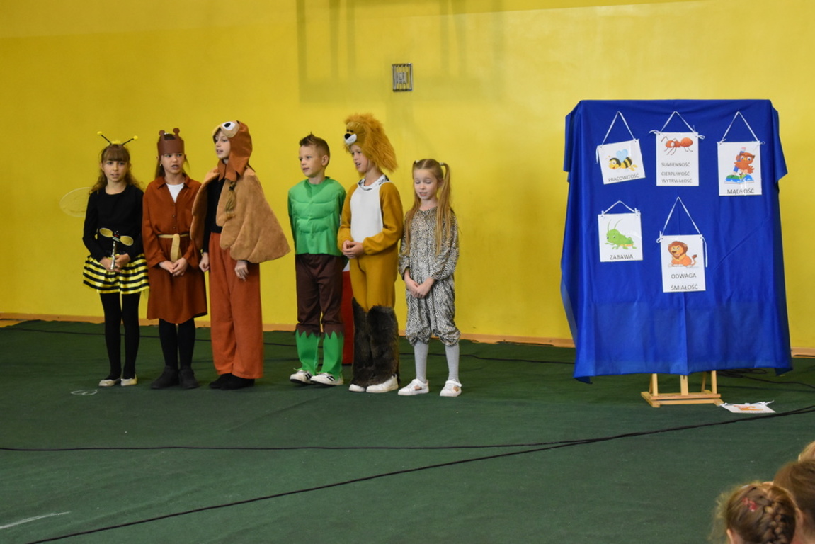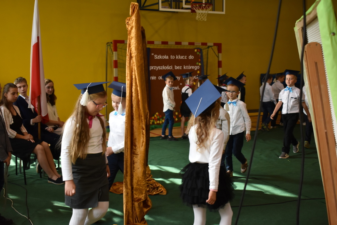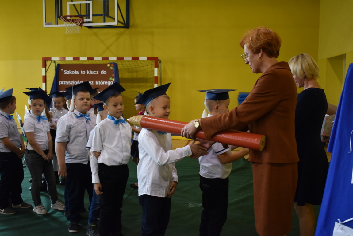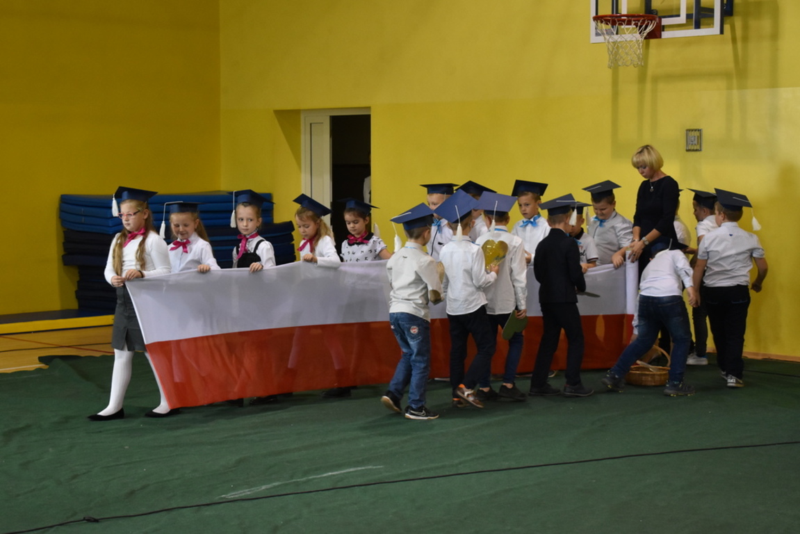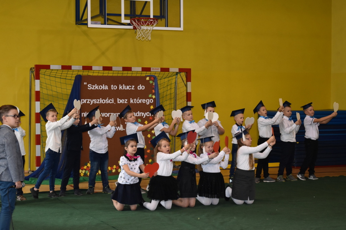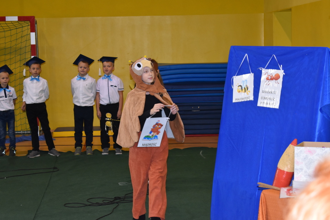 Kiedy nadszedł moment rozpoczęcia uroczystości, uczennica klasy szóstej Anna Wawrzyniak powitała serdecznie dyrekcję, rodziców, nauczycieli, uczniów, a szczególnie klasę pierwszą, której "oddała głos". Dzieci w przygotowanej scenerii zaprezentowały swoje umiejętności aktorskie przedstawiając inscenizację pt. "W Literkowie". Podczas przedstawienia otrzymali mnóstwo prezentów od koleżanek i kolegów z klasy trzeciej, a tym samym byli gotowi wejść do LITERKOWA, gdzie zaprosił ich Pan Alfabet. Po burzy oklasków, w odświętnych strojach, w kolorowych biretach na głowach pierwszacy błysnęli talentem. Znajomość przepisów ruchu drogowego, pięknie zaśpiewane piosenki, przyjaźń i koleżeństwo w grupie rówieśniczej to dowód, że dzieci są gotowe do sumiennej pracy w szkole.