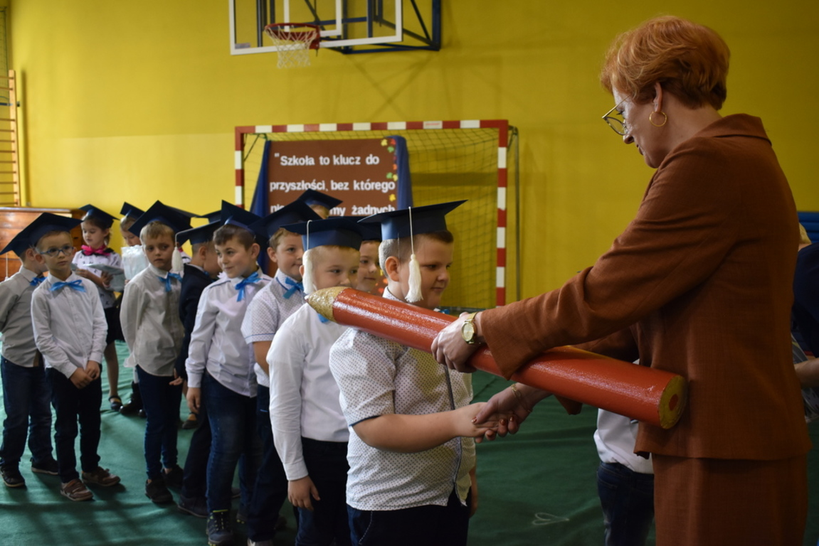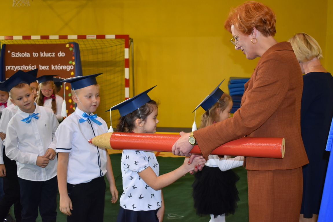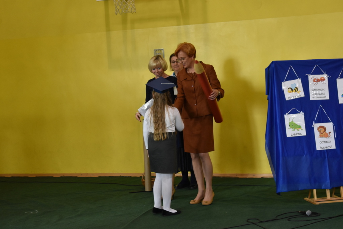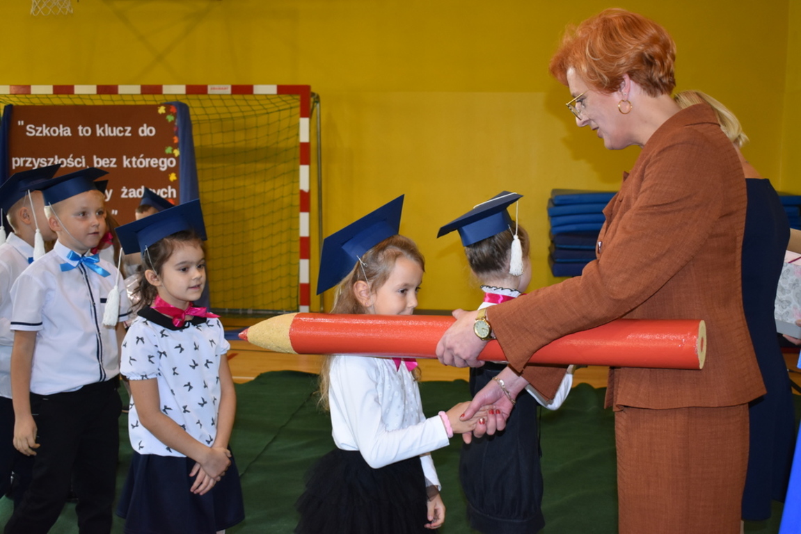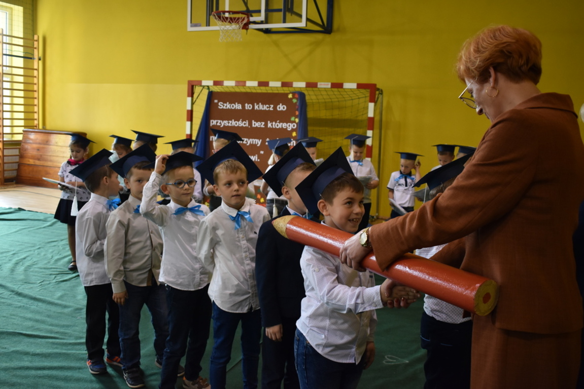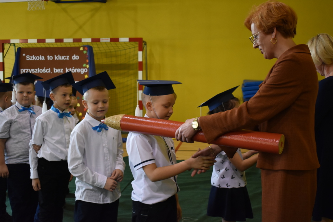 W niezwykle podniosłej atmosferze, przed flagą państwową pierwszacy ślubowali być dobrymi Polakami, godnie reprezentować swoją szkołę, swym zachowaniem i nauką sprawiać radość rodzicom i nauczycielom. Po złożeniu przyrzeczenia pani dyrektor dokonała symbolicznego pasowania na ucznia. "Pasuję Cię na ucznia" - mówiła pani dyrektor, dotykając kredką - jak czarodziejską różdżką ramion swoich podopiecznych.