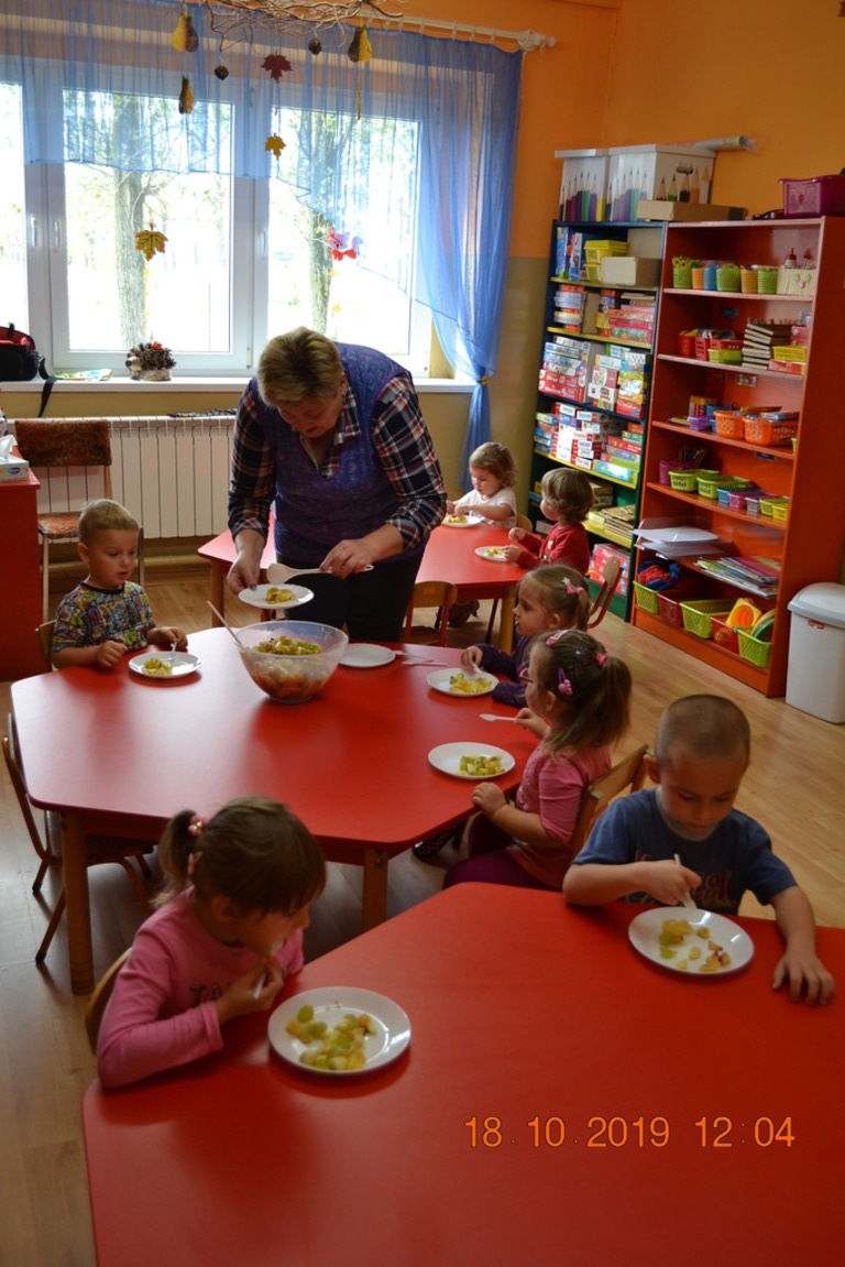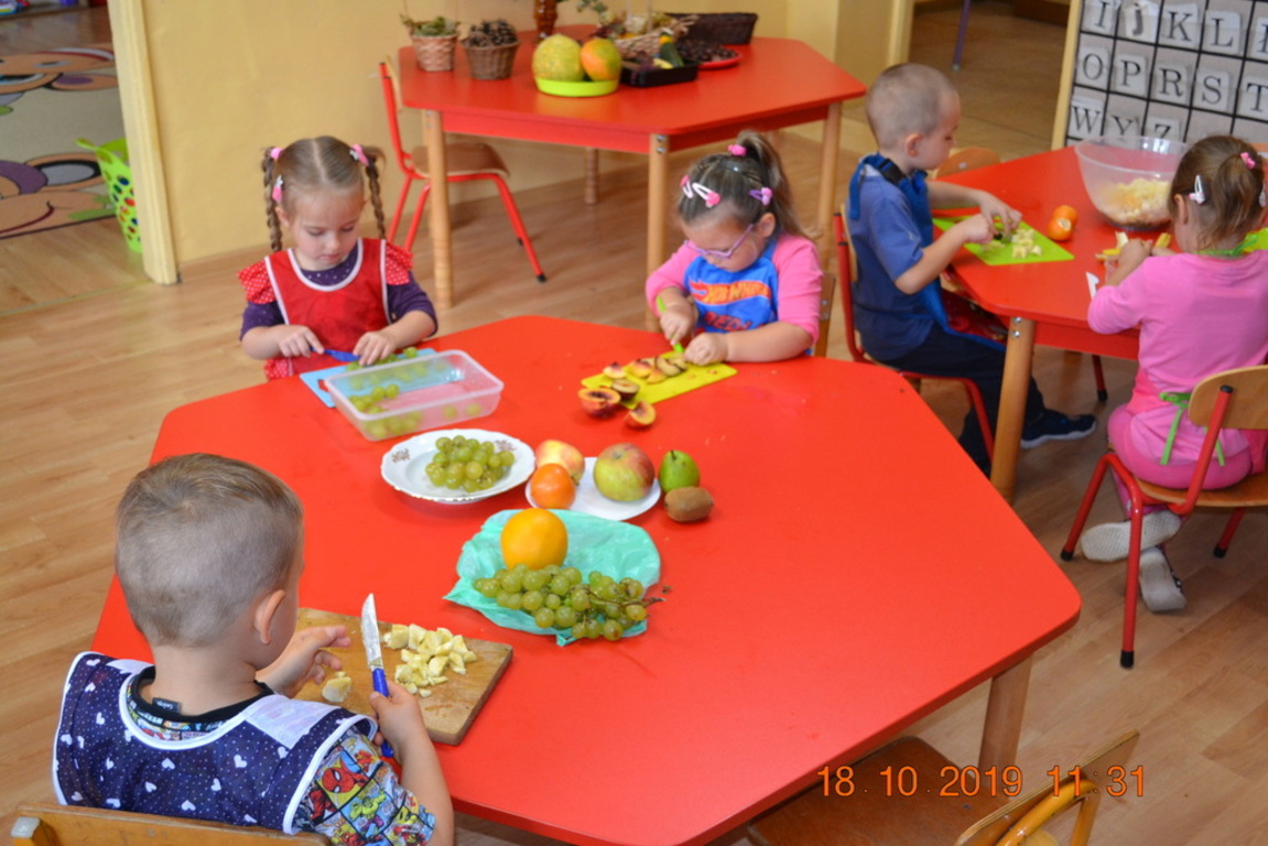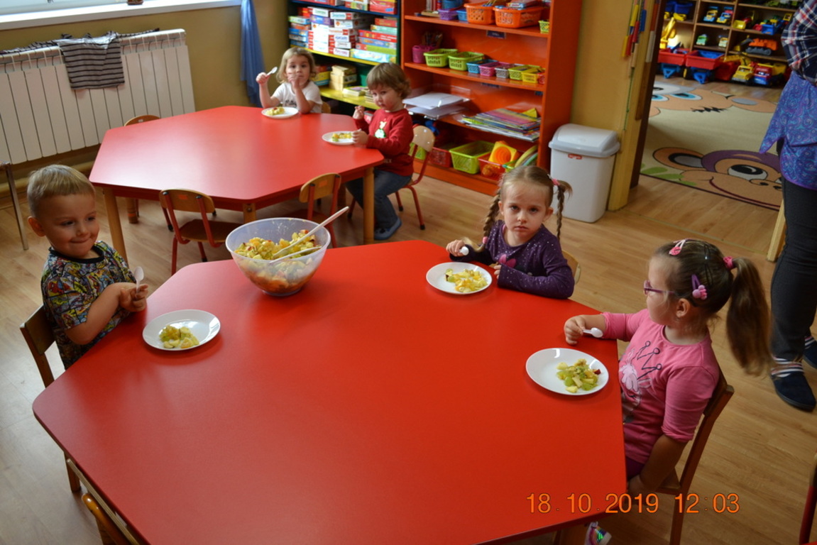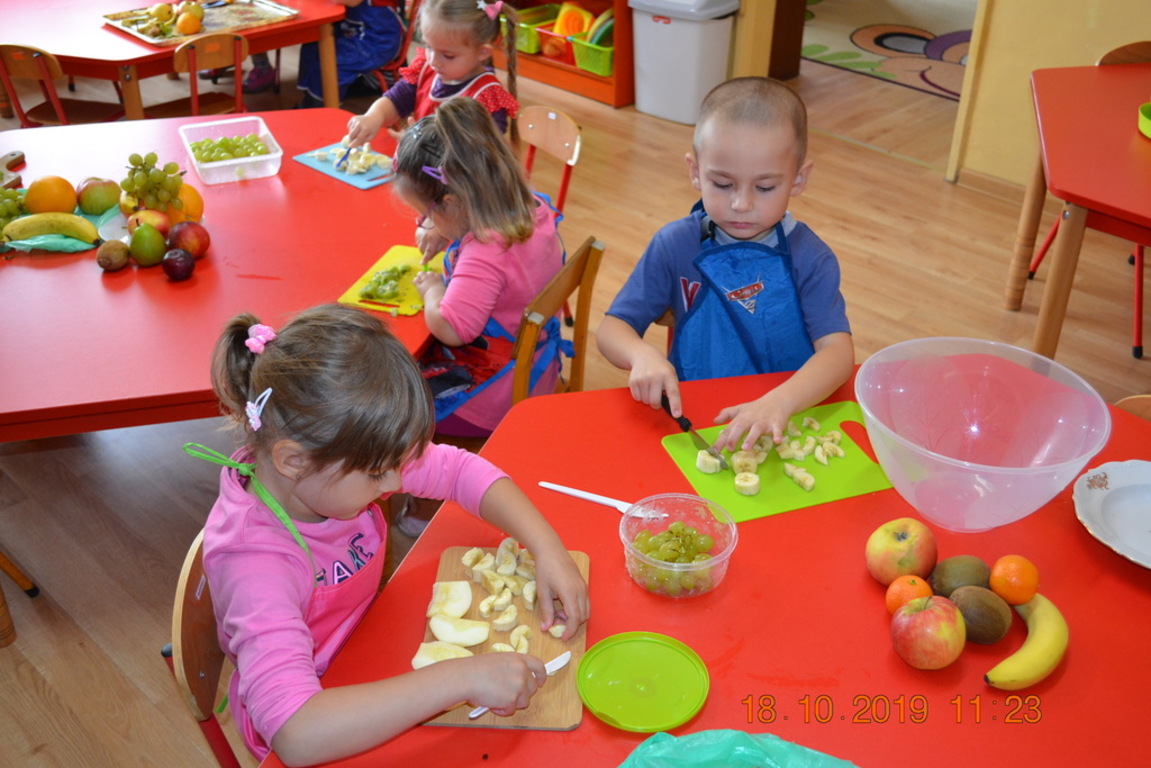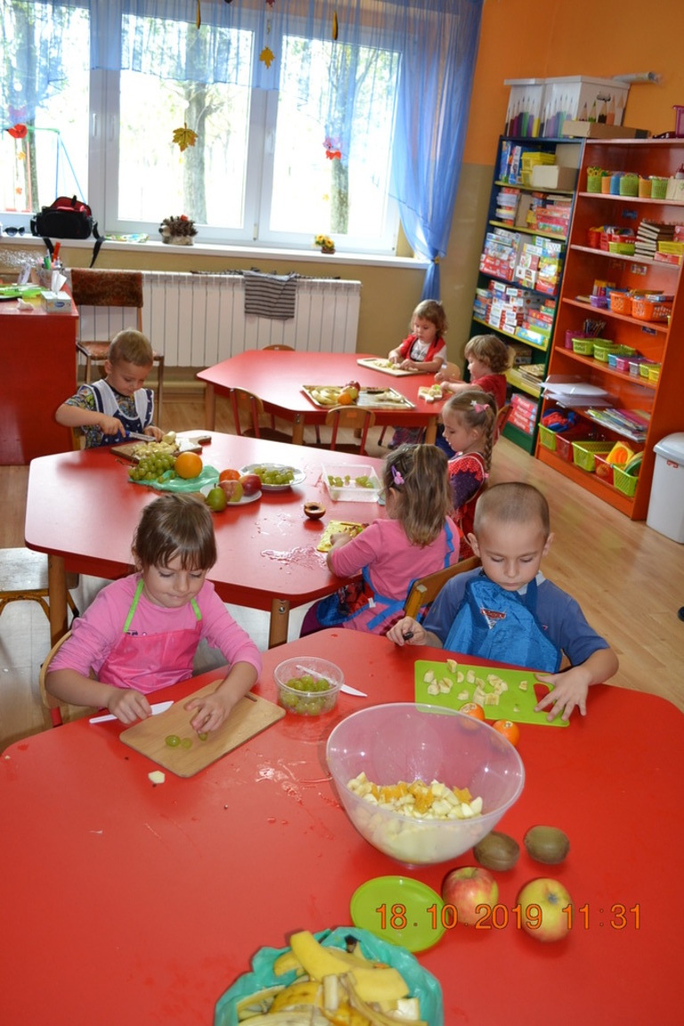 W piątek 18 października w oddziale przedszkolnym we Wrotkowie było przesmacznie, a przede wszystkim zdrowo! Przedszkolaki na zajęciach własnoręcznie przygotowały pyszną, witaminową sałatkę. Dzieci przyniosły z domów różne, świeże owoce. Były jabłka, gruszki, banany, śliwki, nektarynki, kiwi, pomarańcze, mandarynki, winogrona. Po przebraniu się w fartuszki oraz wyszorowaniu rączek, dzieci przystąpiły do pracy. Wszystkie owoce zostały porządnie umyte i obrane ze skórek. Dzieci samodzielnie kroiły wszystkie owoce przestrzegając zasad bezpieczeństwa przy posługiwaniu się nożem. Przygotowanie sałatki dało dzieciom wiele satysfakcji i radości. Sałatka udała się, była pyszna!