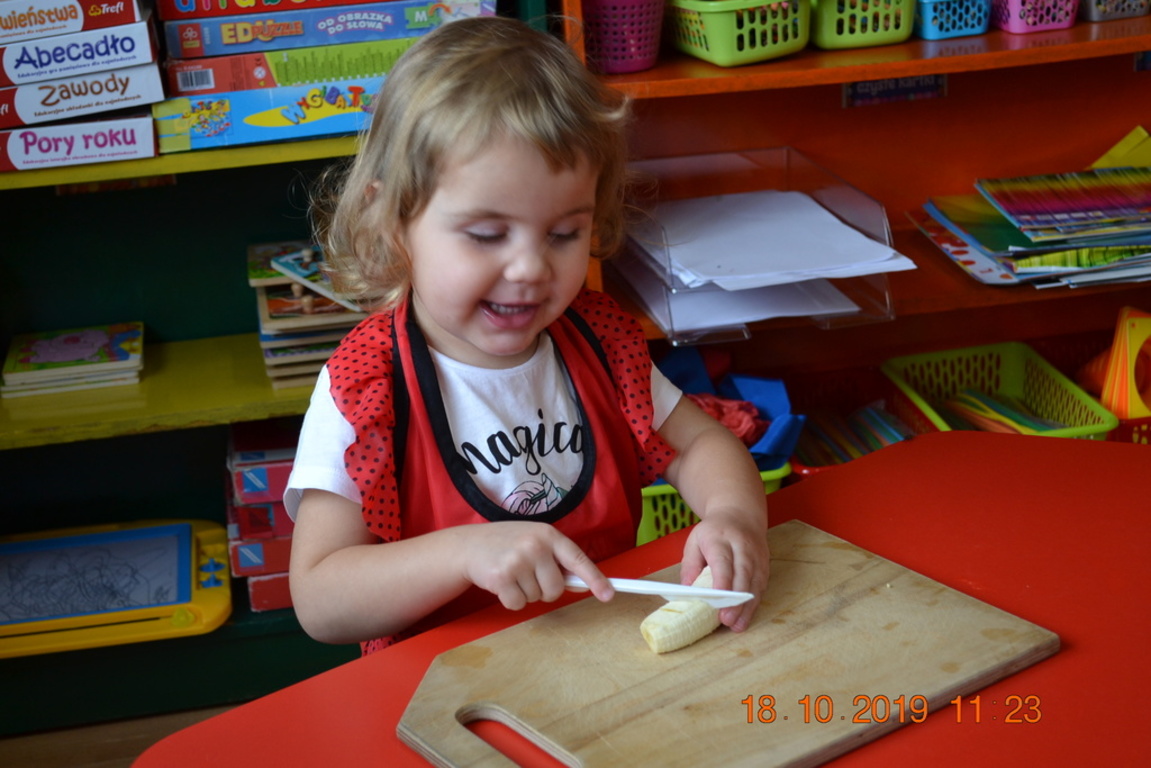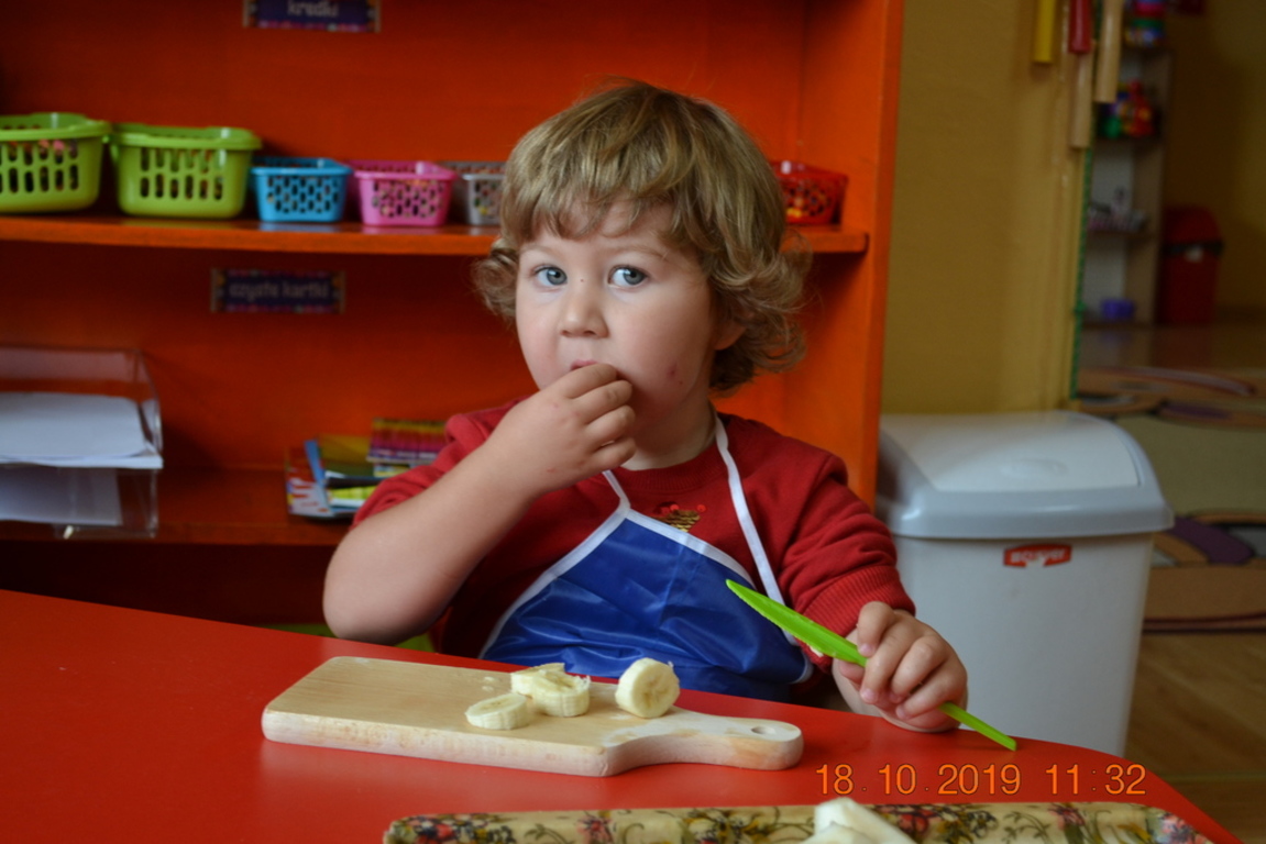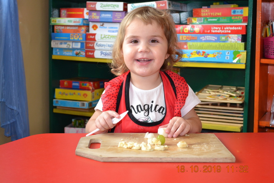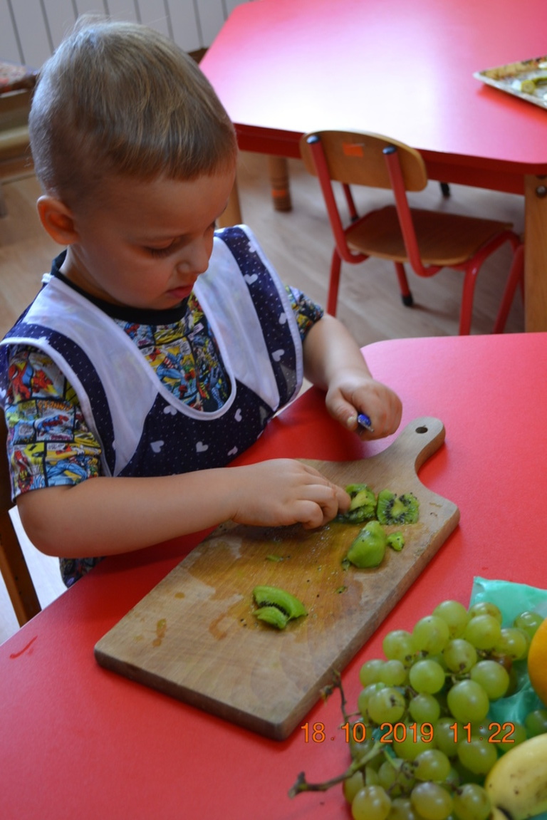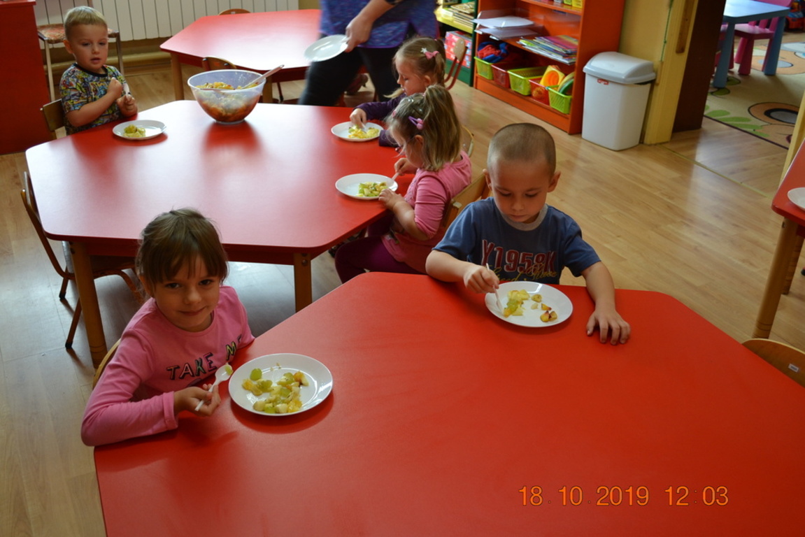 W piątek 18 października w oddziale przedszkolnym we Wrotkowie było przesmacznie, a przede wszystkim zdrowo! Przedszkolaki na zajęciach własnoręcznie przygotowały pyszną, witaminową sałatkę. Dzieci przyniosły z domów różne, świeże owoce. Były jabłka, gruszki, banany, śliwki, nektarynki, kiwi, pomarańcze, mandarynki, winogrona. Po przebraniu się w fartuszki oraz wyszorowaniu rączek, dzieci przystąpiły do pracy. Wszystkie owoce zostały porządnie umyte i obrane ze skórek. Dzieci samodzielnie kroiły wszystkie owoce przestrzegając zasad bezpieczeństwa przy posługiwaniu się nożem. Przygotowanie sałatki dało dzieciom wiele satysfakcji i radości. Sałatka udała się, była pyszna!