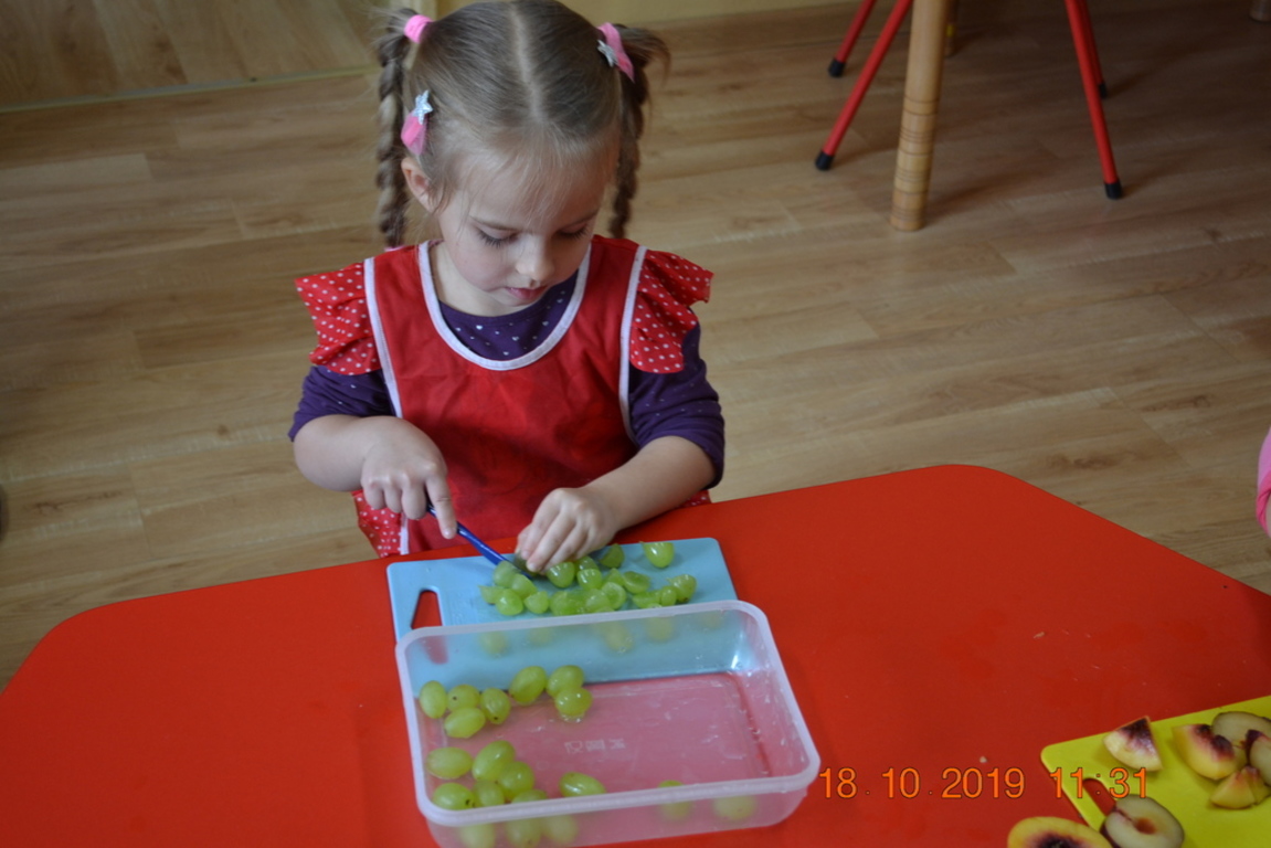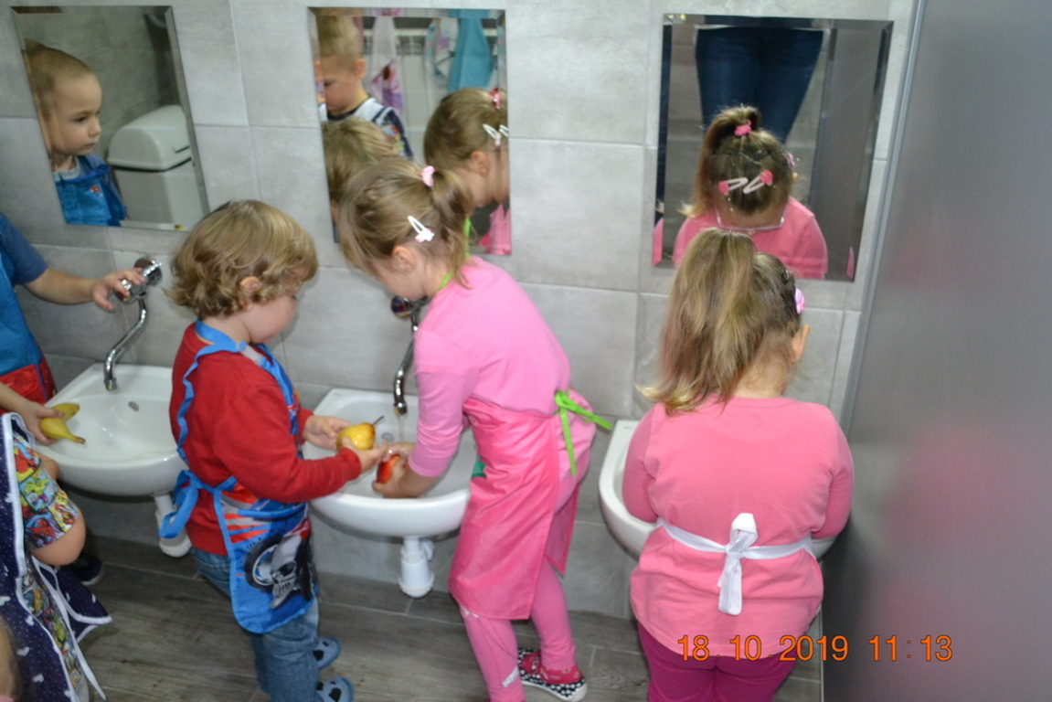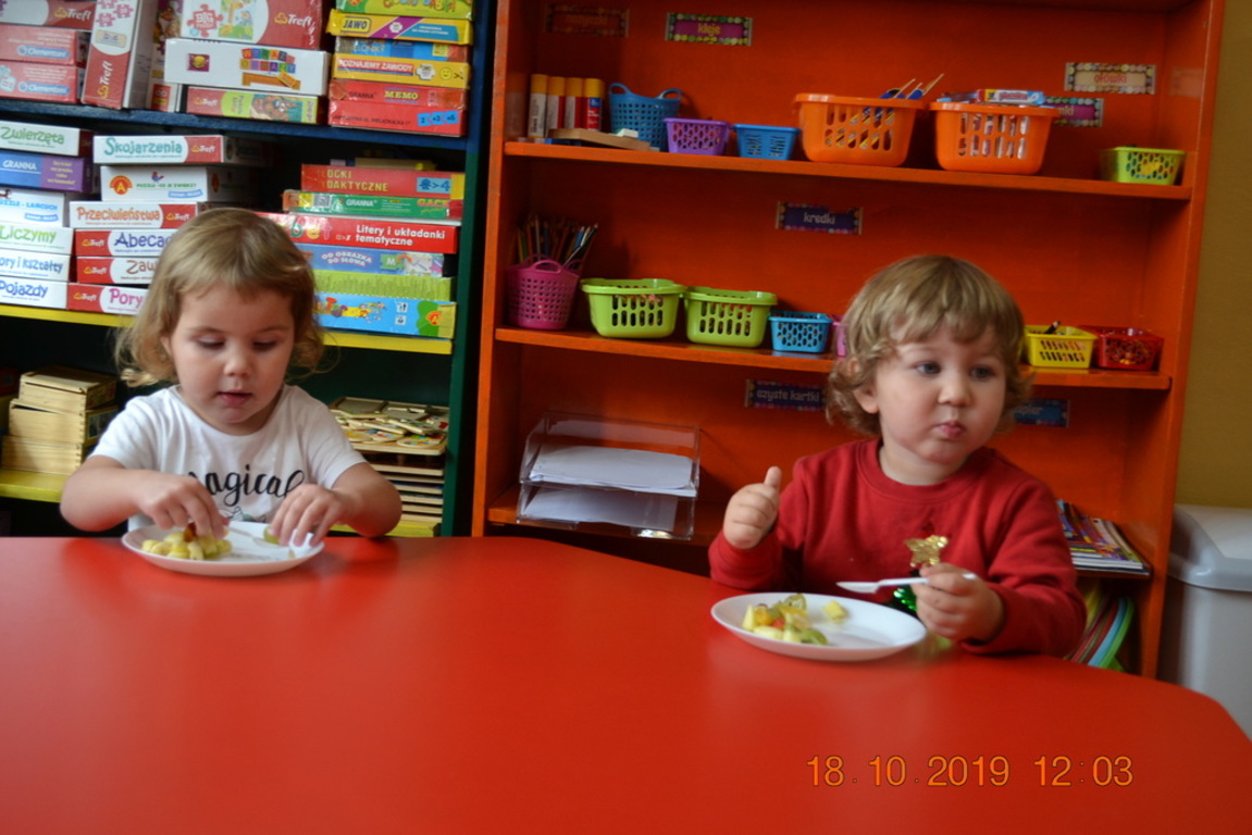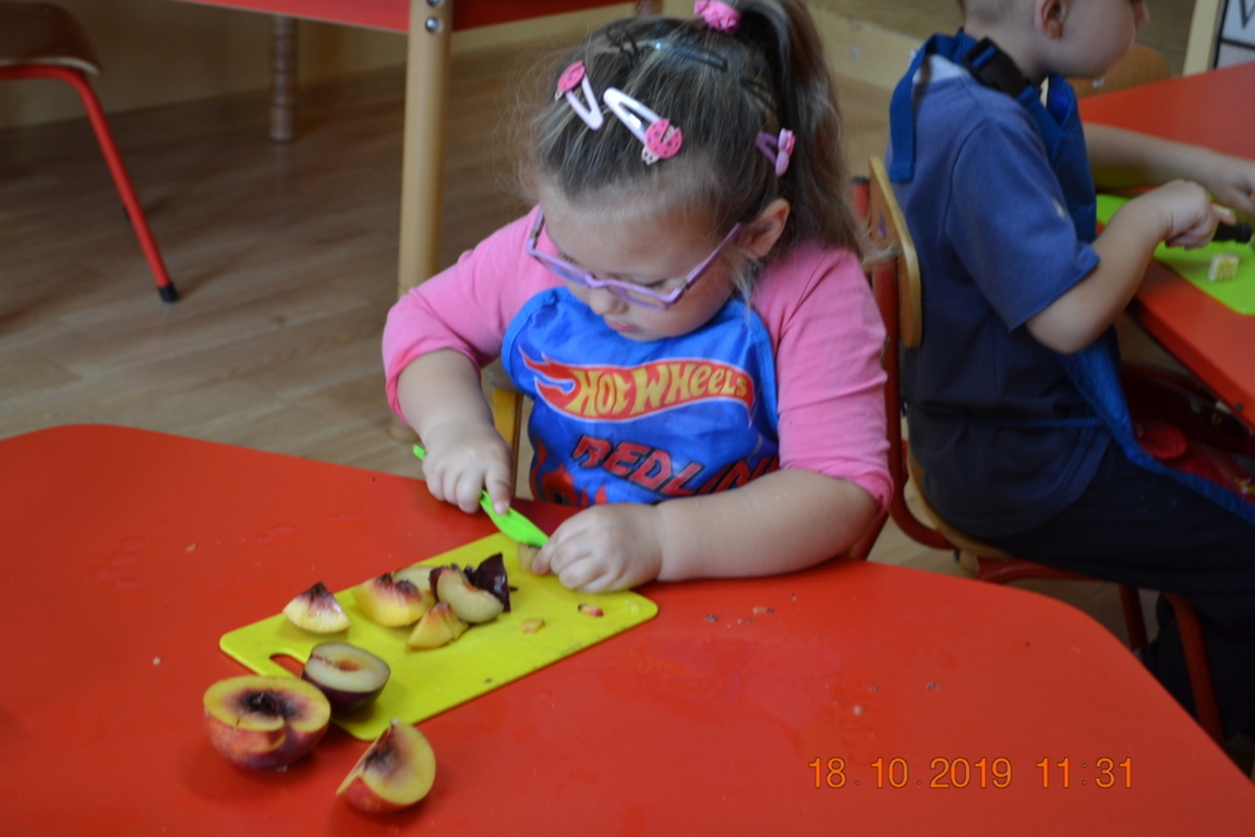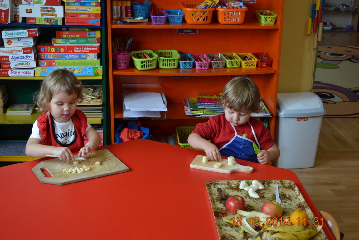 W piątek 18 października w oddziale przedszkolnym we Wrotkowie było przesmacznie, a przede wszystkim zdrowo! Przedszkolaki na zajęciach własnoręcznie przygotowały pyszną, witaminową sałatkę. Dzieci przyniosły z domów różne, świeże owoce. Były jabłka, gruszki, banany, śliwki, nektarynki, kiwi, pomarańcze, mandarynki, winogrona. Po przebraniu się w fartuszki oraz wyszorowaniu rączek, dzieci przystąpiły do pracy. Wszystkie owoce zostały porządnie umyte i obrane ze skórek. Dzieci samodzielnie kroiły wszystkie owoce przestrzegając zasad bezpieczeństwa przy posługiwaniu się nożem. Przygotowanie sałatki dało dzieciom wiele satysfakcji i radości. Sałatka udała się, była pyszna!
