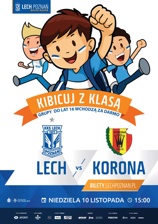 Uczniowie naszej szkoły mogą wziąć udział w akcji "Kibicuj z klasą" organizowanej przez klub Lech Poznań, w ramach której grupy dzieci i młodzieży do lat 16 wraz z dorosłymi opiekunami mogą bezpłatnie obejrzeć mecz LECH POZNAŃ - KORONA KIELCE na stadionie przy ulicy Bułgarskiej w Poznaniu. Mecz odbędzie się 10 listopada 2019 r. (niedziela) o godz. 15:00.