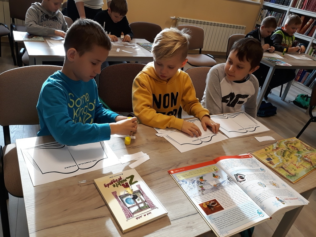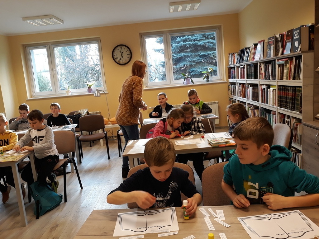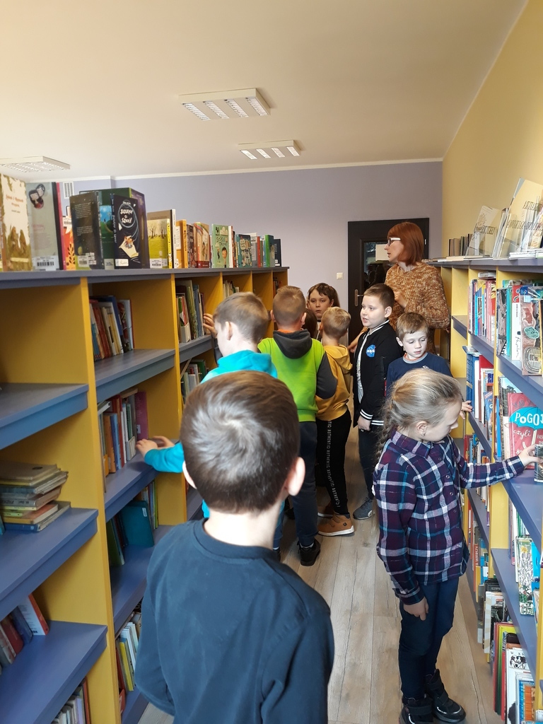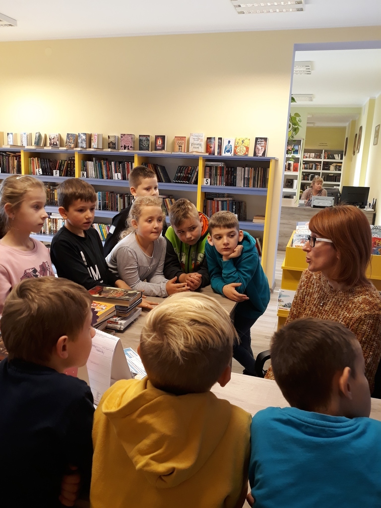 Z muzeum udaliśmy się do Biblioteki Publicznej Miasta i Gminy Koźmin Wlkp. Krótką historię tego miejsca przedstawiła nam p. Elżbieta Rychlik, kierownik koźmińskiej książnicy. Następnie zwiedziliśmy bibliotekę i dowiedzieliśmy się wiele praktycznych rzeczy związanych z wypożyczaniem książek i funkcjonowaniem czytelni. Mieliśmy też okazję oglądać bogaty księgozbiór dziecięcy. W czytelni wzięliśmy udział w przygotowanej przez panią bibliotekarkę lekcji na temat drogi książki od autora do czytelnika. Na zakończenie przedstawiliśmy pracownikom biblioteki krótkie przedstawienie pt. „Na niezgodę życia szkoda”.
