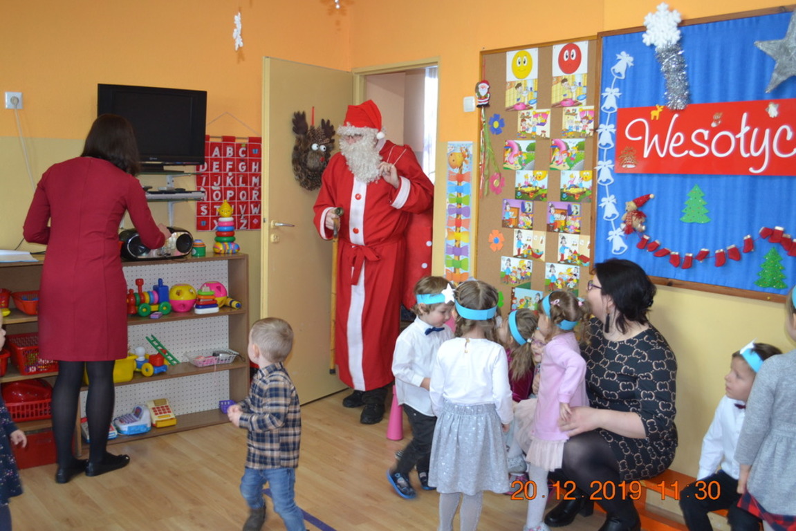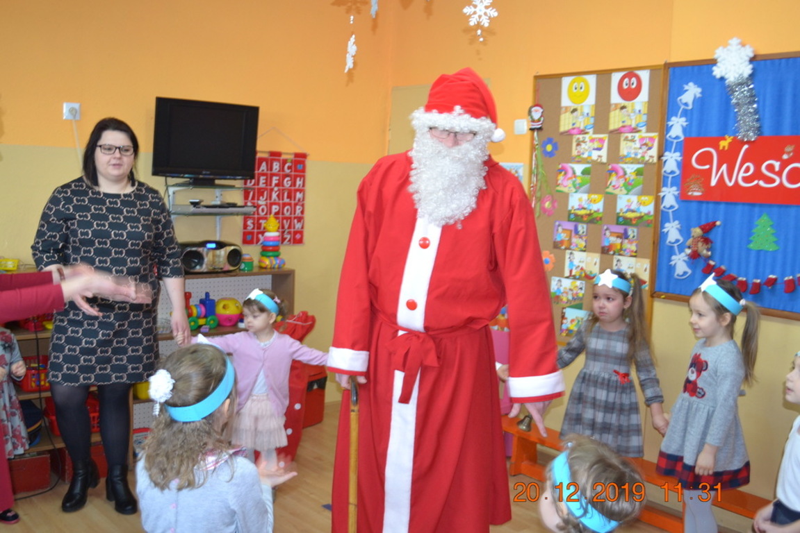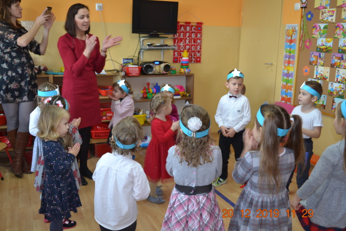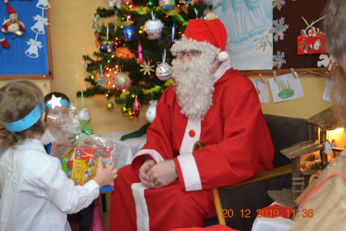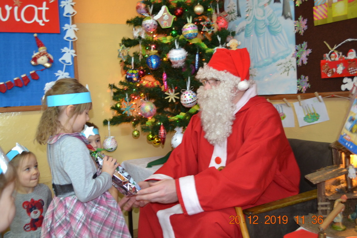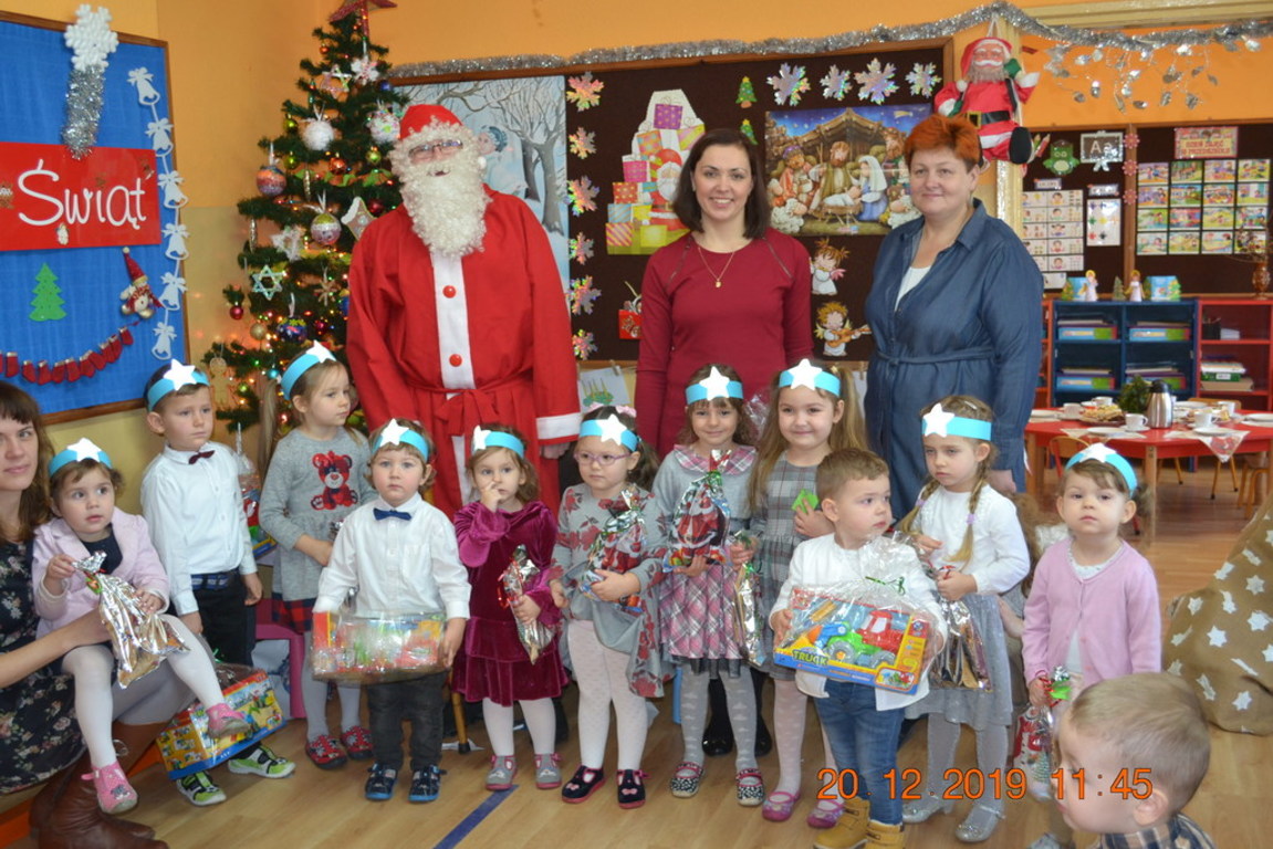 Podniosłym momentem spotkania był program artystyczny w wykonaniu naszych przedszkolaków. Dzieci z zaangażowaniem śpiewały utwory o tematyce świątecznej, tańczyły, recytowały wierszyki oraz zaprosiły przybyłych gości do wspólnego kolędowania. Dużo pozytywnych emocji wywołała wizyta wyjątkowego, najważniejszego dla przedszkolaków gościa – Świętego Mikołaja, który podarował każdemu dziecku upominek. Wydarzenie pozwoliło wszystkim na chwilę poczuć atmosferę zbliżających się Świąt Bożego Narodzenia.
