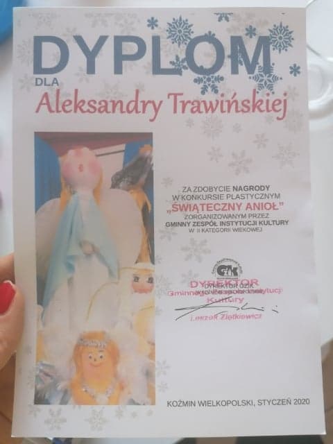 Ola T. z klasy III naszej szkoły zdobyła wyróżnienie w konkursie plastycznym "Świąteczny Anioł" zorganizowanym przez Gminny Ośrodek Kultury w Koźminie Wlkp.
