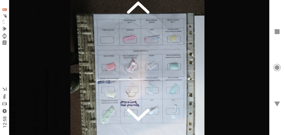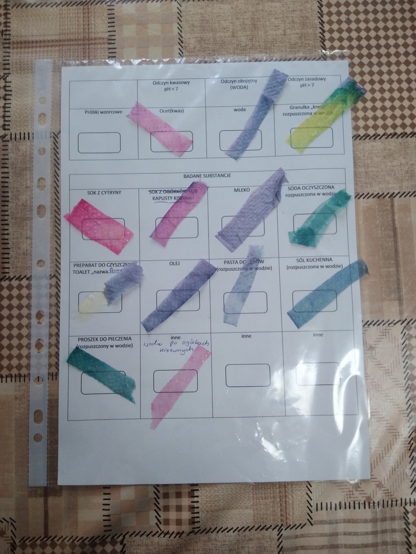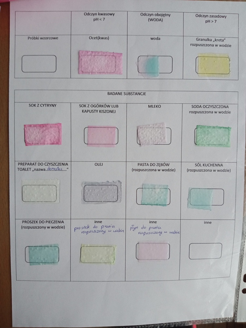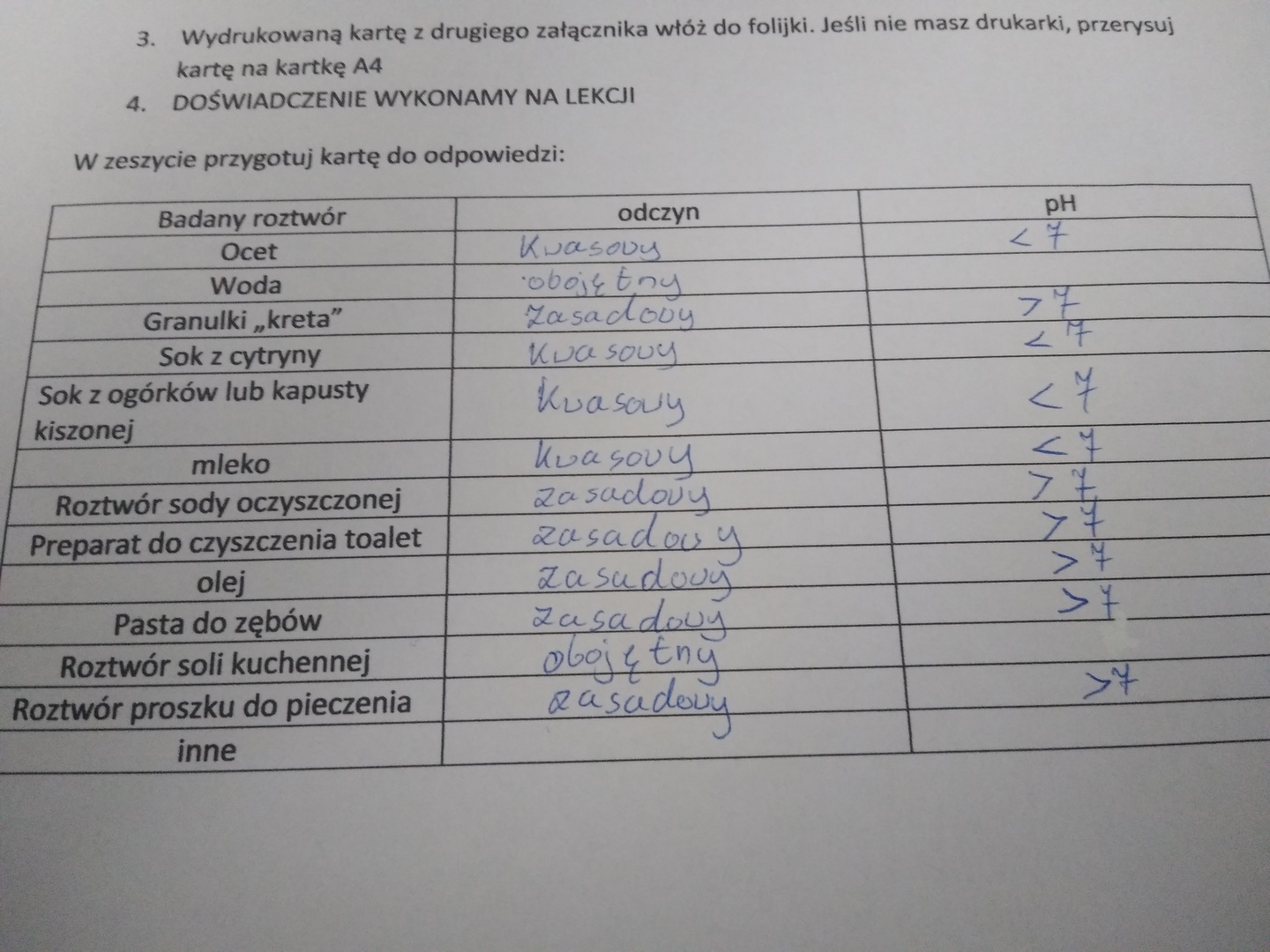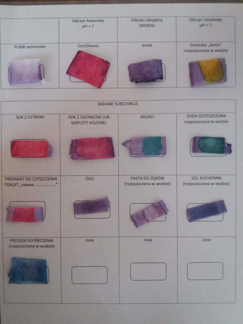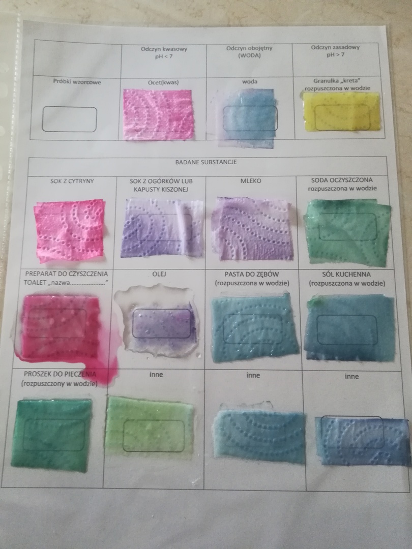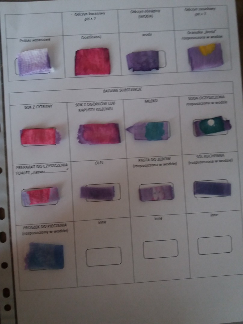 Uczniowie klasy ósmej w ramach zdalnego nauczania chemii, przeprowadzili doświadczenie – badanie odczynu roztworów, sporządzonych z domowych produktów. Określali pH tych roztworów za pomocą wykonanych przez siebie „papierków wskaźnikowych” nasączonych wywarem z czerwonej kapusty. Pięknie wykonane prace prezentujemy na załączonych zdjęciach.
