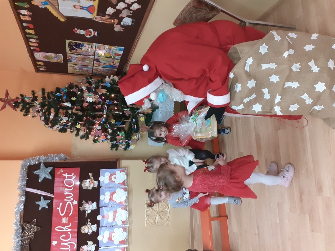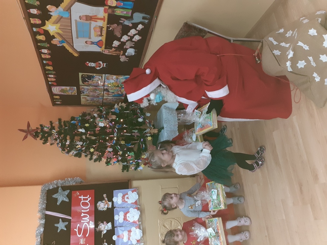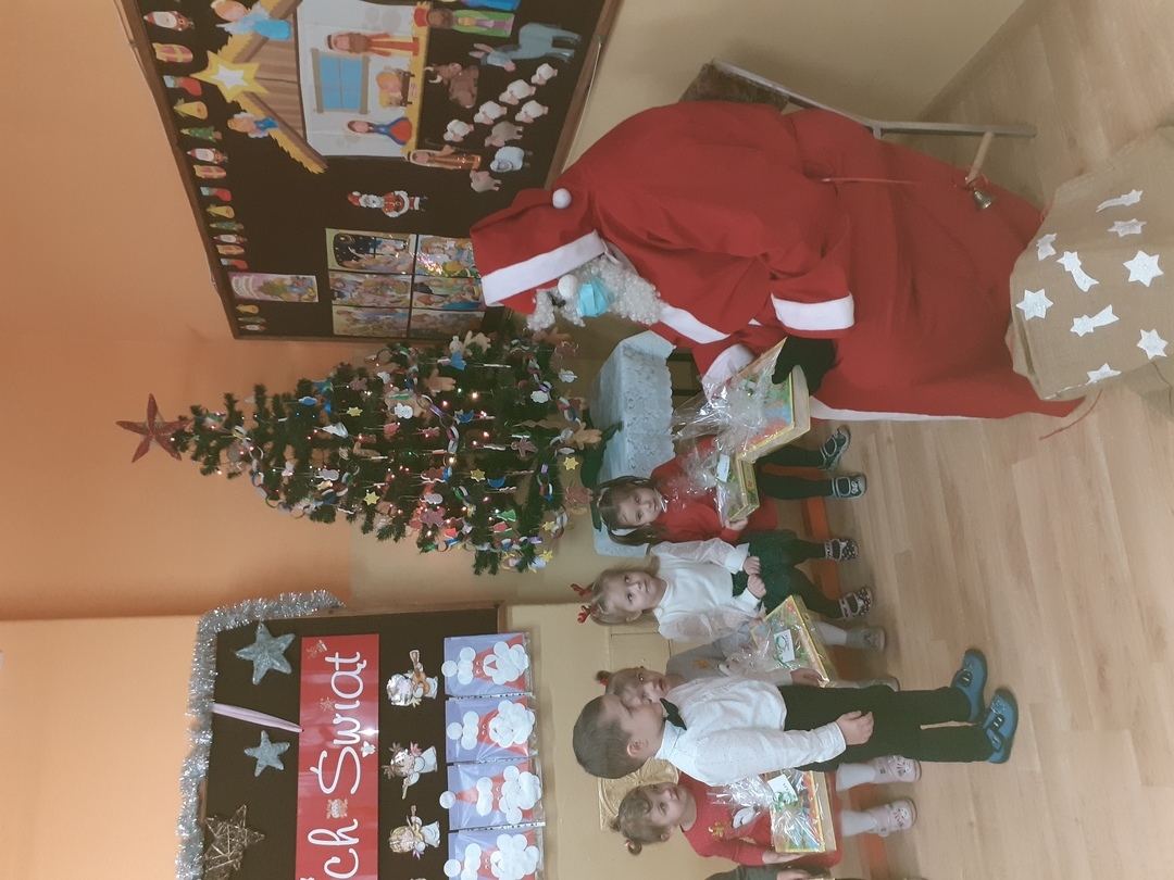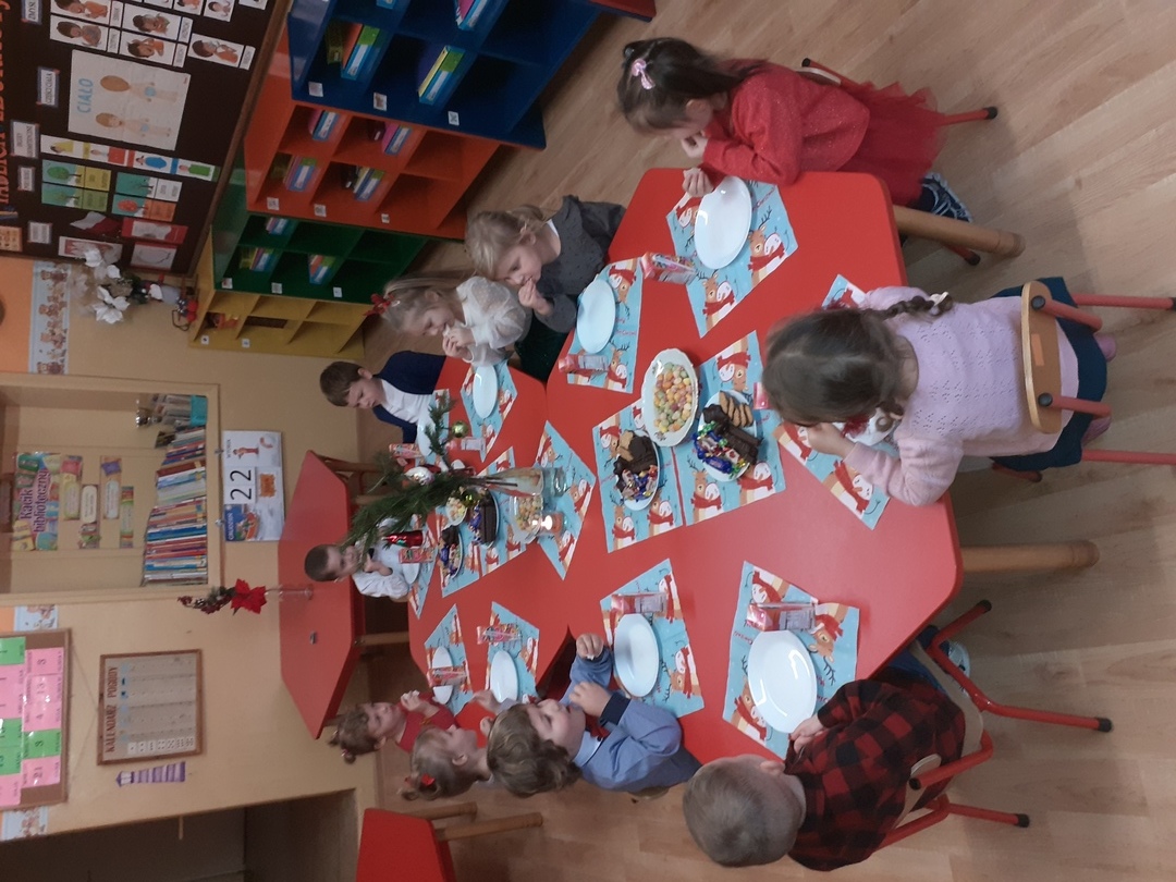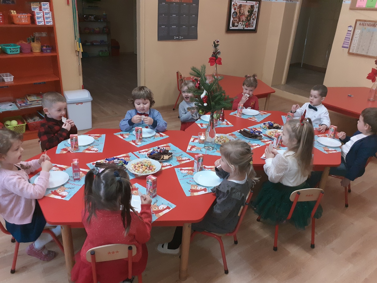 Tego dnia zapanował w przedszkolu świąteczny nastrój. Wspaniałym momentem było dzielenie się opłatkiem, składanie sobie świątecznych życzeń i słuchanie kolęd. Cała uroczystość przebiegła w bardzo miłej atmosferze, wywołała radość i uśmiech na twarzach dzieci. Dzień ten na długo pozostanie w pamięci wszystkich dzieci.