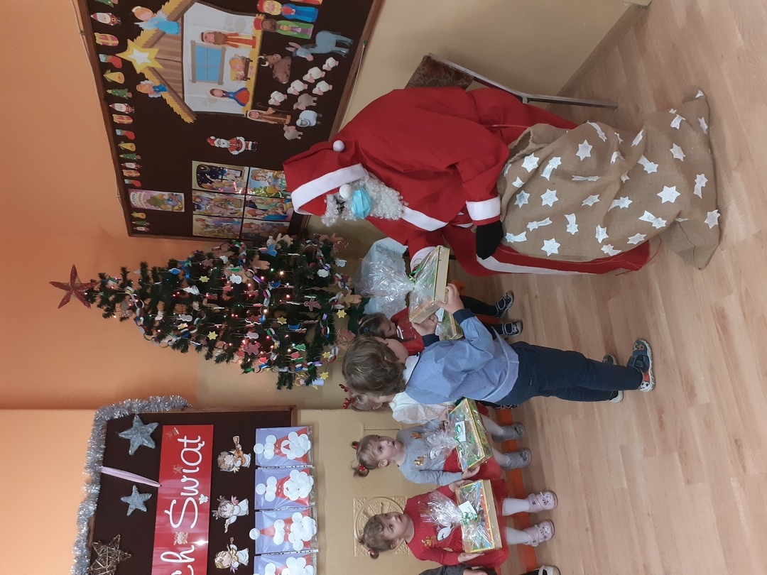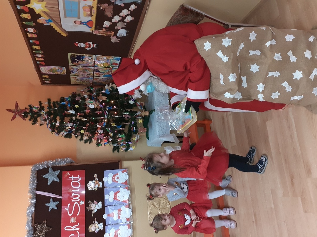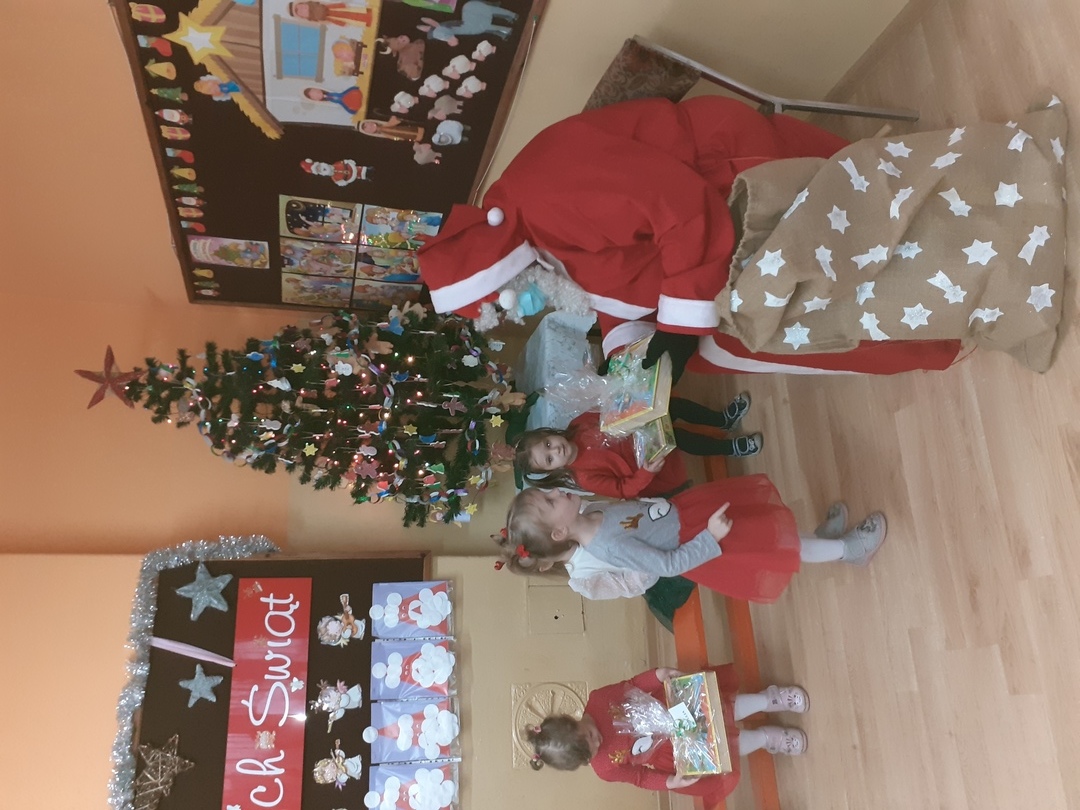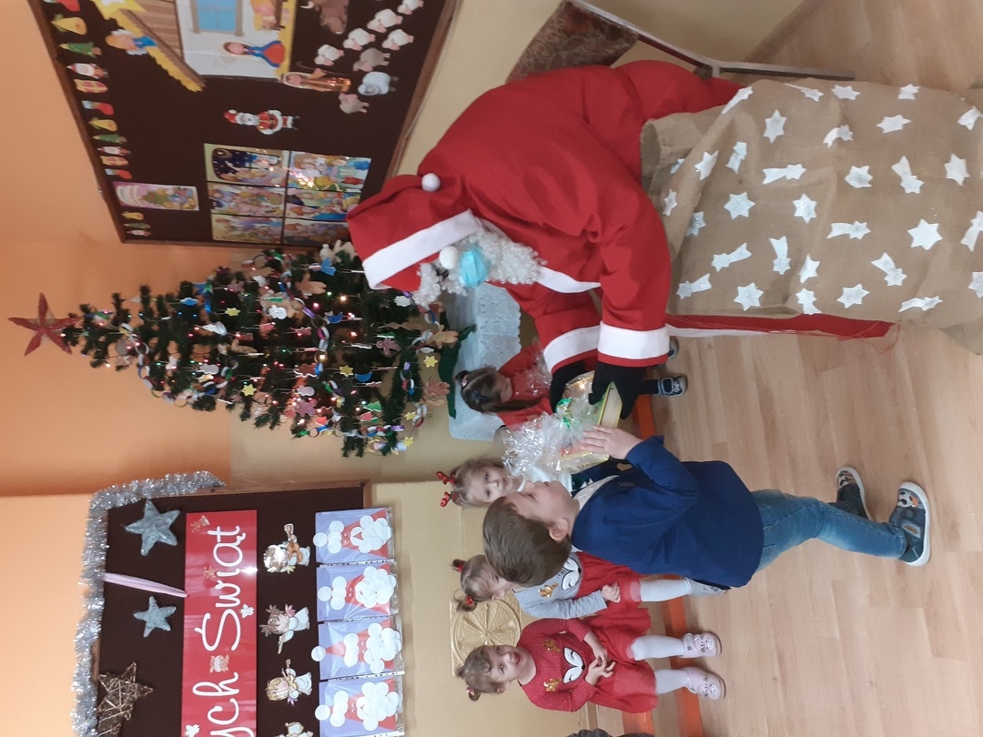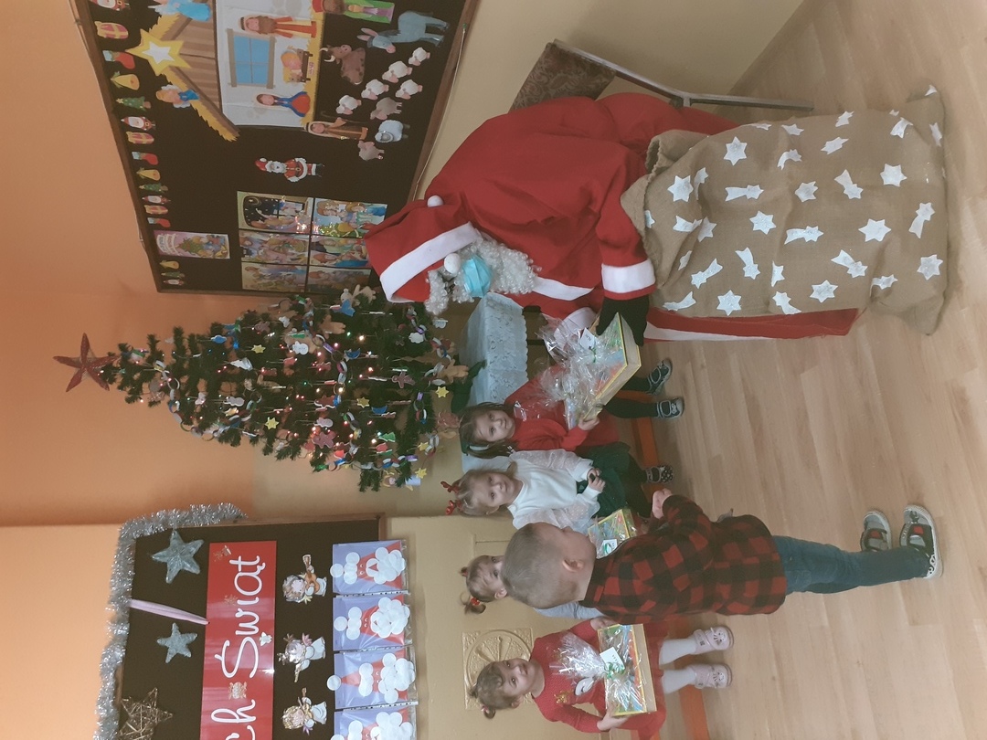 Tego dnia zapanował w przedszkolu świąteczny nastrój. Wspaniałym momentem było dzielenie się opłatkiem, składanie sobie świątecznych życzeń i słuchanie kolęd. Cała uroczystość przebiegła w bardzo miłej atmosferze, wywołała radość i uśmiech na twarzach dzieci. Dzień ten na długo pozostanie w pamięci wszystkich dzieci.