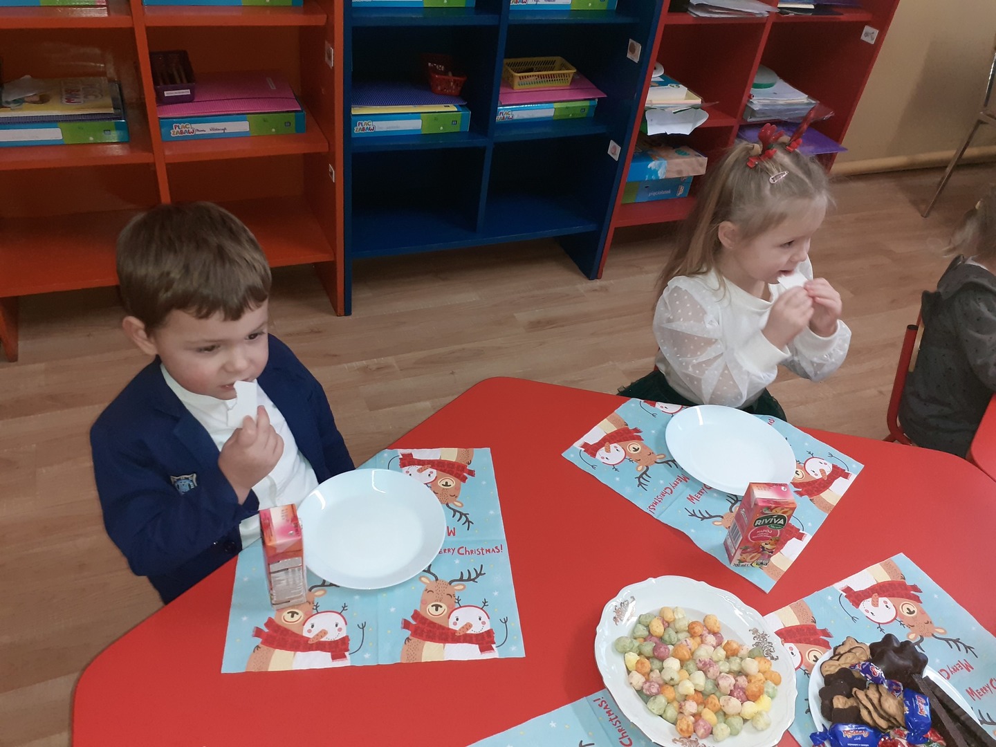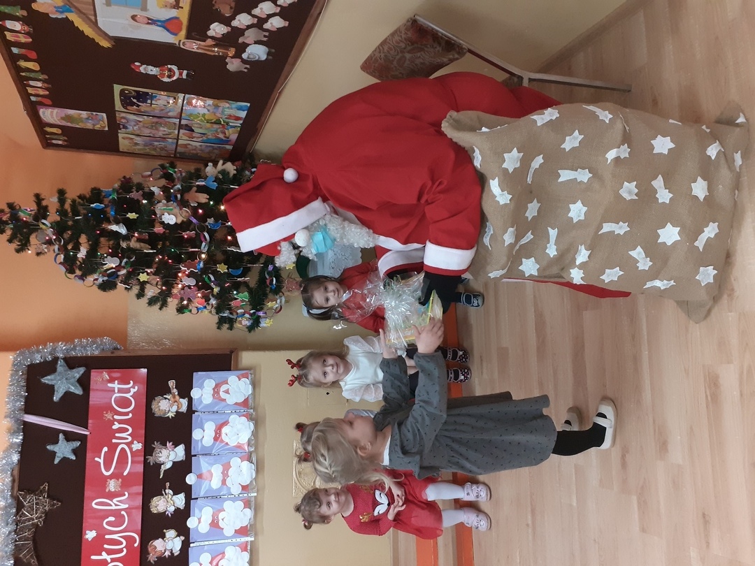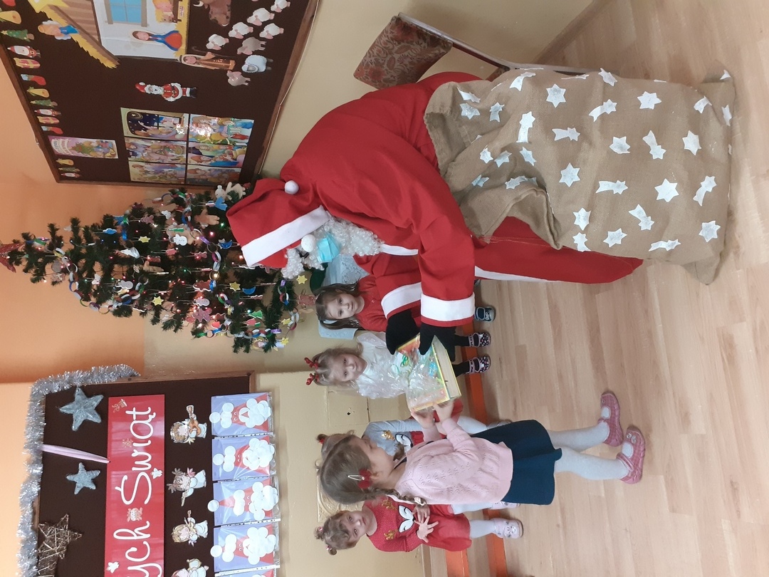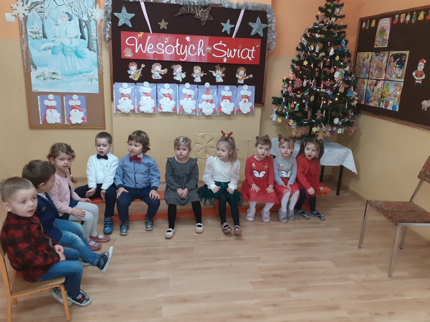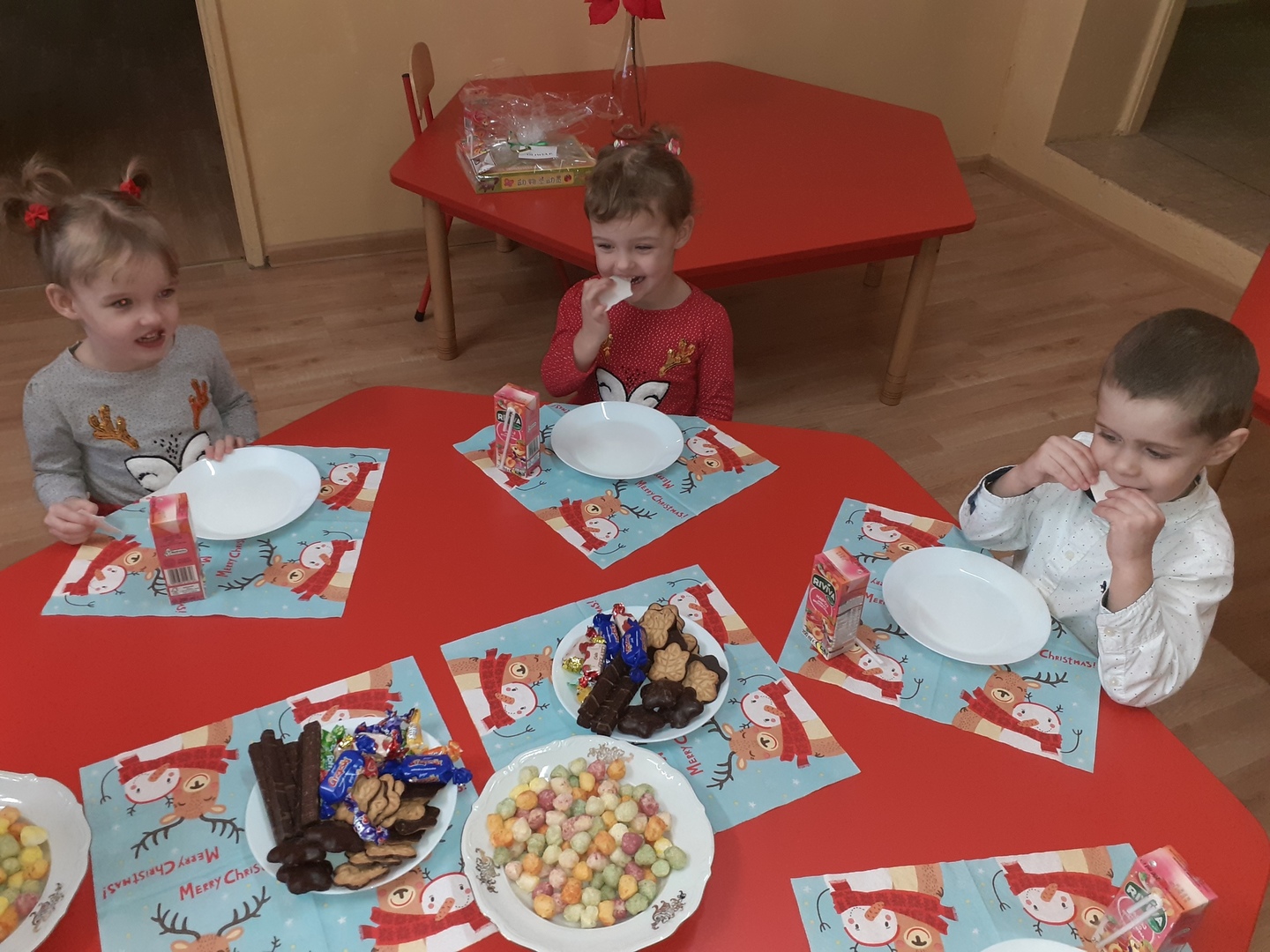 Tego dnia zapanował w przedszkolu świąteczny nastrój. Wspaniałym momentem było dzielenie się opłatkiem, składanie sobie świątecznych życzeń i słuchanie kolęd. Cała uroczystość przebiegła w bardzo miłej atmosferze, wywołała radość i uśmiech na twarzach dzieci. Dzień ten na długo pozostanie w pamięci wszystkich dzieci.
