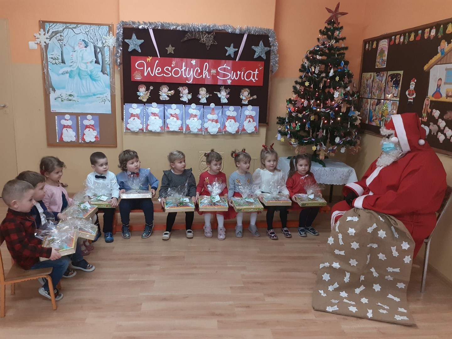 Gwiazdor lubi odwiedzać dzieci w każdym miejscu na całym świecie. Dnia 22 grudnia 2020r. z workiem pełnym prezentów przybył również do naszego przedszkola. Wszystkie dzieci już od samego rana wyczekiwały wyjątkowego gościa. Kiedy usłyszały dzwonek do drzwi, wiedziały, że to na pewno on. Dzieci powitały Gwiazdora oklaskami i piosenką. Przedszkolaki były bardzo szczęśliwe, rozpromienione, a kiedy znalazły się blisko Gwiazdora – troszkę zawstydzone. Oprócz pełnego prezentów worka Gwiazdor przywiózł ze sobą dużo uśmiechu. Rozmawiał z dziećmi, zachęcał je, aby były grzeczne, słuchały rodziców i pań w przedszkolu. Na zakończenie Gwiazdor wszystkim przedszkolakom osobiście wręczył prezenty.