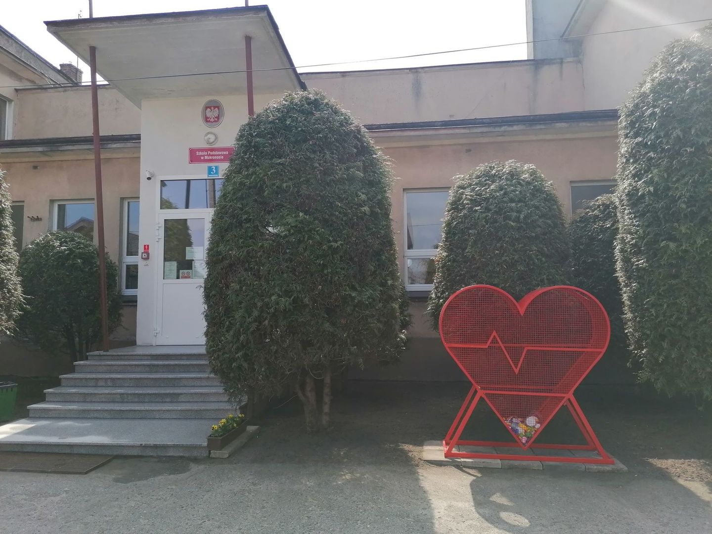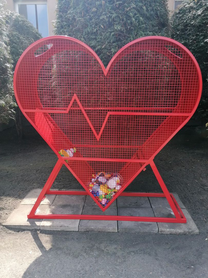 W ostatnim czasie przy wejściu głównym do budynku szkoły stanęło piękne, metalowe, czerwone serce na plastikowe nakrętki.