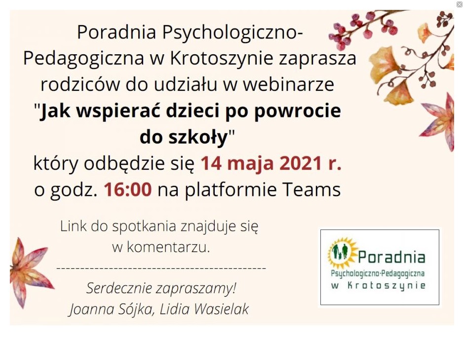 Poradnia Psychologiczno - Pedagogiczna w Krotoszynie zaprasza rodziców do udziału w webinarze "Jak wspierać dzieci po powrocie do szkoły" :