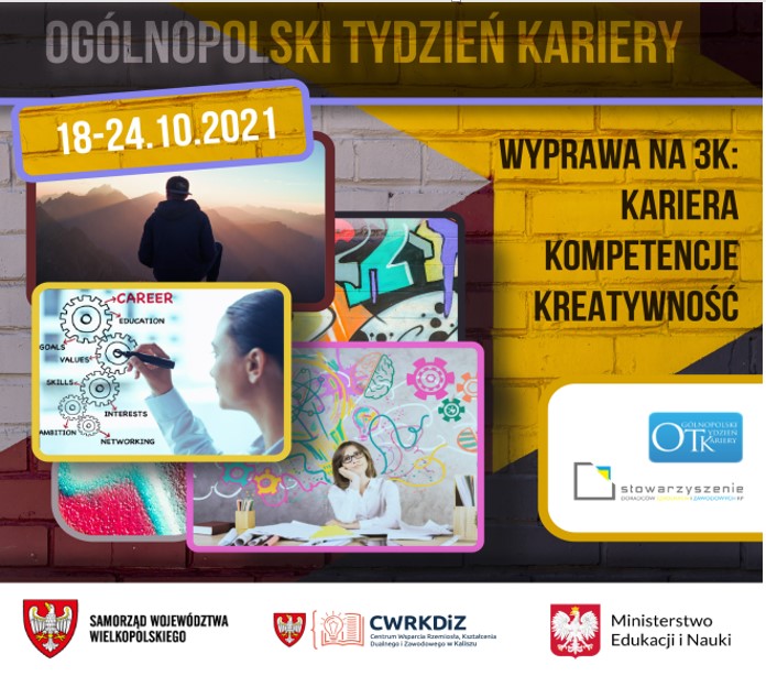 W ramach Ogólnopolskiego Tygodnia Kariery, który trwa od 18 - 24 października 2021 r. pod hasłem: Wyprawa na 3K: Kariera, Kompetencje, Kreatywność Centrum Wsparcia Rzemiosła, Kształcenia Dualnego i Zawodowego w Kaliszu zaprasza do udziału w konkursach z zakresu doradztwa zawodowego: