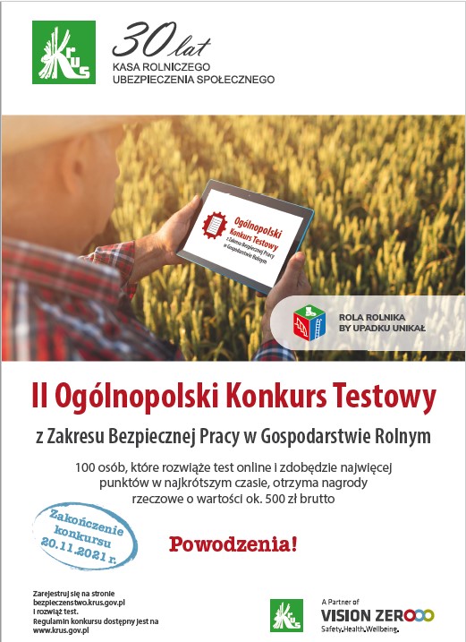 Ogólnopolski Konkurs Testowy z zakresu bezpiecznej pracy w gospodarstwie rolnym przesłany przez Kasę Rolniczego Ubezpieczenia Rolniczego w Krotoszynie - szczegóły na plakacie.
