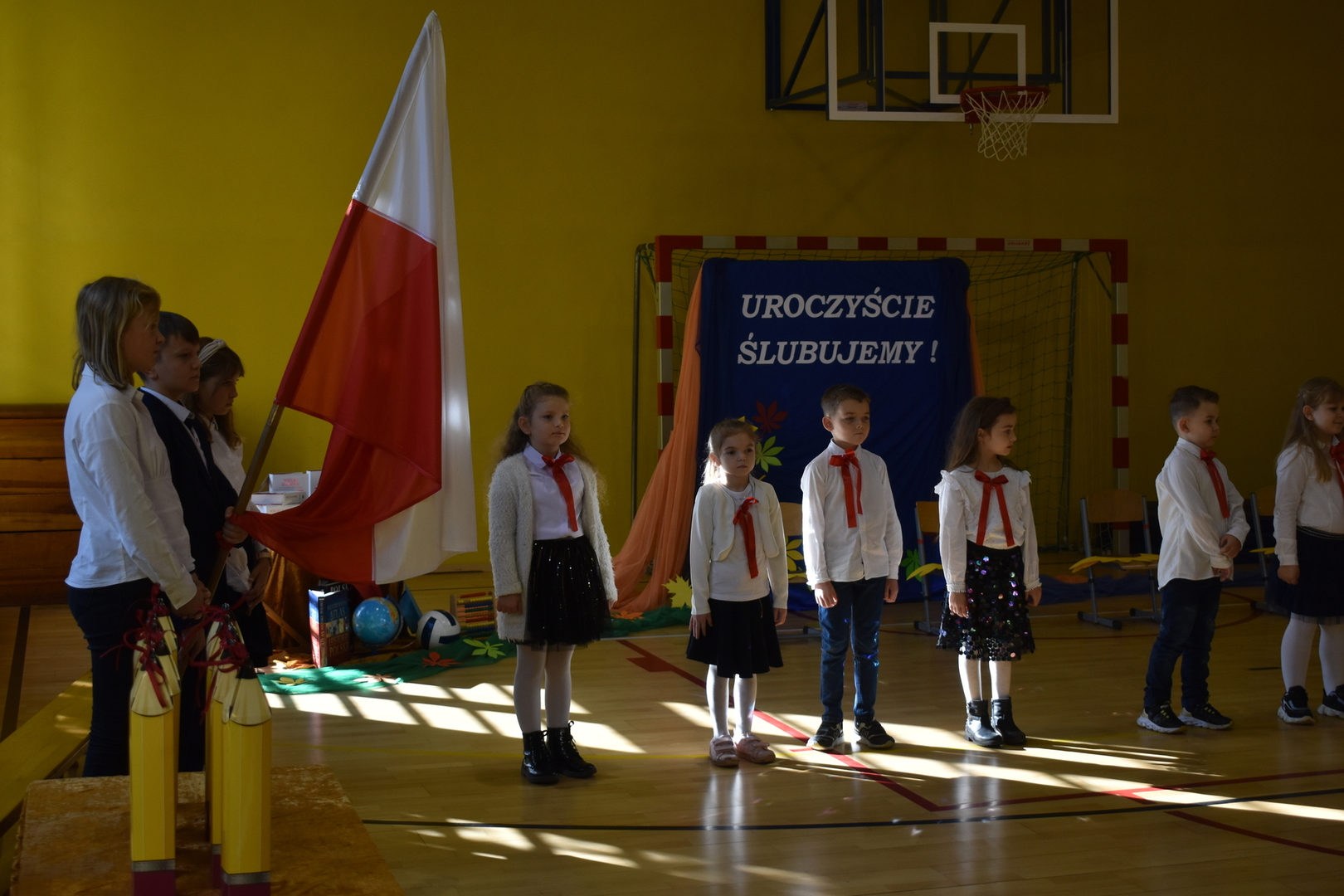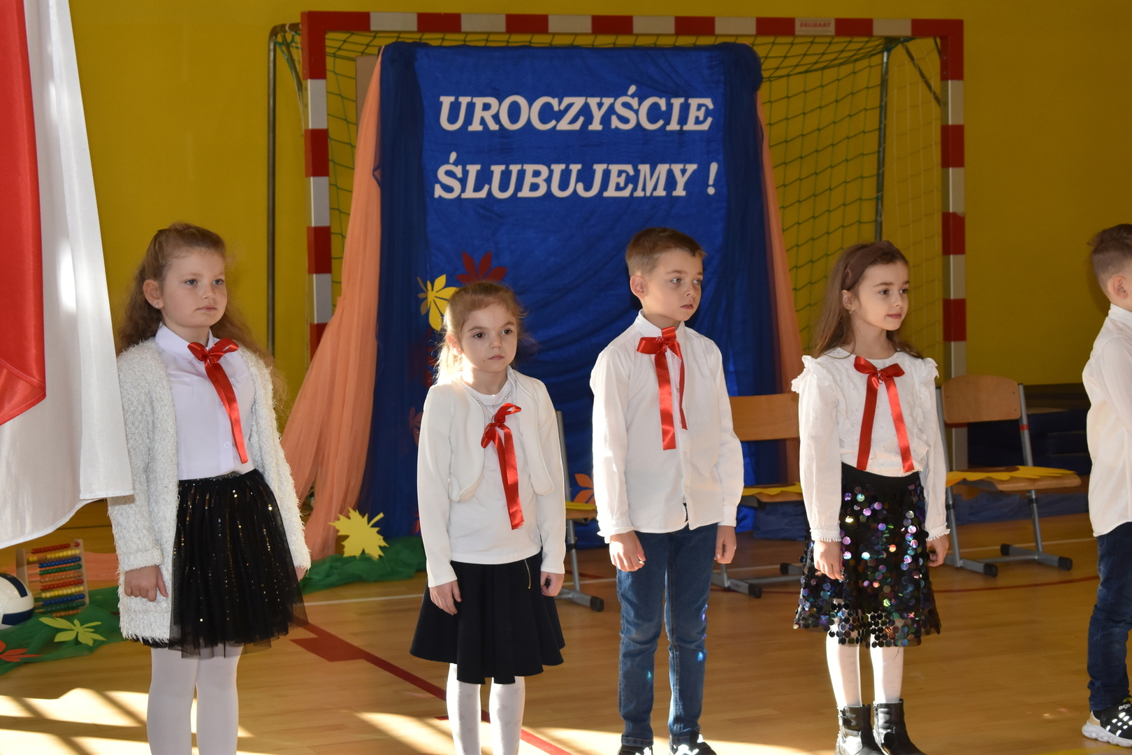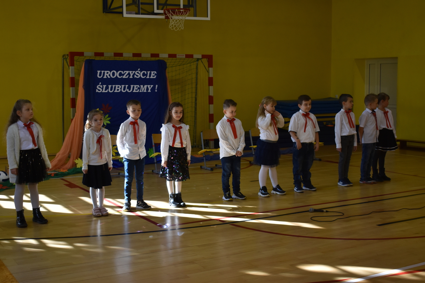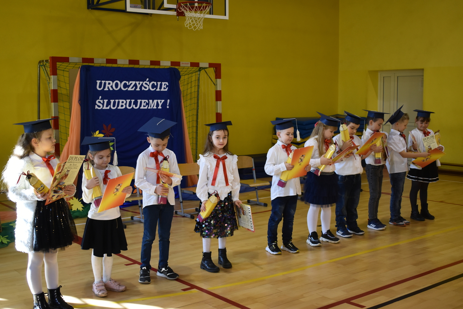 Dnia 28 października br. odbyło się w naszej szkole pasowanie klasy pierwszej. Grupa dziesięciu pierwszaków została włączona w poczet uczniów. Zanim jednak nasi najmłodsi uczniowie zostali oficjalnie przyjęci w szeregi społeczności szkolnej, zaprosili swoich rodziców na występ, który specjalnie przygotowali na tą wyjątkową okazję. Podczas uroczystości dzieci zaprezentowały swój dorobek artystyczny. Uczniowie zachwycili nie tylko swoimi umiejętnościami, ale również naturalnością, spontanicznością i ekspresją. Radośnie zaśpiewane piosenki, z przejęciem recytowane wiersze, wspaniałe tańce sprawiły, że na twarzach najbliższych pojawił się uśmiech i zadowolenie. Po części artystycznej nastąpił najważniejszy i niezwykle doniosły moment uroczystości, jakim było złożenie przez dzieci uroczystego ślubowania. Uczniowie z wielką powagą powtarzali za panią dyrektor tekst ślubowania mówiący o sumienności, pracowitości, szacunku i odpowiedzialności. Następnie pani dyrektor Alina Rączka dokonała aktu pasowania. Każdy uczeń otrzymał pamiątkowy dyplom. Rodzice obdarowali swe pociechy ołówkiem wypełnionym po brzegi słodkościami. Dla upamiętnienia tego wspaniałego wydarzenia pierwszaki pozowały do pamiątkowych zdjęć. Ostatnim, miłym akcentem tego wyjątkowego dnia był słodki poczęstunek zorganizowany przez rodziców w Sali Wiejskiej w Mokronosie. Ogromny tort wystarczył dla wszystkich ucztujących. Naszym najmłodszym uczniom życzymy sukcesów, wytrwałości w zdobywaniu wiedzy oraz tego, by nauka była dla nich inspiracją do odkrywania swoich talentów. Niech szkoła będzie dla nich miejscem zdobywania wiedzy i budowania relacji rówieśniczych. Oby zawsze mogły uczyć się w szkole, gdzie nie ma zagubionych, smutnych i odrzuconych. I gdzie pandemia będzie tylko odległą historią!