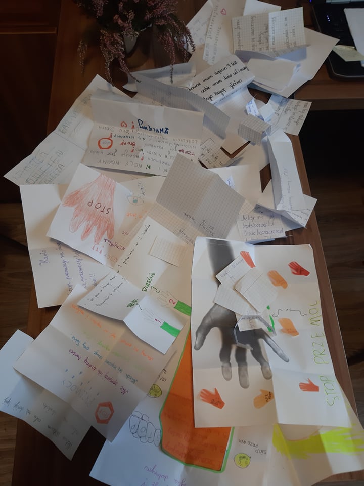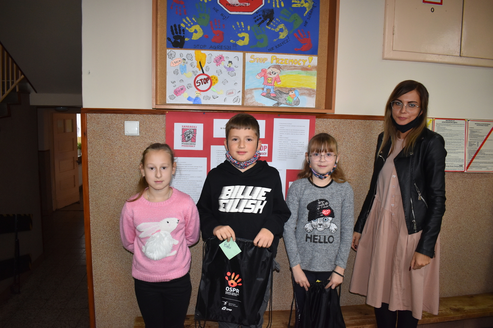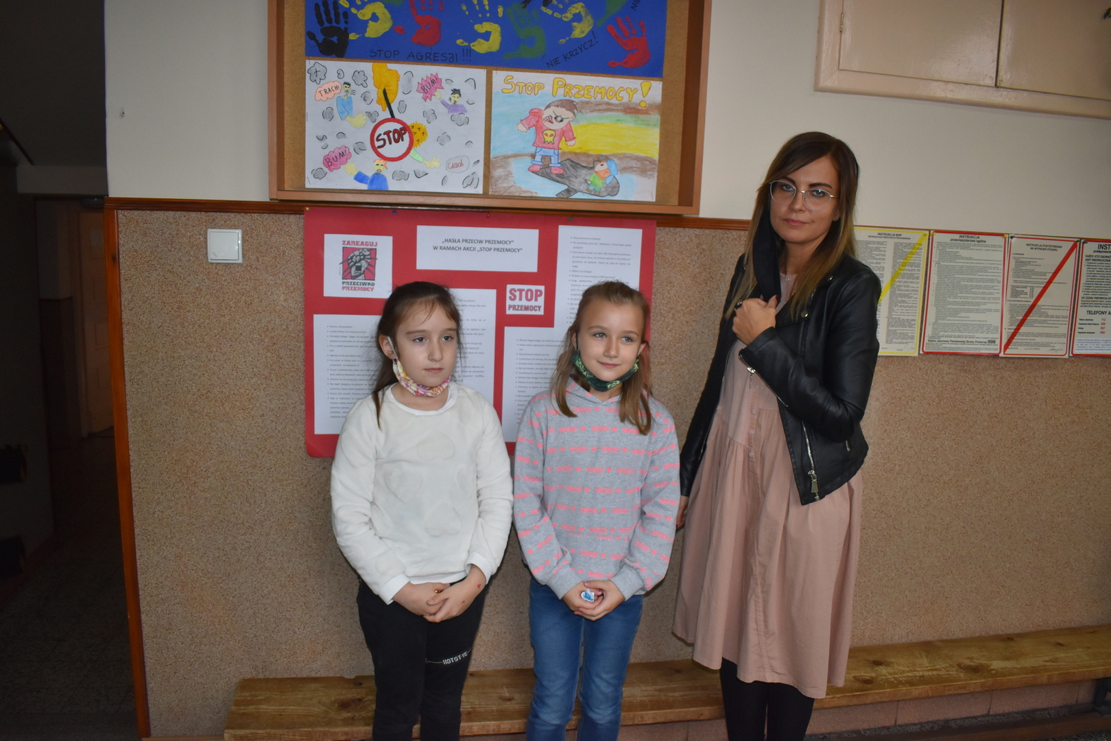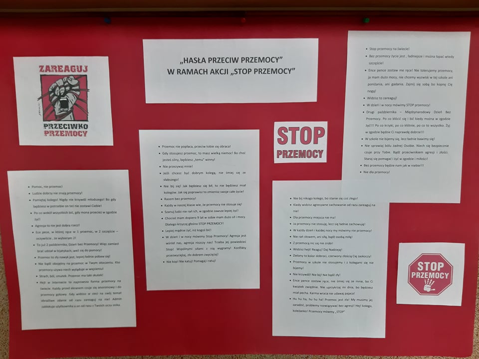 W związku z tym od 4 października zostały przeprowadzone w klasach pogadanki na temat przemocy oraz została zorganizowana akcja pt. „HASŁO PRZECIW PRZEMOCY’.Uczniowie mieli za zadanie wymyślić hasło lub rymowankę przeciw przemocy.