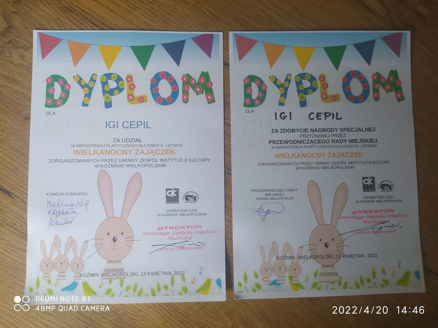 Iga Cepil z oddziału 6-latków zdobyła nagrodę specjalną Przewodniczącego Rady Miejskiej w warsztatach plastycznych dla dzieci 6-letnich "WIELKANOCNY ZAJĄCZEK" organizowanych przez Gminny Zespół Instytucji Kultury w Koźminie Wlkp.
