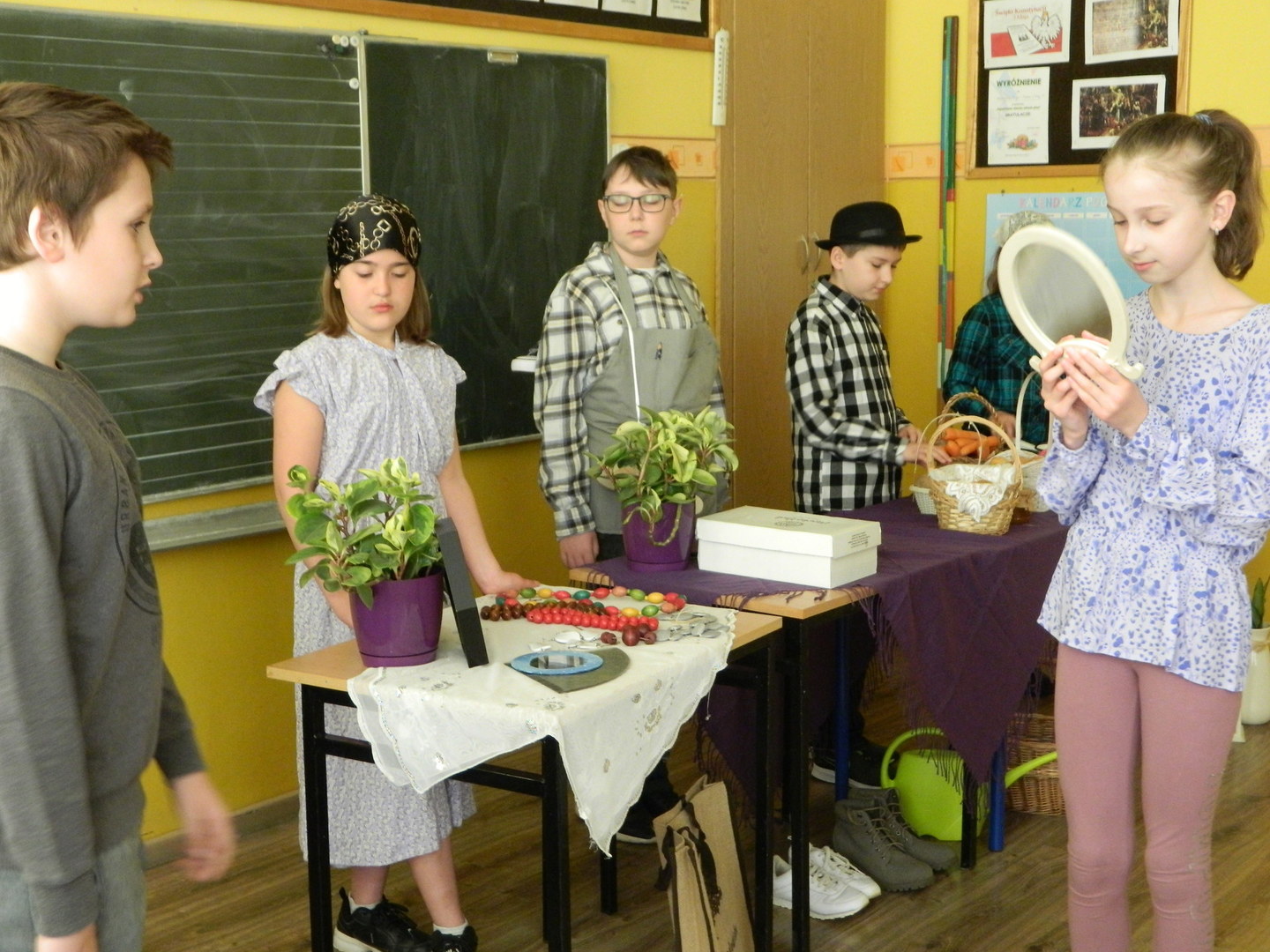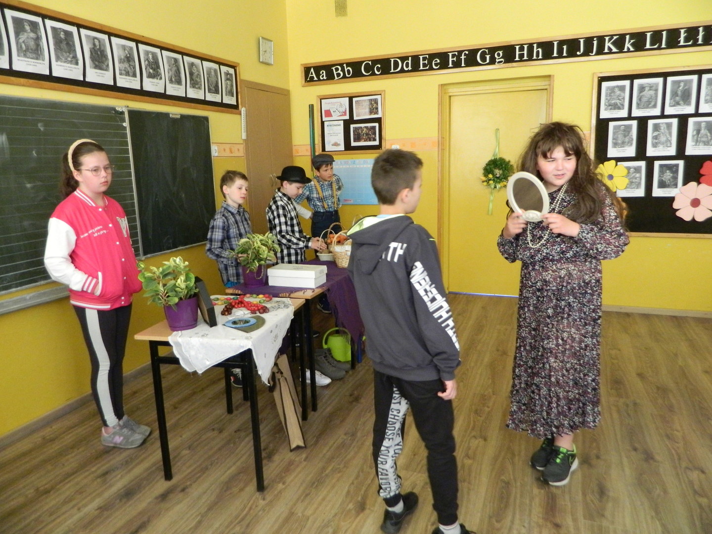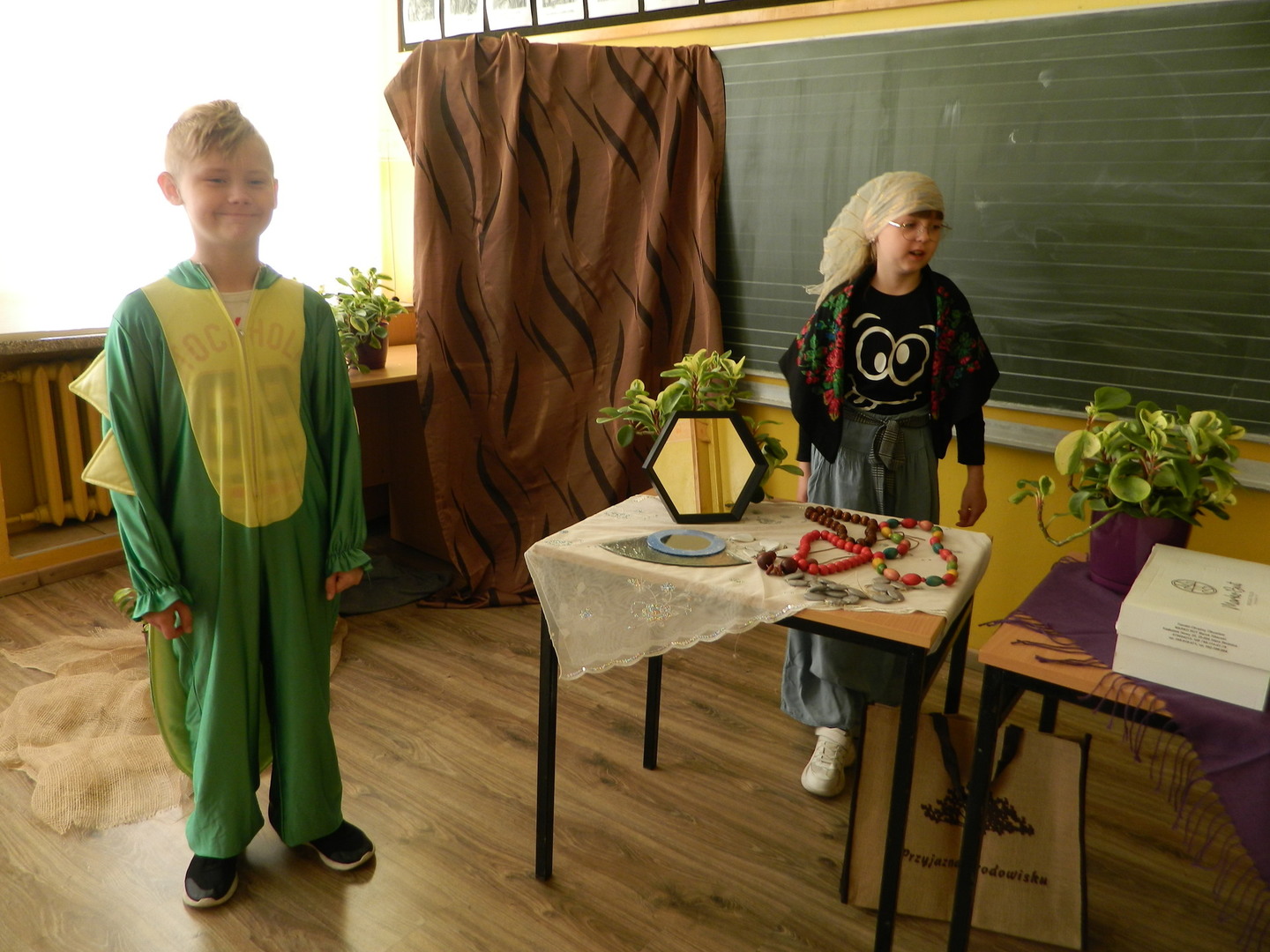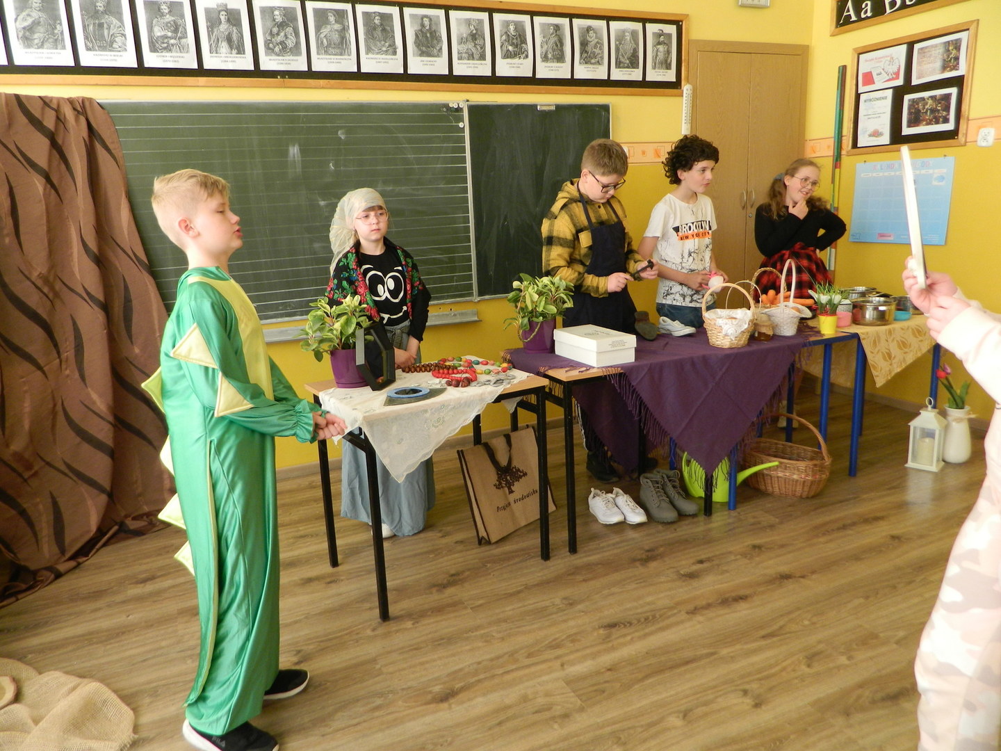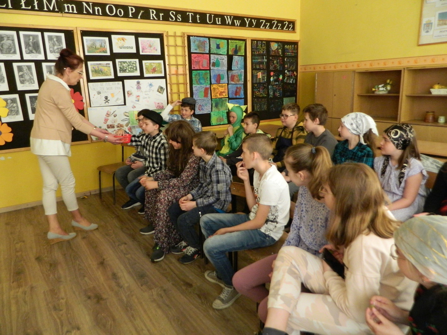 Środa, 4 maja, okazała się dniem pełnym wrażeń zwłaszcza dla uczniów klasy IV, którzy mogli pochwalić się swoimi aktorskimi umiejętnościami. Z wielkim zaangażowaniem podjęli dodatkowe zadanie przedstawienia historii „Bazyliszka” w oparciu o tekst omawiany na lekcji j. polskiego. Uczniowie przygotowali odpowiednie rekwizyty i stroje (wg własnego pomysłu). Doskonale wcielali się w swoje role, pokazując, że „życie i teatr” mogą się pięknie przeplatać w naszej szkolnej rzeczywistości. Młodzi aktorzy zostali docenieni słodkim upominkiem otrzymanym od p. Dyrektor.