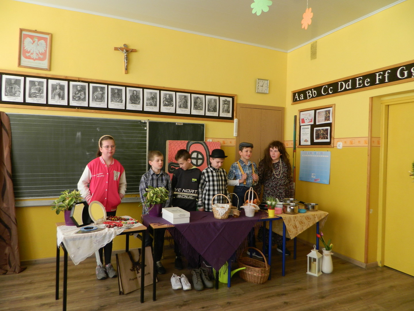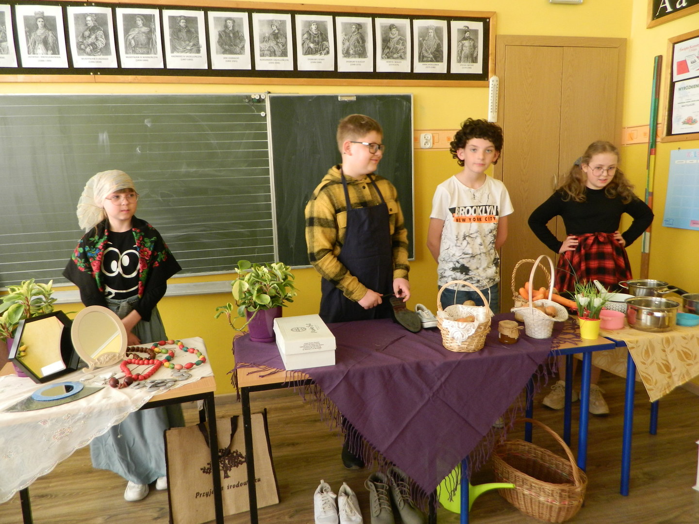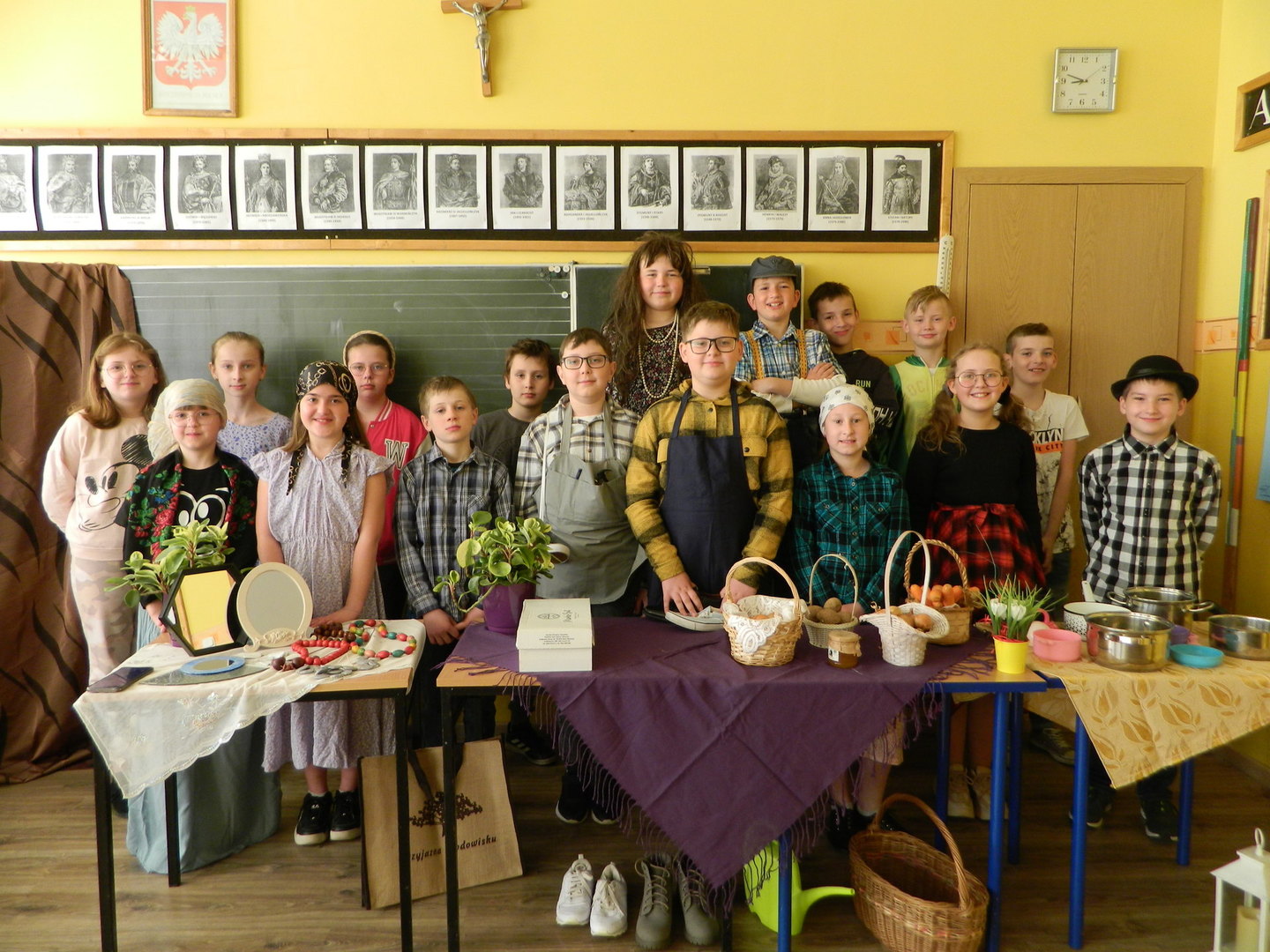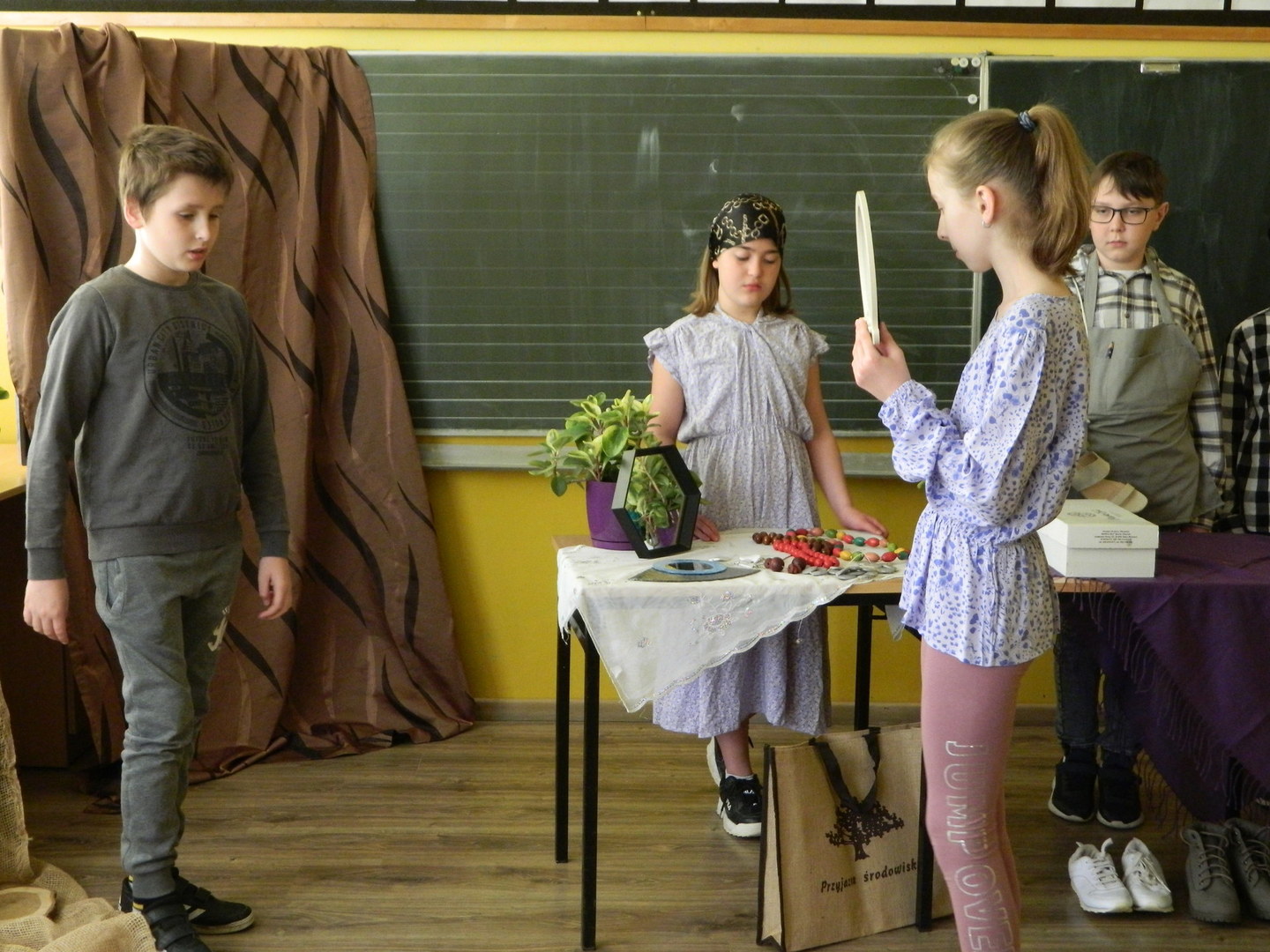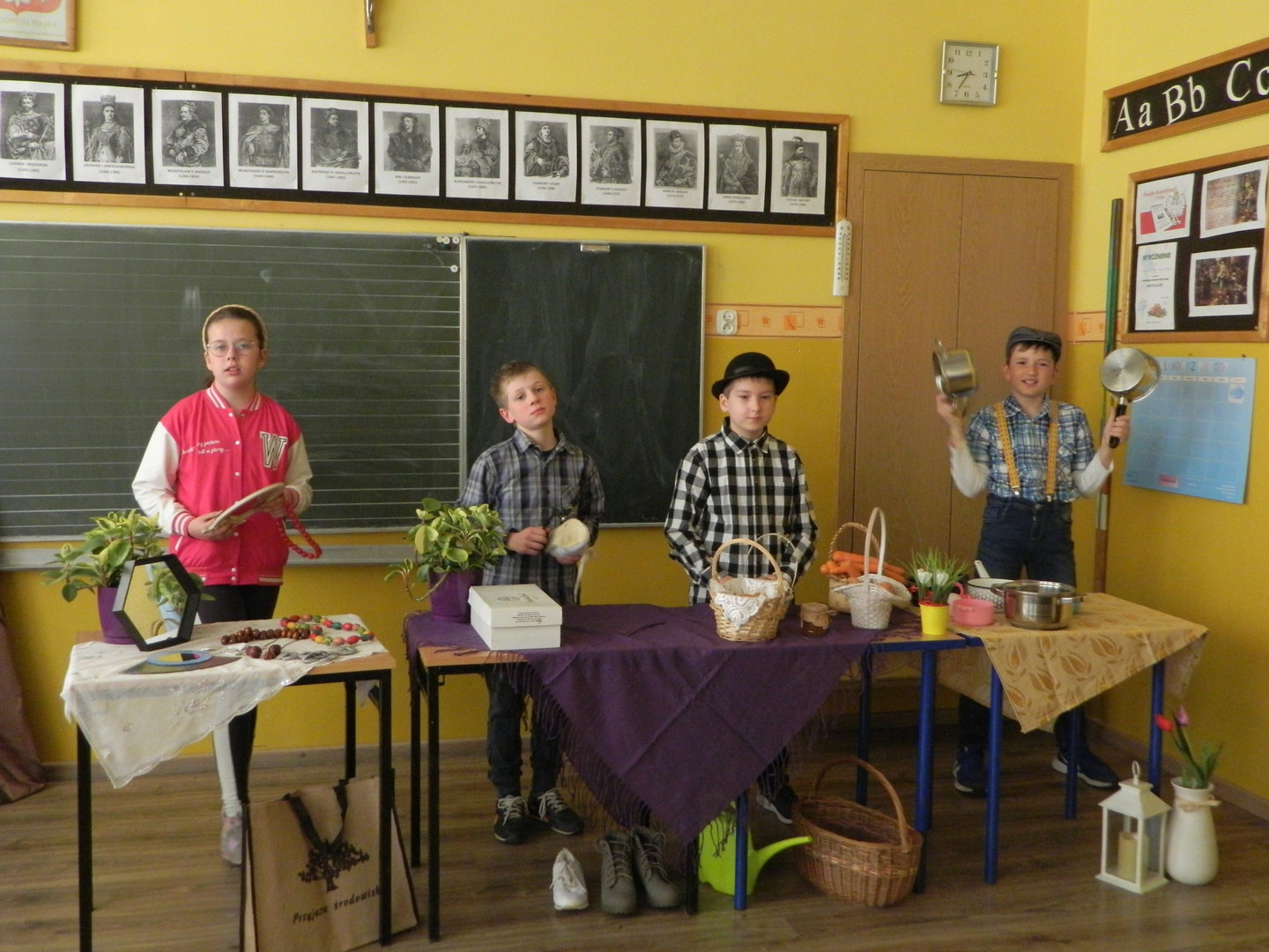 Środa, 4 maja, okazała się dniem pełnym wrażeń zwłaszcza dla uczniów klasy IV, którzy mogli pochwalić się swoimi aktorskimi umiejętnościami. Z wielkim zaangażowaniem podjęli dodatkowe zadanie przedstawienia historii „Bazyliszka” w oparciu o tekst omawiany na lekcji j. polskiego. Uczniowie przygotowali odpowiednie rekwizyty i stroje (wg własnego pomysłu). Doskonale wcielali się w swoje role, pokazując, że „życie i teatr” mogą się pięknie przeplatać w naszej szkolnej rzeczywistości. Młodzi aktorzy zostali docenieni słodkim upominkiem otrzymanym od p. Dyrektor.