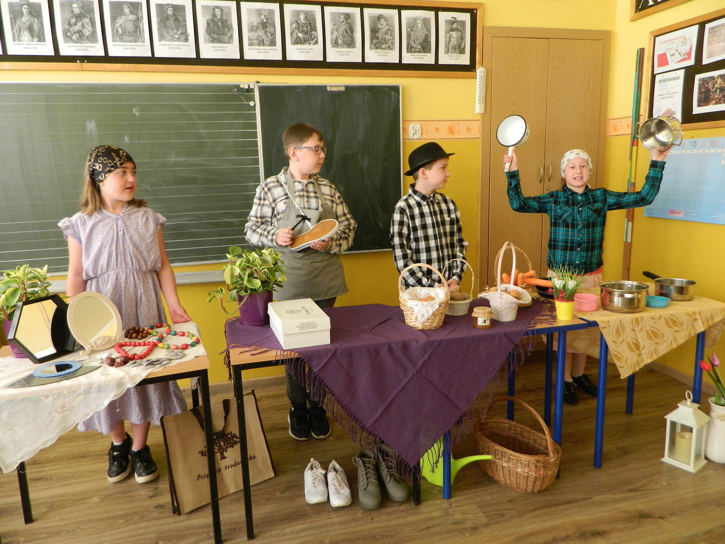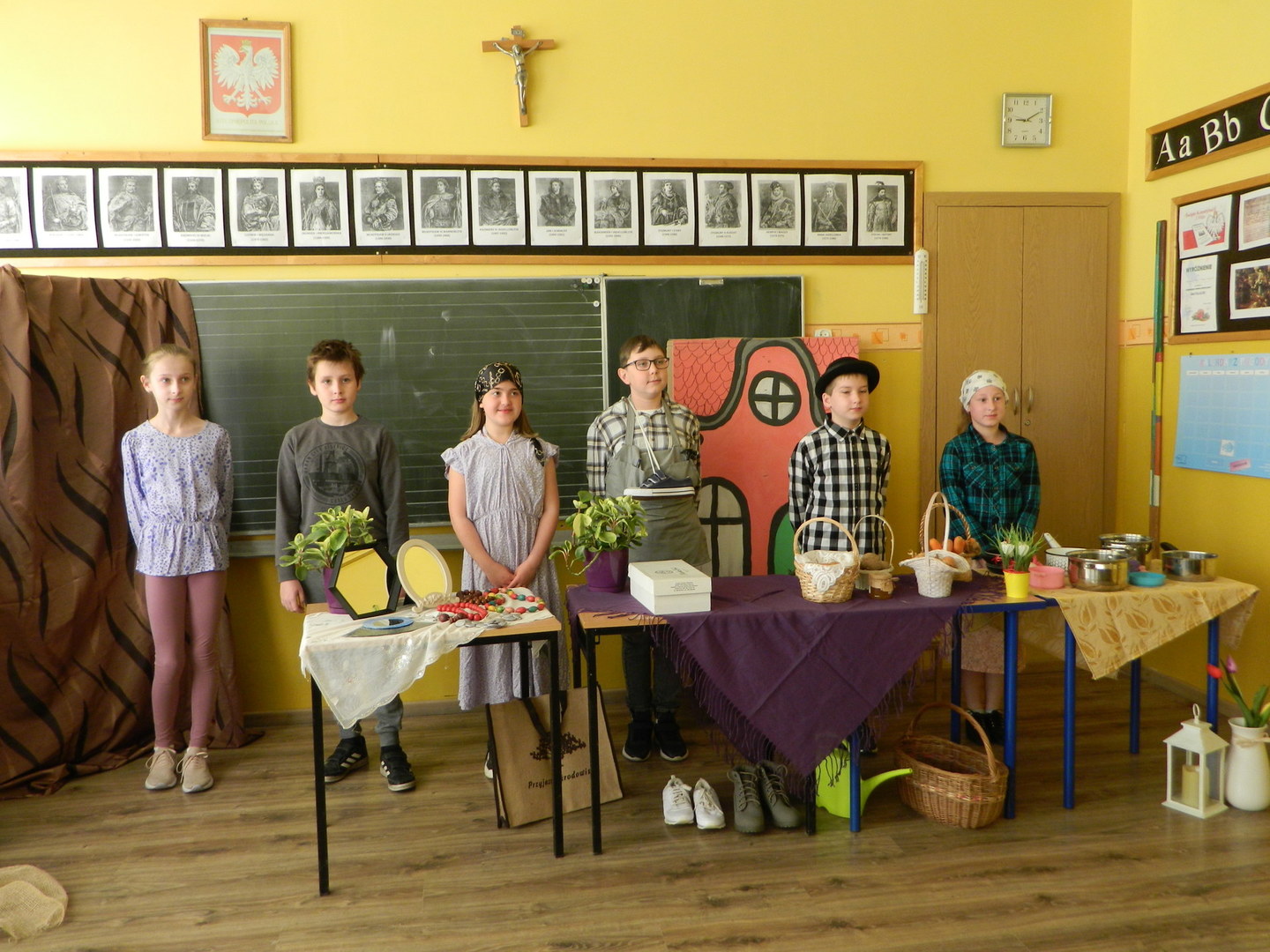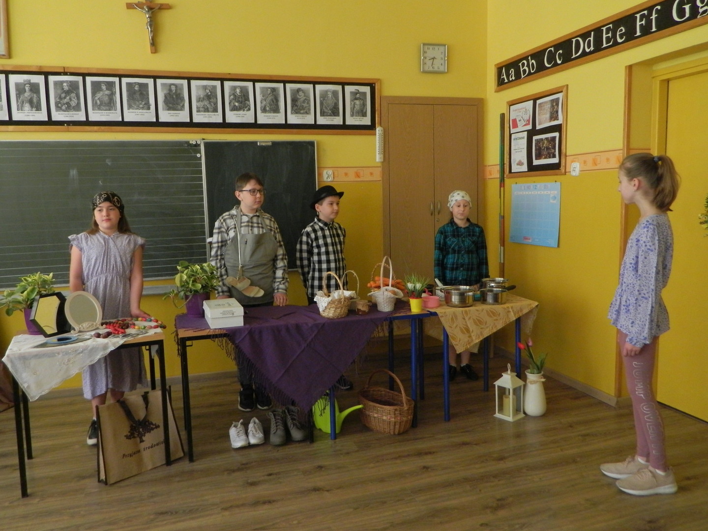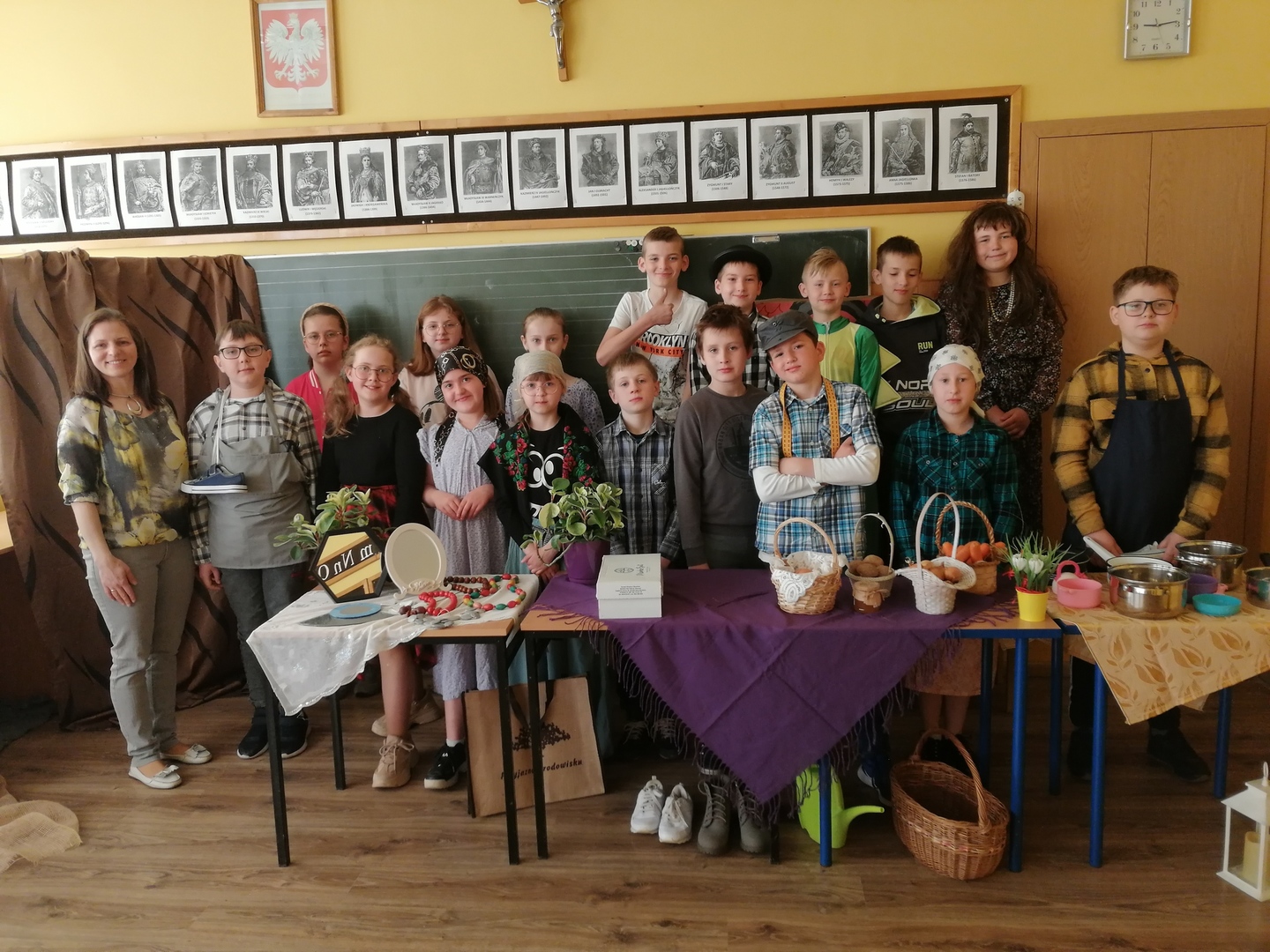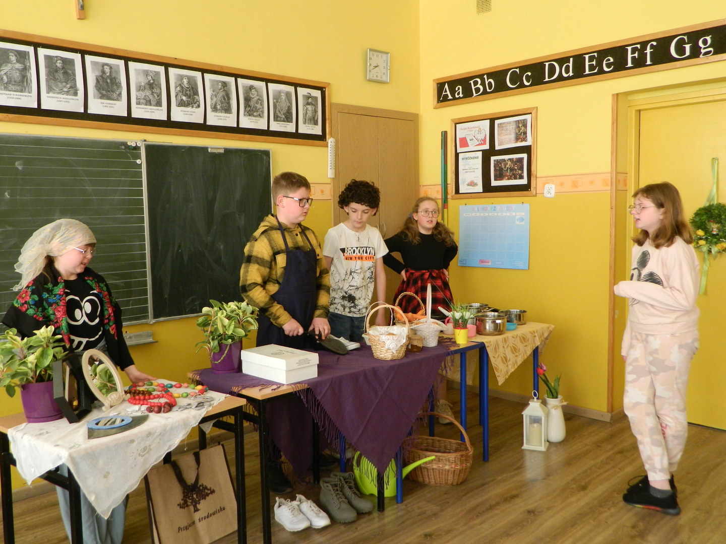 Środa, 4 maja, okazała się dniem pełnym wrażeń zwłaszcza dla uczniów klasy IV, którzy mogli pochwalić się swoimi aktorskimi umiejętnościami. Z wielkim zaangażowaniem podjęli dodatkowe zadanie przedstawienia historii „Bazyliszka” w oparciu o tekst omawiany na lekcji j. polskiego. Uczniowie przygotowali odpowiednie rekwizyty i stroje (wg własnego pomysłu). Doskonale wcielali się w swoje role, pokazując, że „życie i teatr” mogą się pięknie przeplatać w naszej szkolnej rzeczywistości. Młodzi aktorzy zostali docenieni słodkim upominkiem otrzymanym od p. Dyrektor.