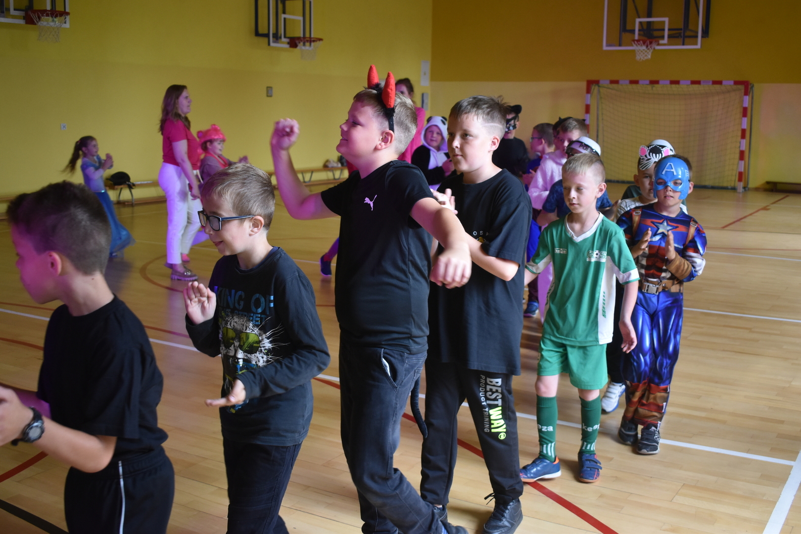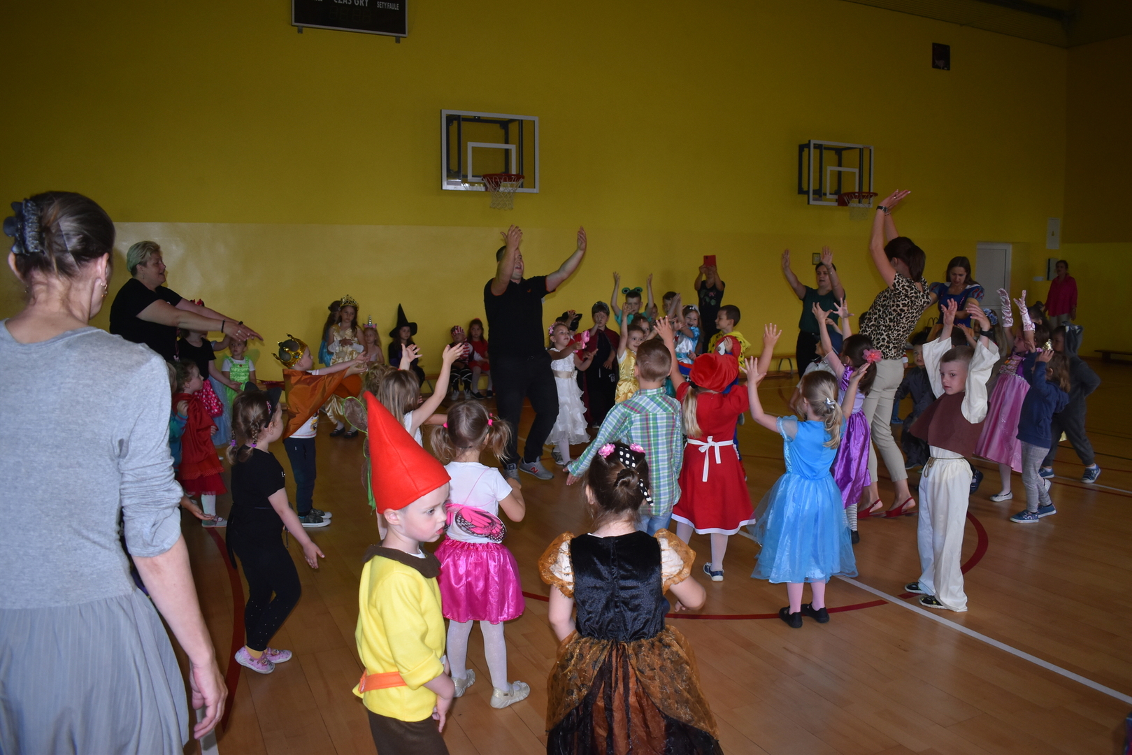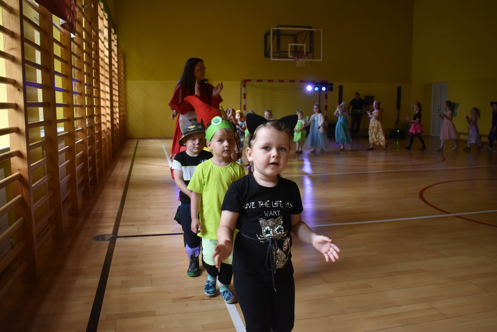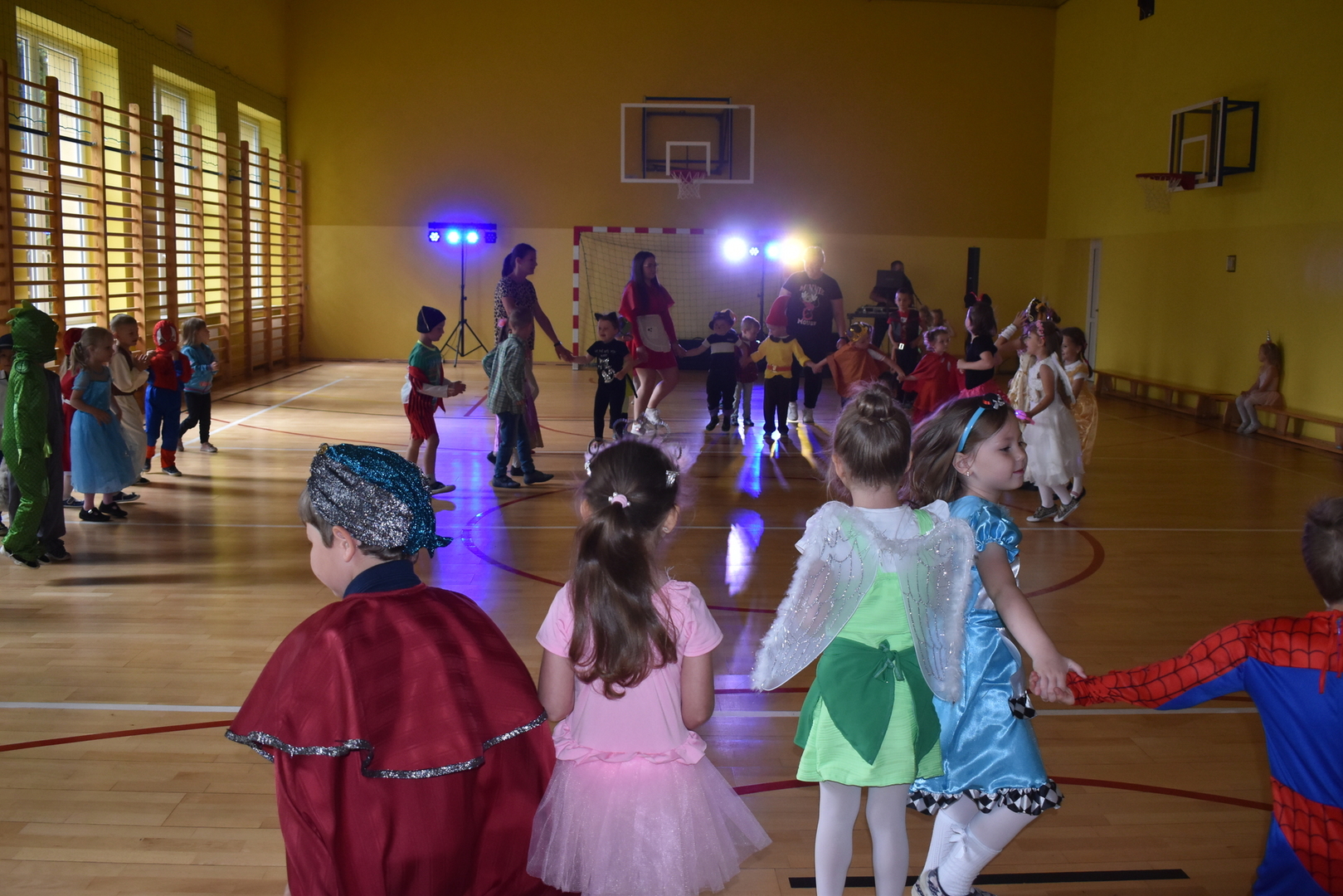 Wpaniale przebrani przedszkolacy i uczniowie bywili się przy dźwiękach ulubionej muzyki w sali gimnastycznej.
