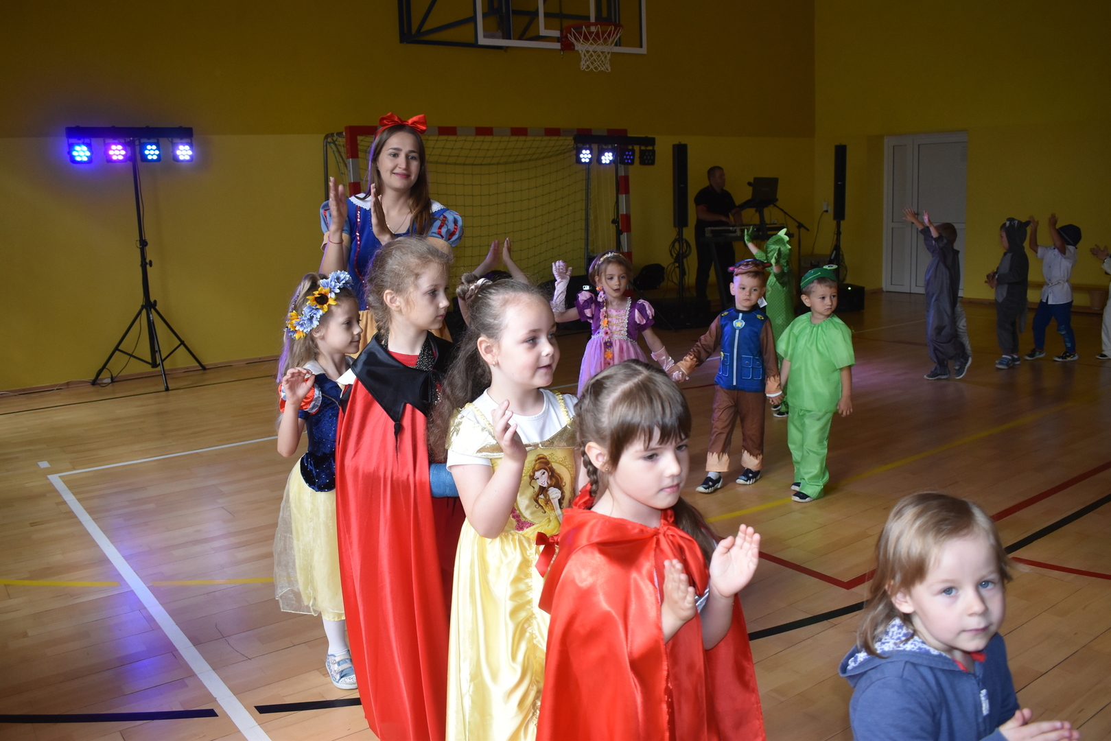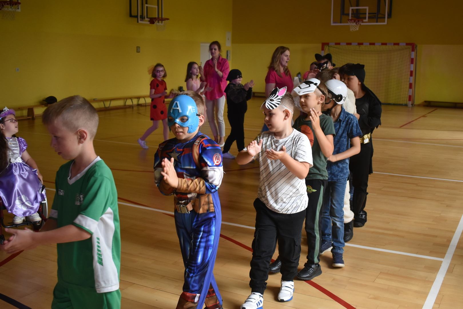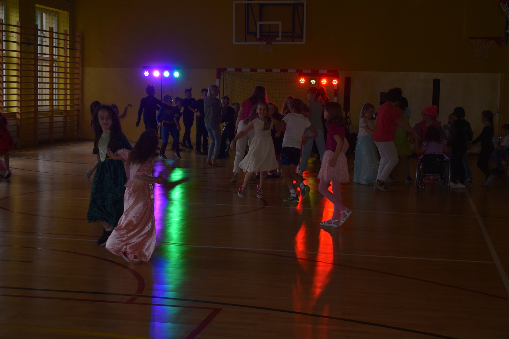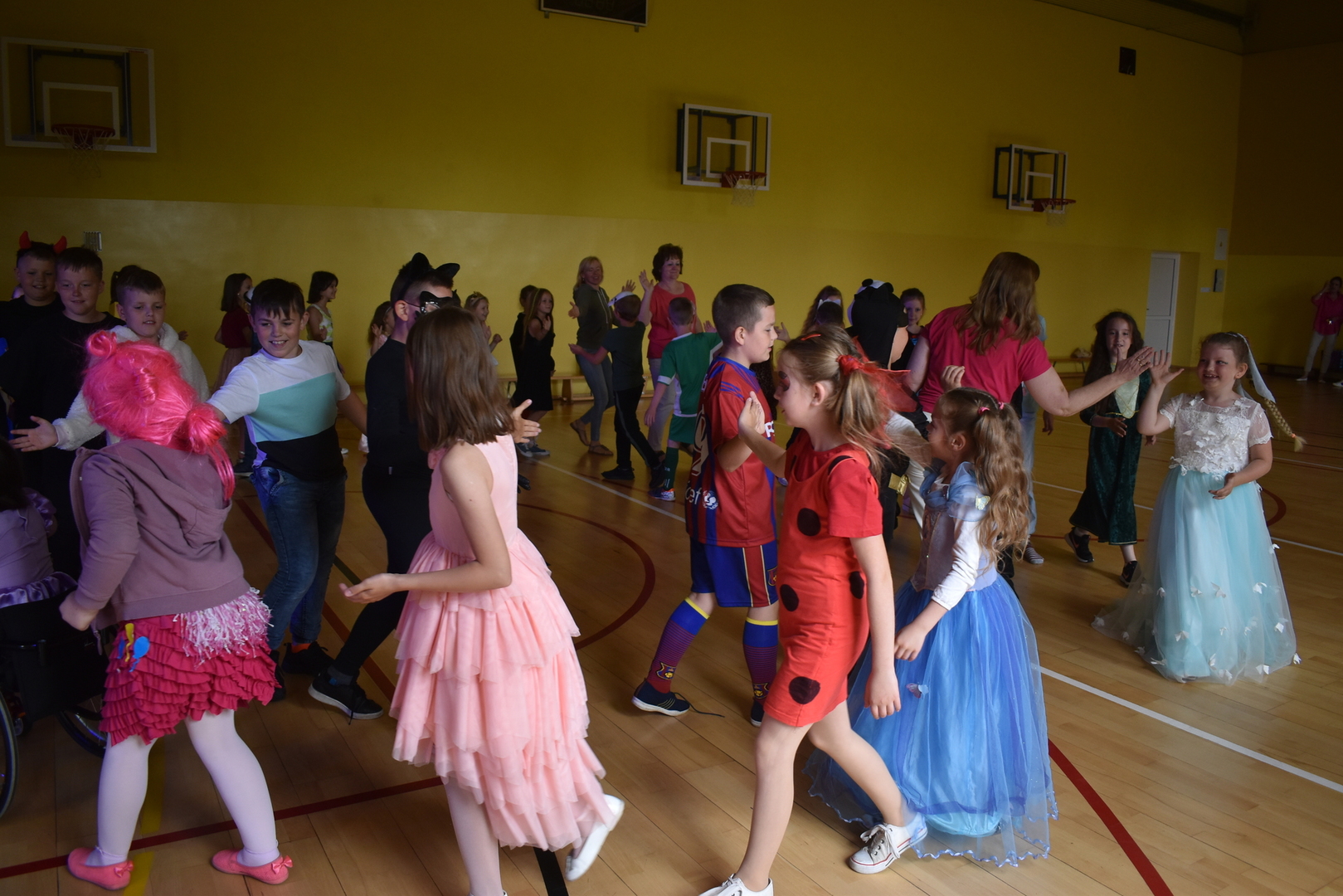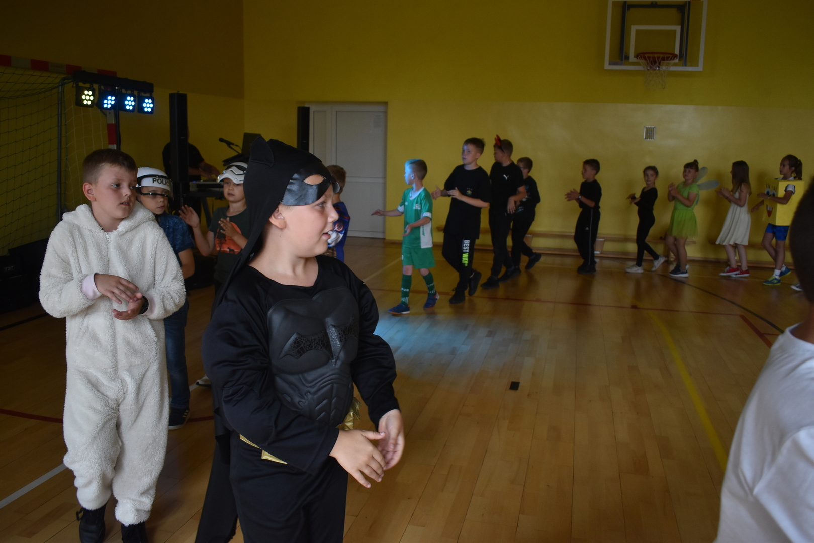 Wpaniale przebrani przedszkolacy i uczniowie bywili się przy dźwiękach ulubionej muzyki w sali gimnastycznej.