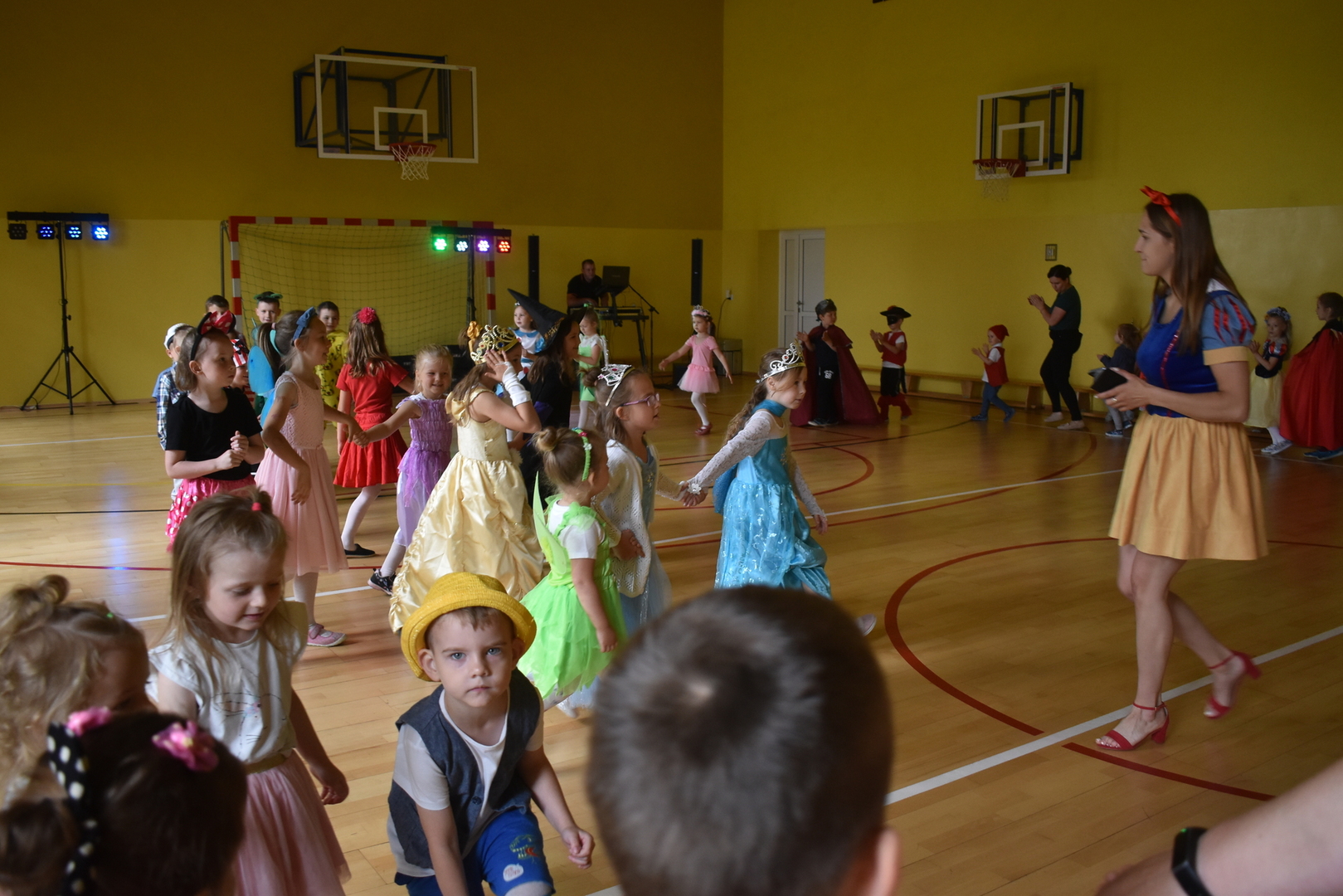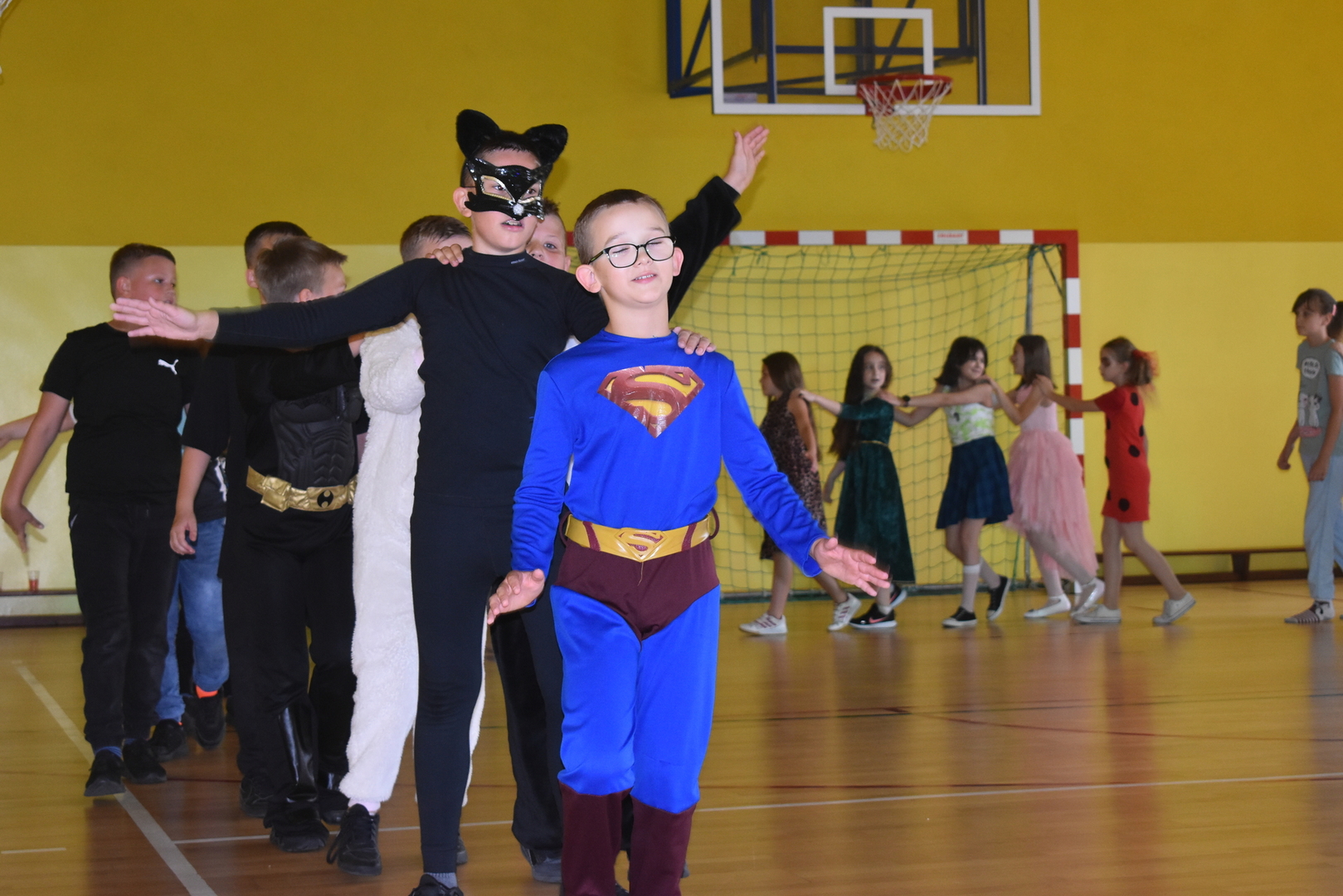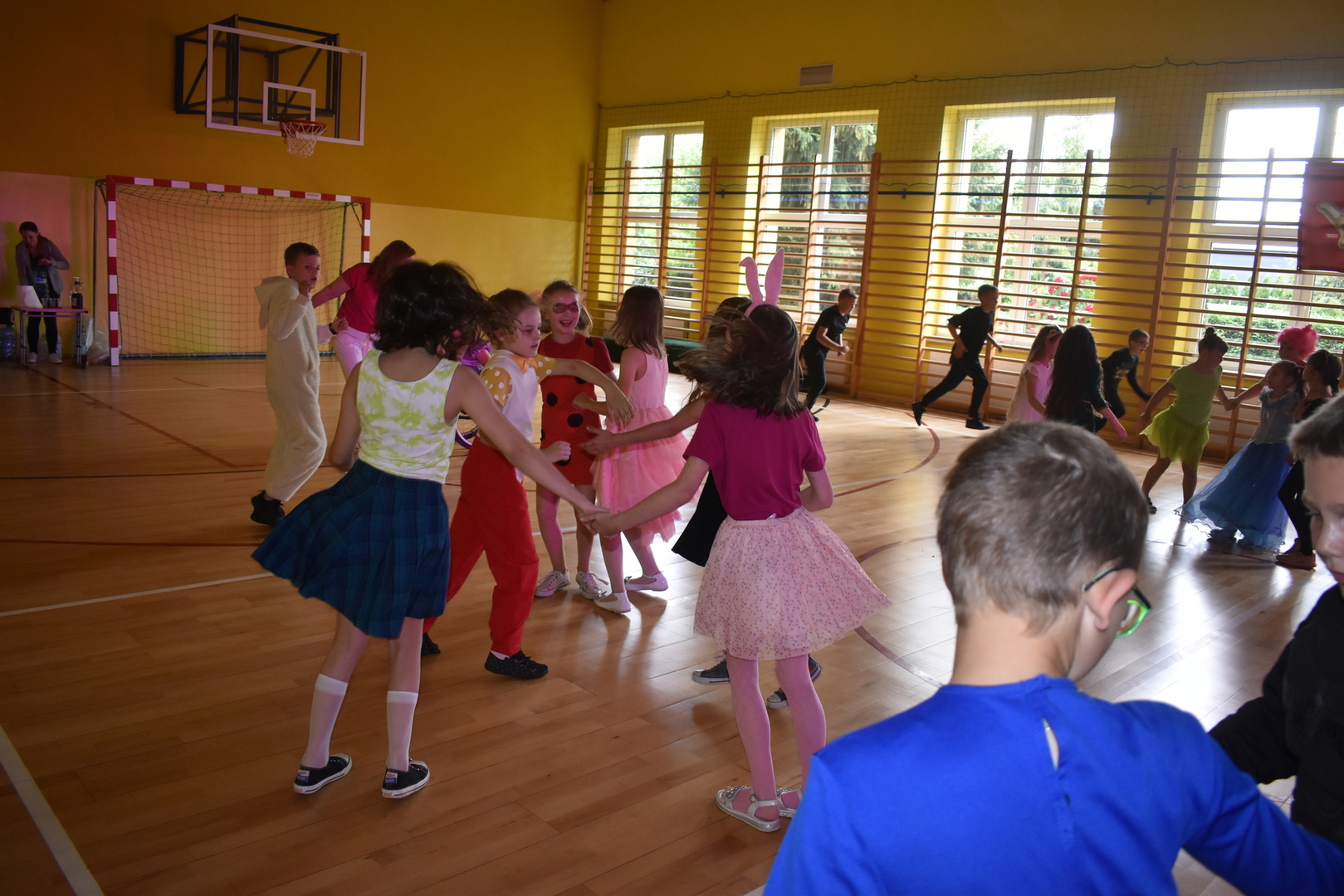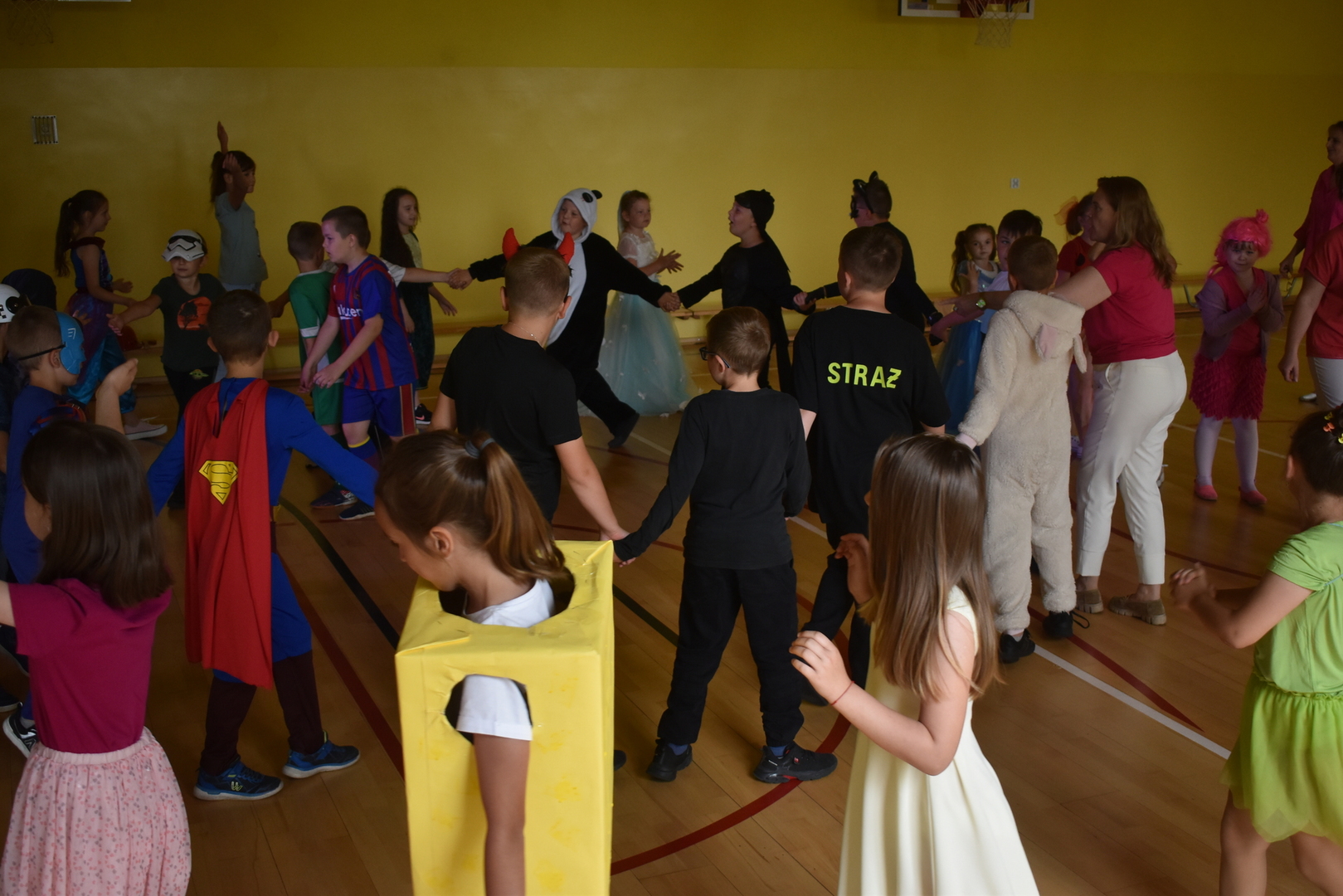 Wpaniale przebrani przedszkolacy i uczniowie bywili się przy dźwiękach ulubionej muzyki w sali gimnastycznej.