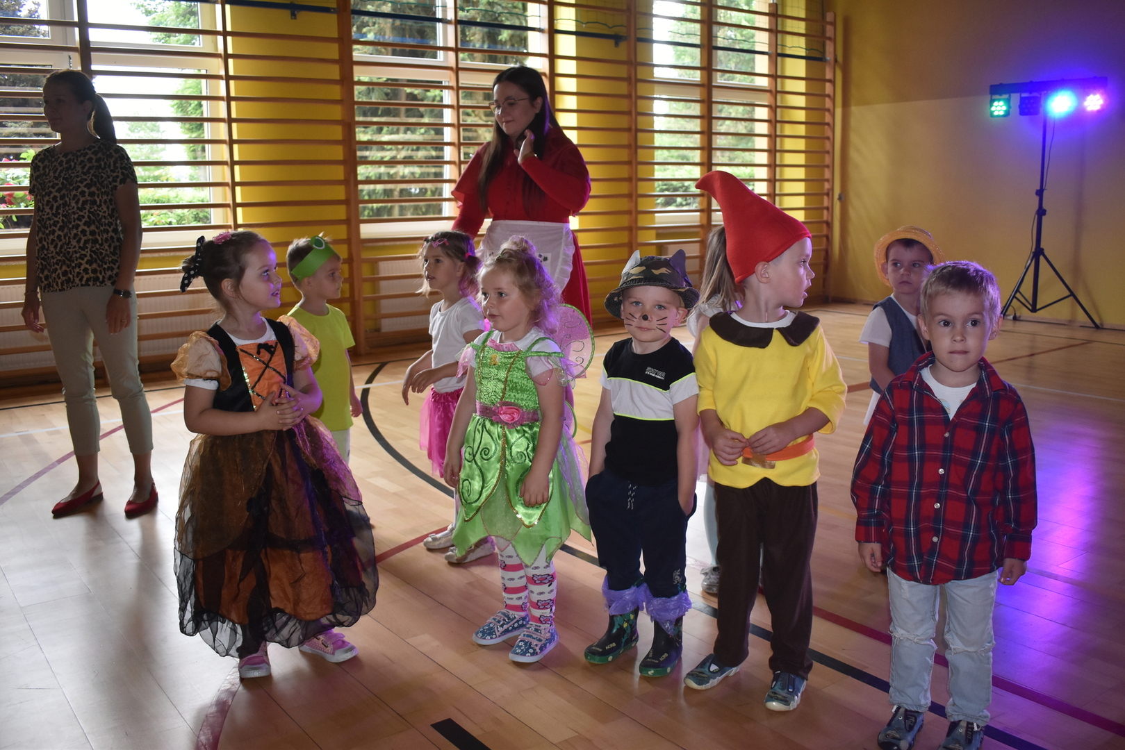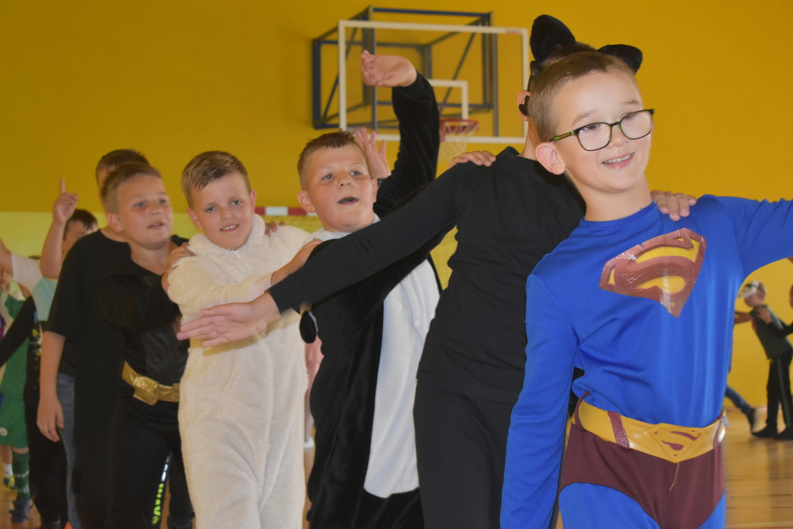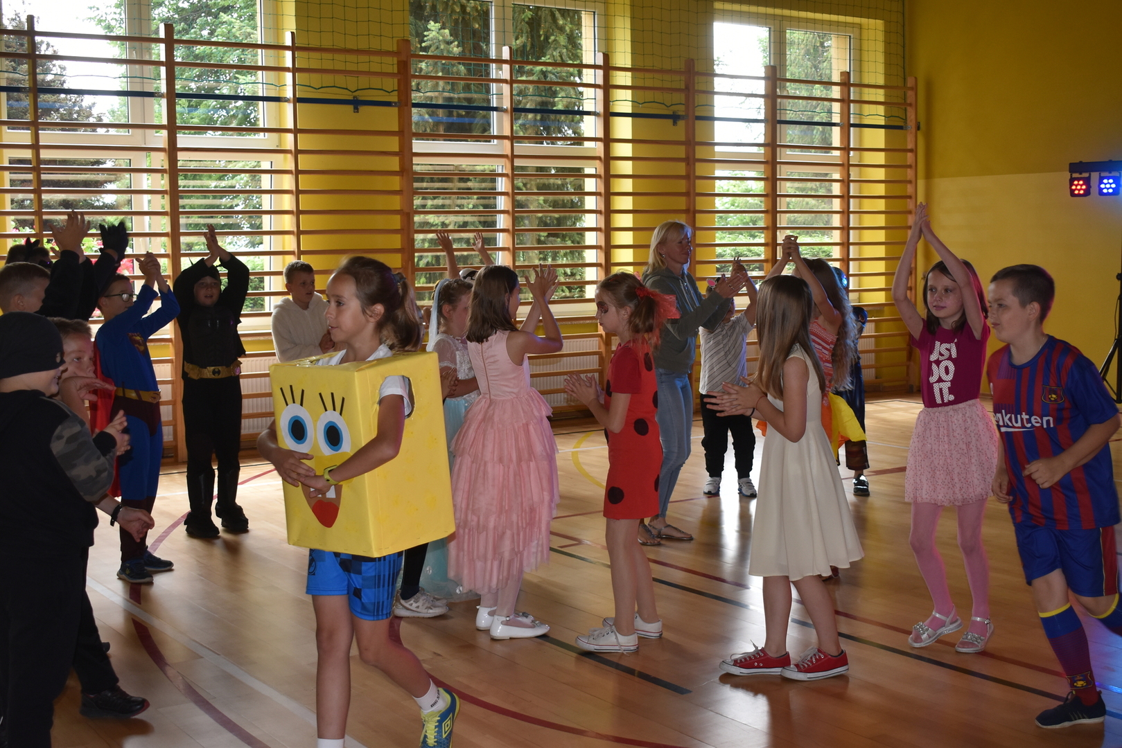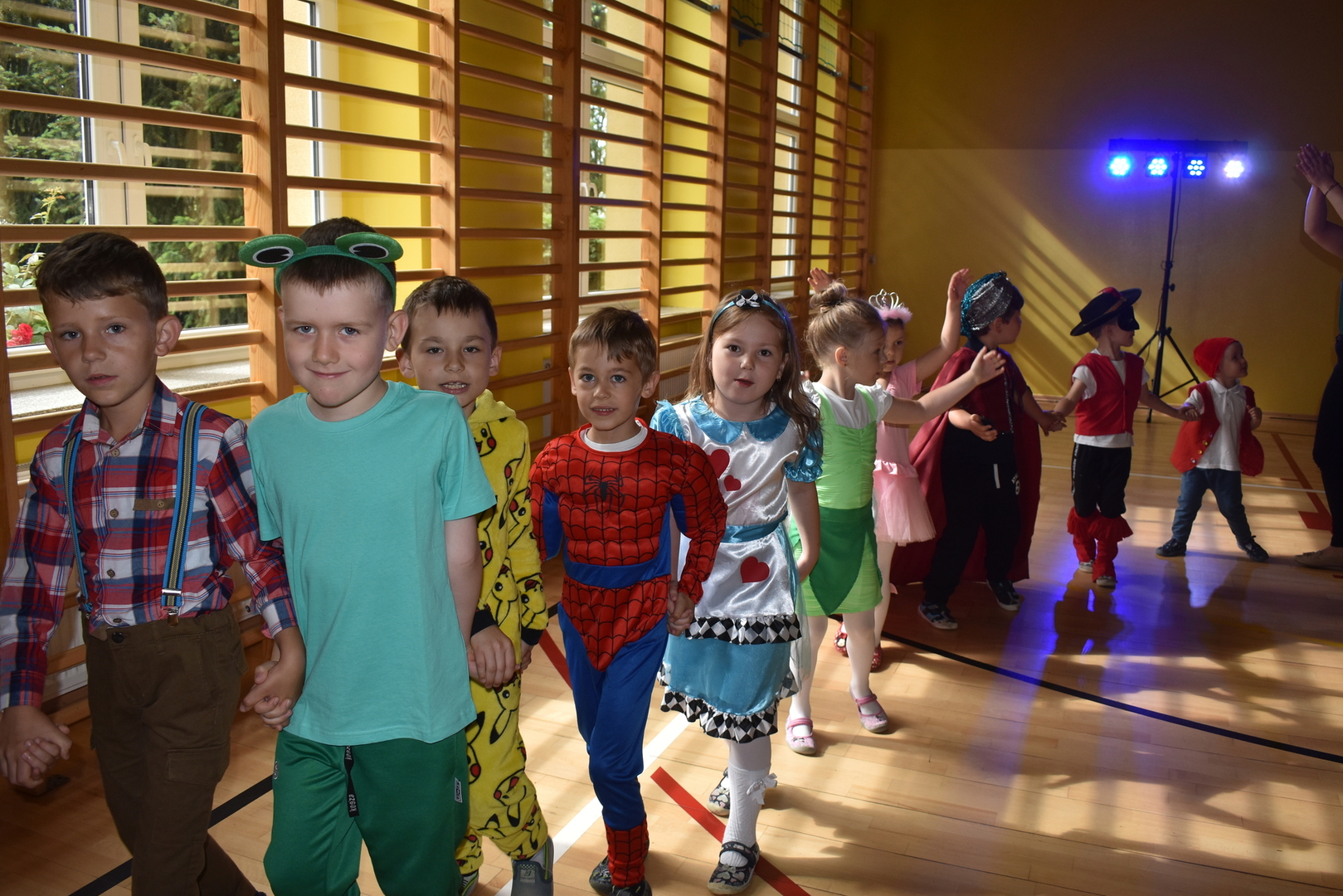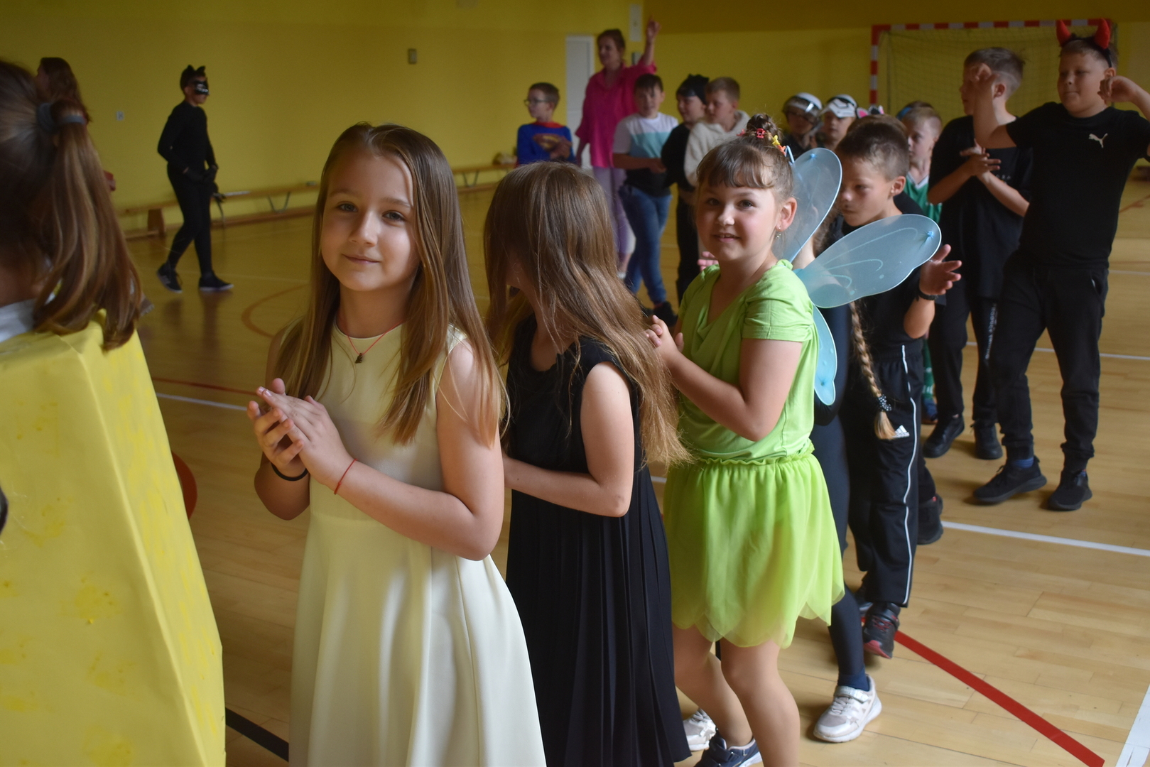 Wpaniale przebrani przedszkolacy i uczniowie bywili się przy dźwiękach ulubionej muzyki w sali gimnastycznej.
