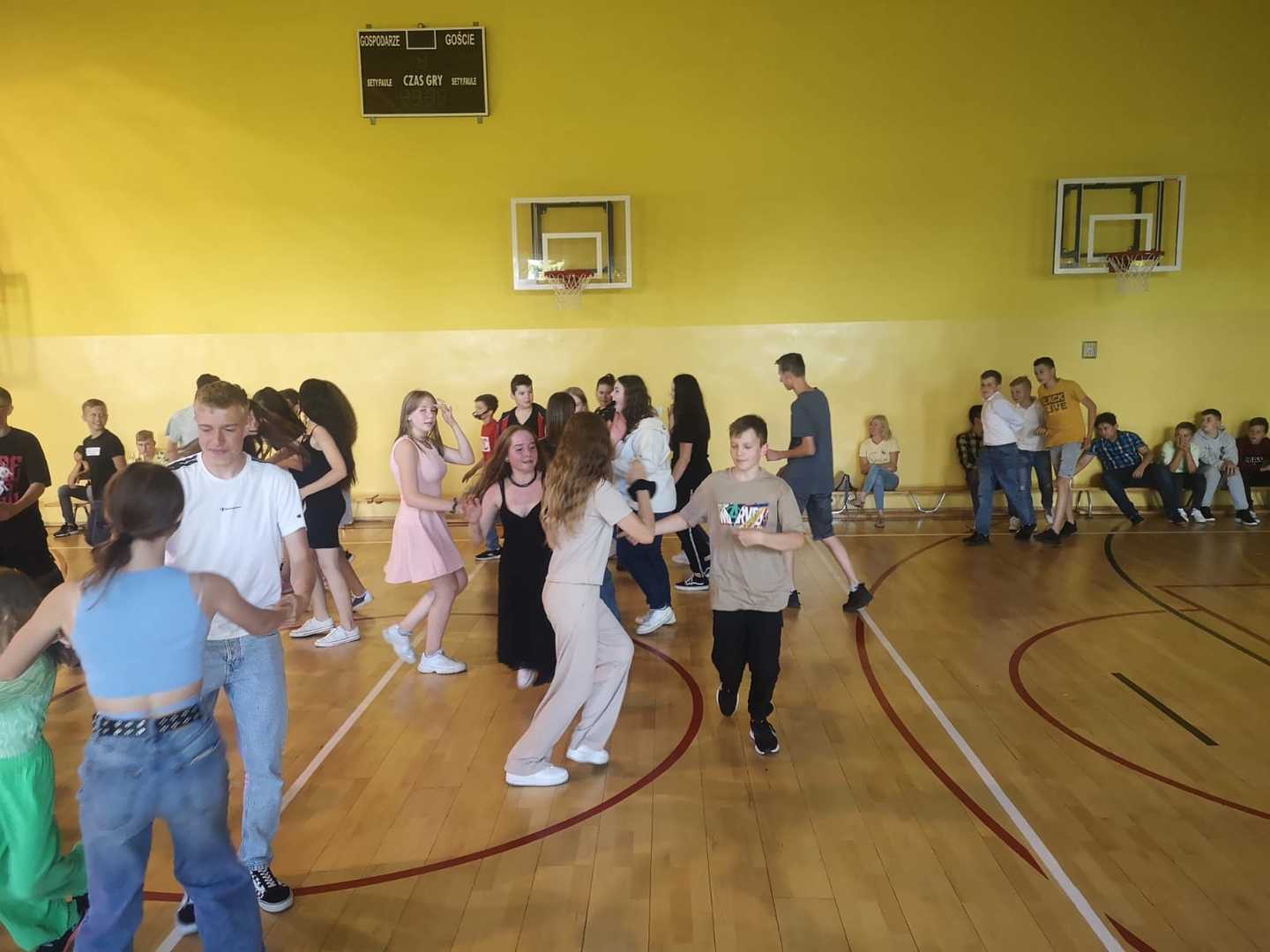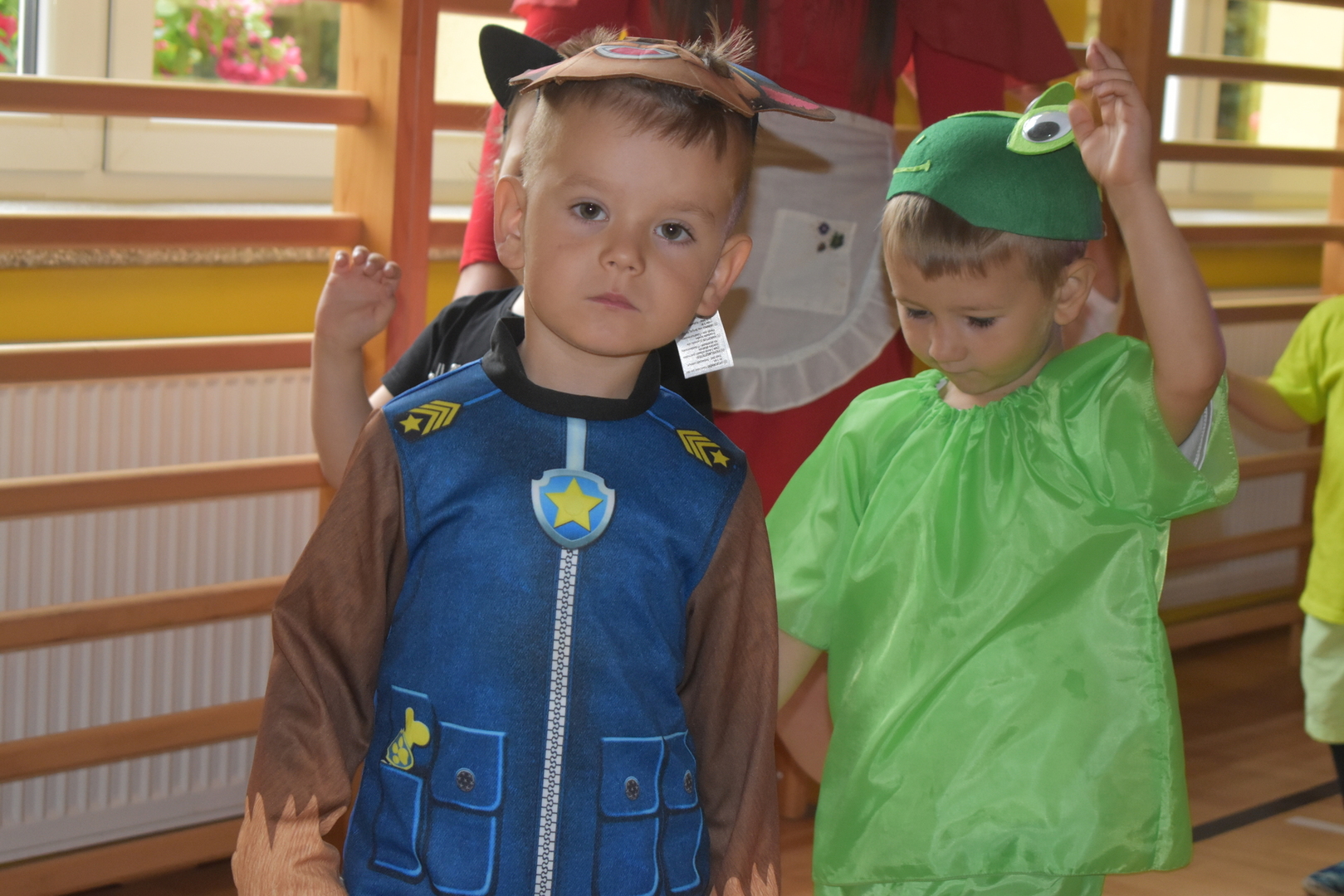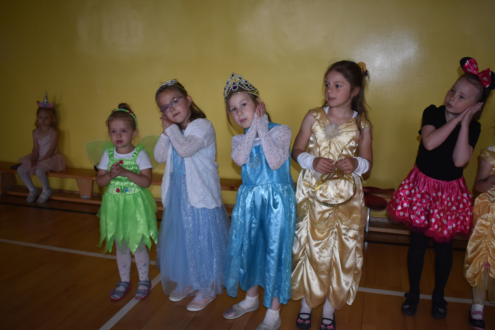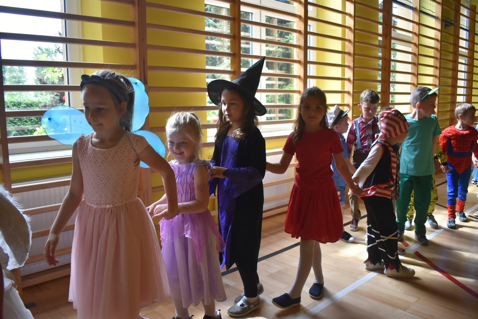 Wpaniale przebrani przedszkolacy i uczniowie bywili się przy dźwiękach ulubionej muzyki w sali gimnastycznej.
