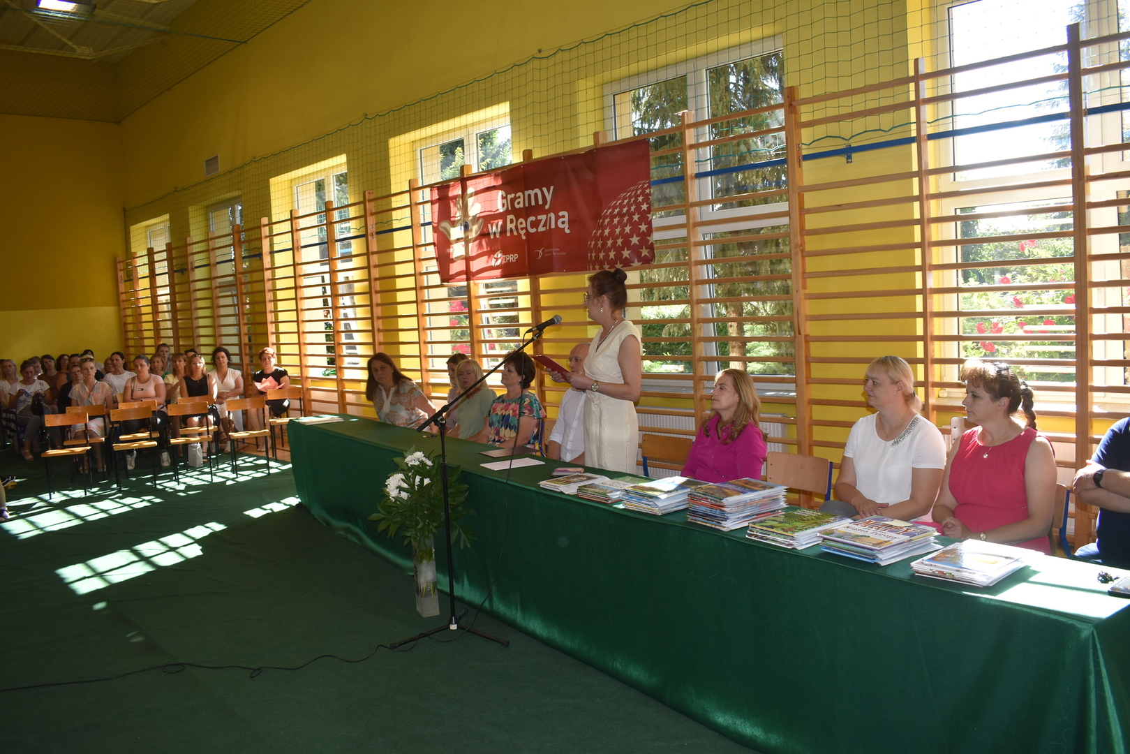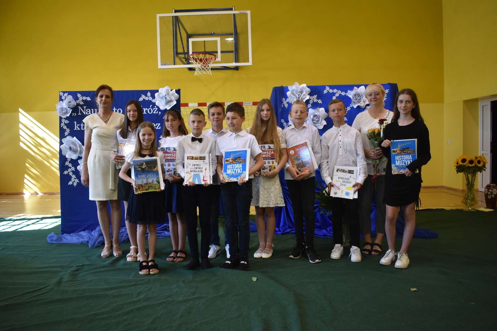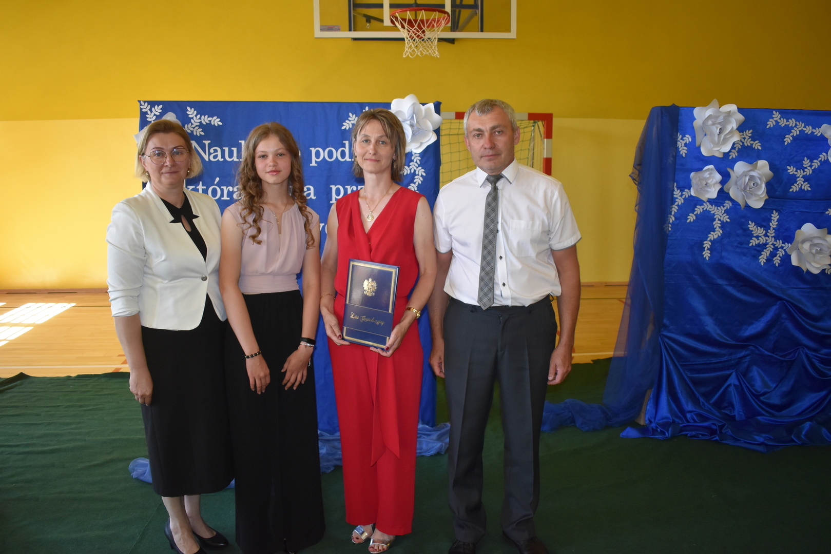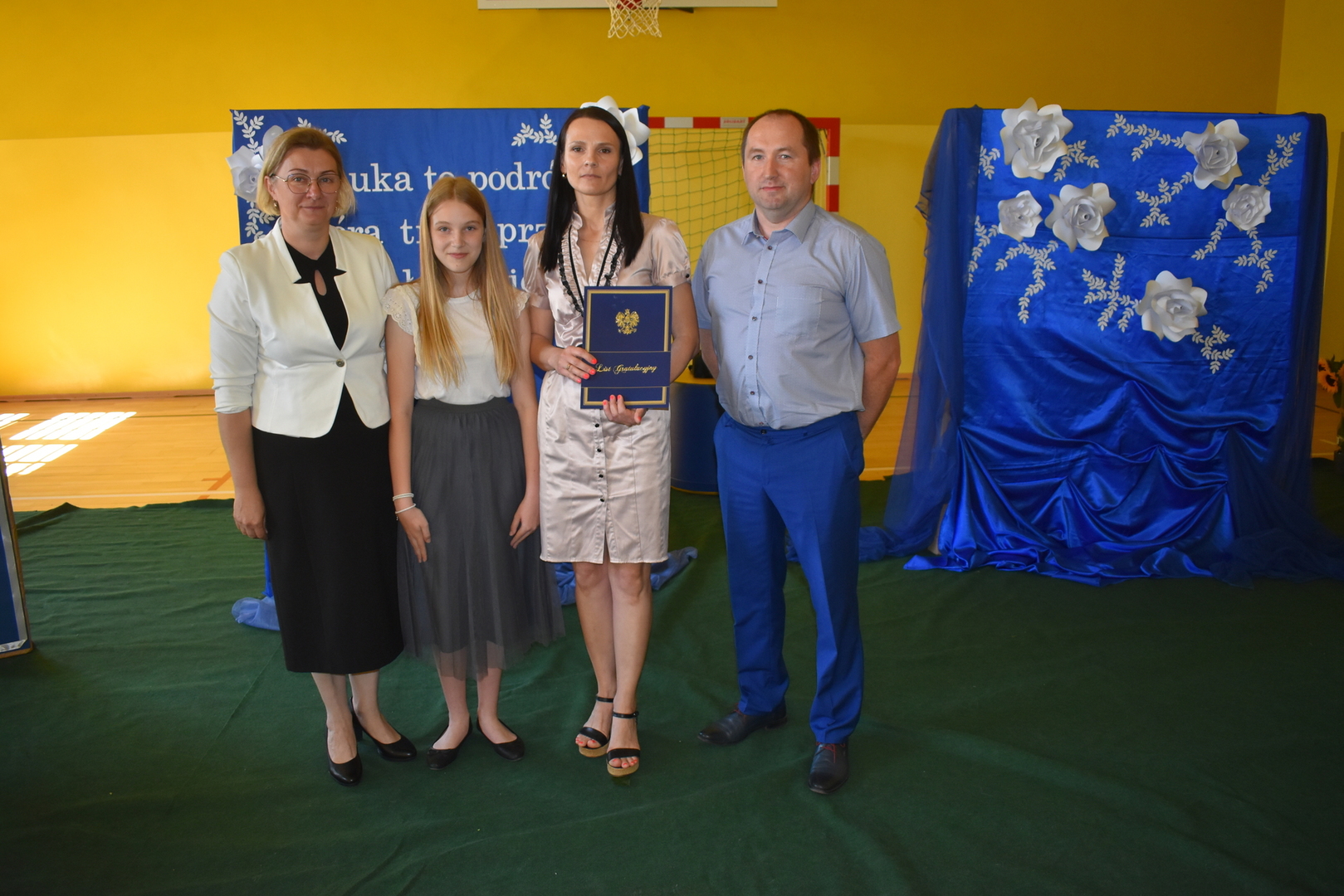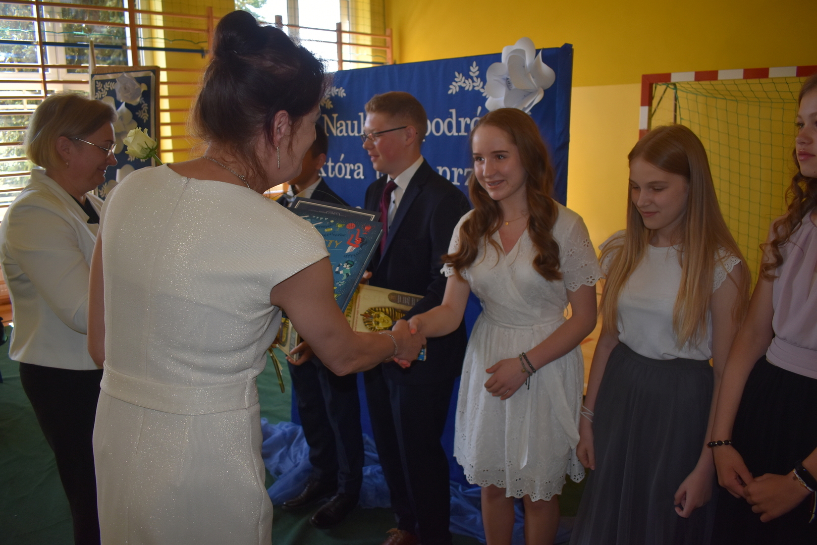 Nadszedł dzień zakończenia roku szkolnego. Przed nami upragnione wakacje. Podczas uroczystej akademii Pani Dyrektor Alina Rączka pogratulowała wszystkim uczniom wspaniałych wyników, otrzymania promocji do klas programowo wyższych i wytrwałości. Podziękowania płynęły również dla rodziców, którzy współpracują i wspierają działalność szkoły, a także dla Grona Pedagogicznego za trud i troskę wkładane w kształtowanie dzieci i młodzieży oraz ich edukację i rozwój oraz dla pracowników szkoły za dbałość o jej wizerunek i porządek. Życzenia i podziękowania w imieniu Rady Rodziców złożył także przewodniczący - pan Karol Basty. Kończąc wystąpienie Pani Dyrektor życzyła wszystkim wspaniałych i bezpiecznych wakacji, chwili wytchnienia i powrotu do szkoły we wrześniu ze zdwojoną siłą w gotowości do pracy i nauki. Tuż po przemówieniu nastąpiło wręczenie świadectw z wyróżnieniem oraz nagród ksiązkowych ufundowanych przez Radę Rodziców w poszczególnych klasach.