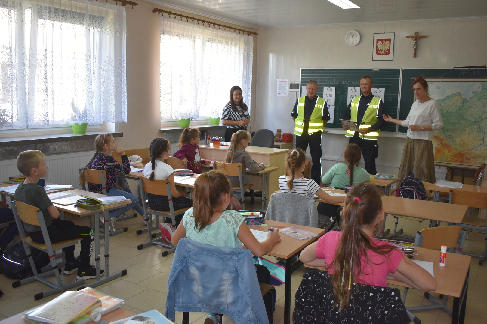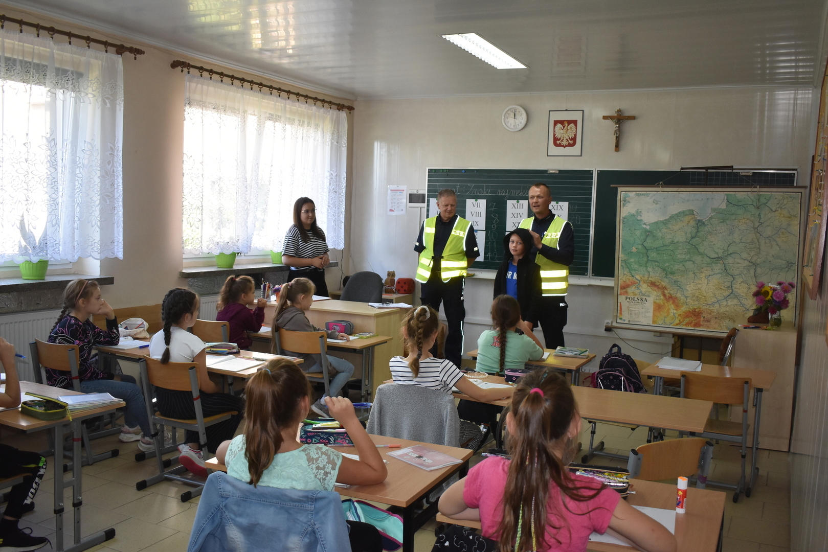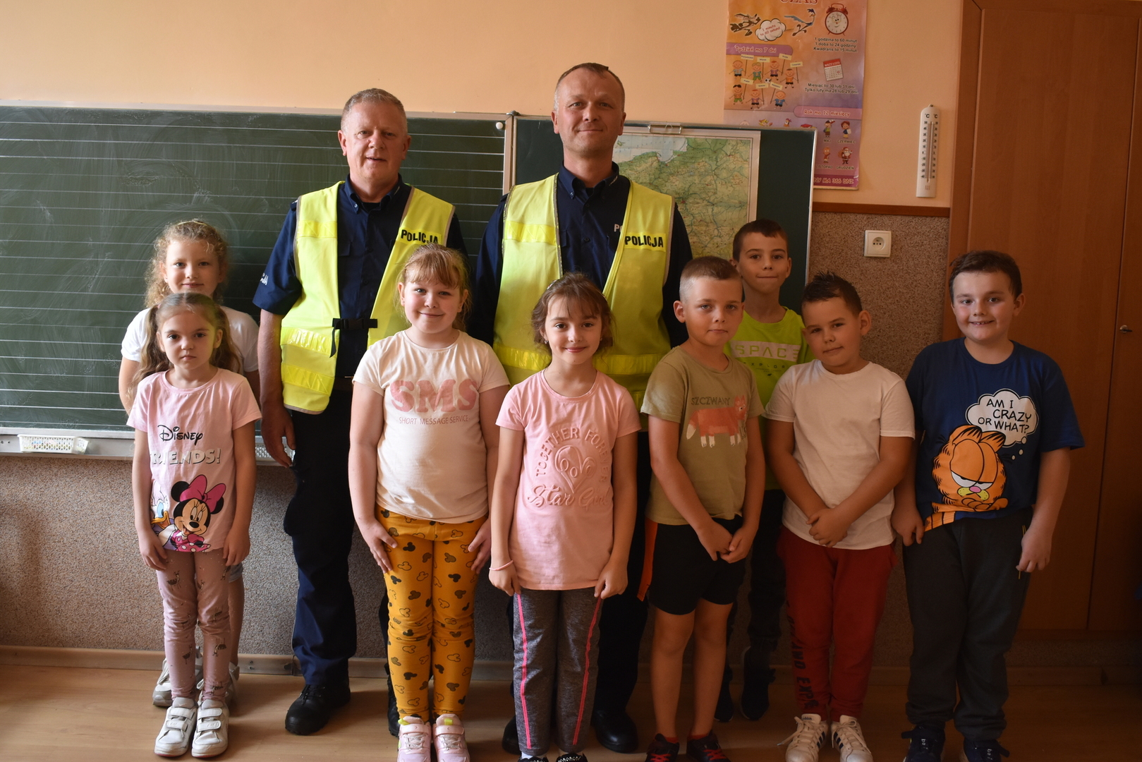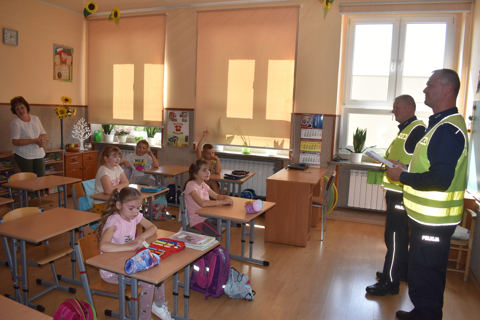 Uczniowie klas I-III wzięli udział w spotkaniu z policjantami z Komisariatu Policji w Koźminie Wlkp. Panowie mł.asp. Łukasz Stanisławski (dzielnicowy naszego rewiru) oraz asp. sztab. Wojciech Kułaga przypomnieli zasady bezpiecznego poruszania się po przejściu dla pieszych, podczas wsiadania i wysiadania z autobusu szkolnego oraz właściwego zachowania się podczas spotkania z nieznajomymi czy groźnymi zwierzętami. Utrwalali zasady szczególnej ostrożności , przytaczając przypadki z życia codziennego, które wystąpiły podczas ich służby. Uczniowie słuchali z zainteresowaniem, następnie mogli zadawać pytania. Jak co roku uczniowie klasy pierwszej otrzymali od policji pamiątkowe plany lecji oraz znaczki odblaskowe. Była to wspaniała lekcja o bezpieczeństwie.
