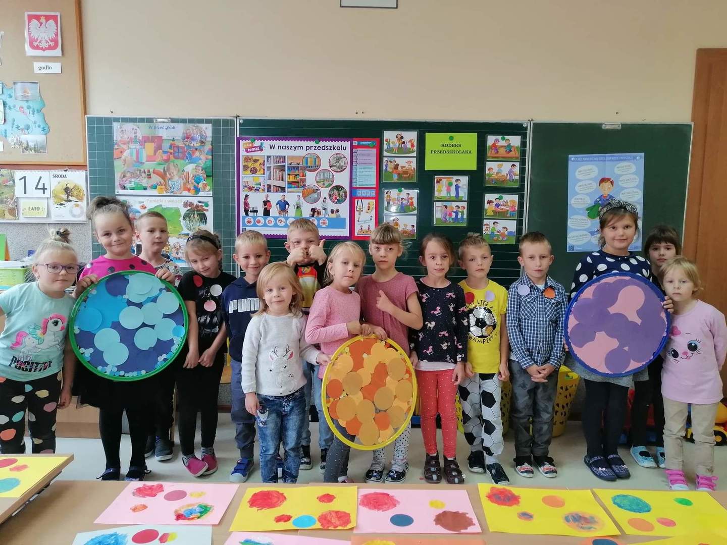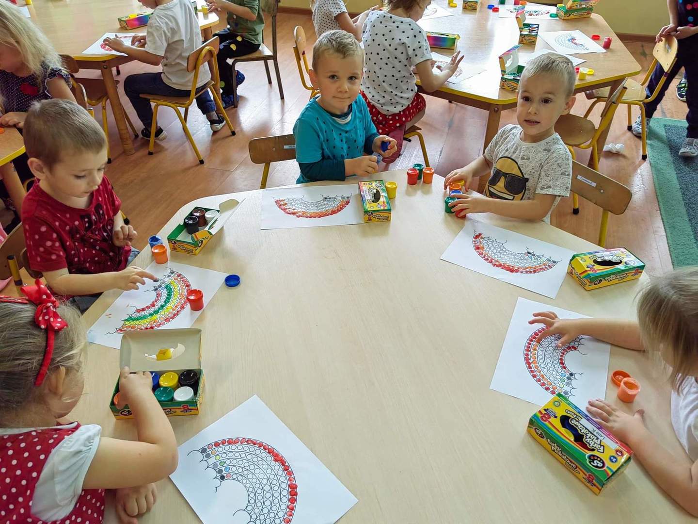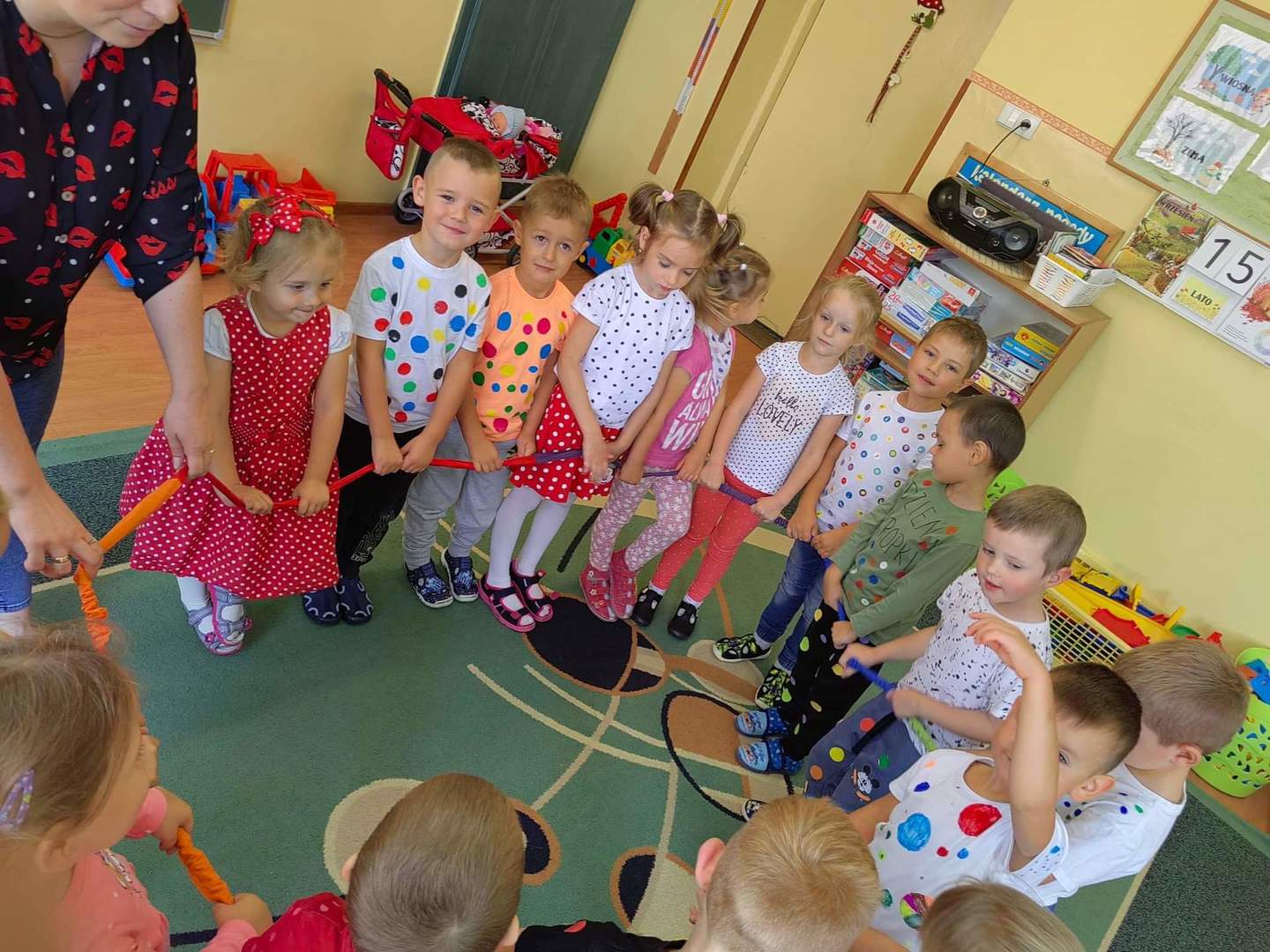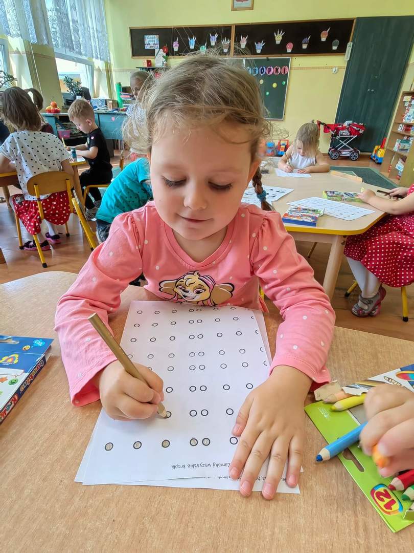 Jak co roku tego dnia ubrania przedszkolaków wypełnione były kolorowymi kropkami. Kreatywność rodziców zasługuje na uznanie. Na ubraniach dzieci widniały kropki wyklejane, malowane, a nawet przyszywane. Dzieci podczas zajęć poznały genezę tego święta. Były przeprowadzone w taki sposób aby uświadomić dzieci, że każdy z nas ma jakieś ukryte zdolności, talenty, które gdzieś tam drzemią głęboko i czekają na nasze odkrycie. Szukaliśmy naszych mocnych stron by podnieść poczucie wartości wszystkich przedszkolaków.