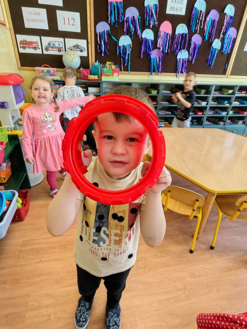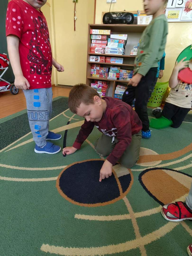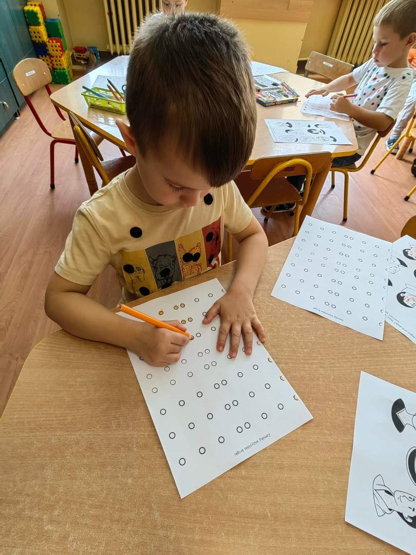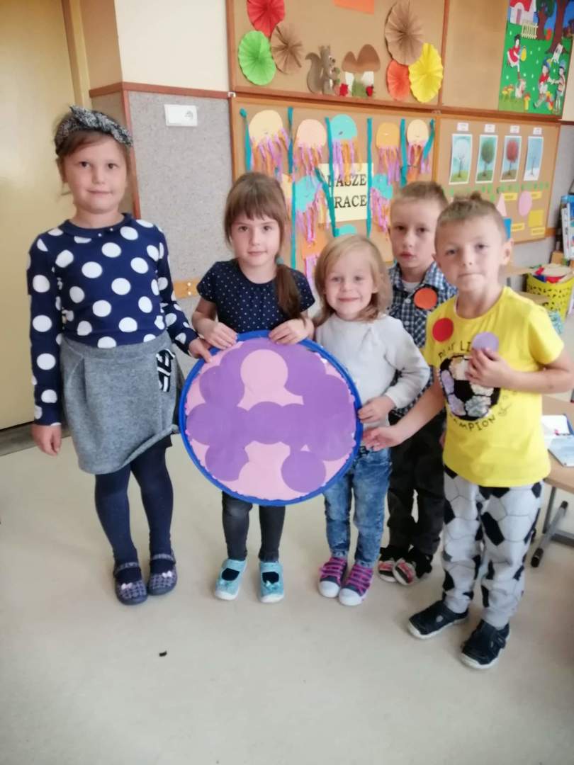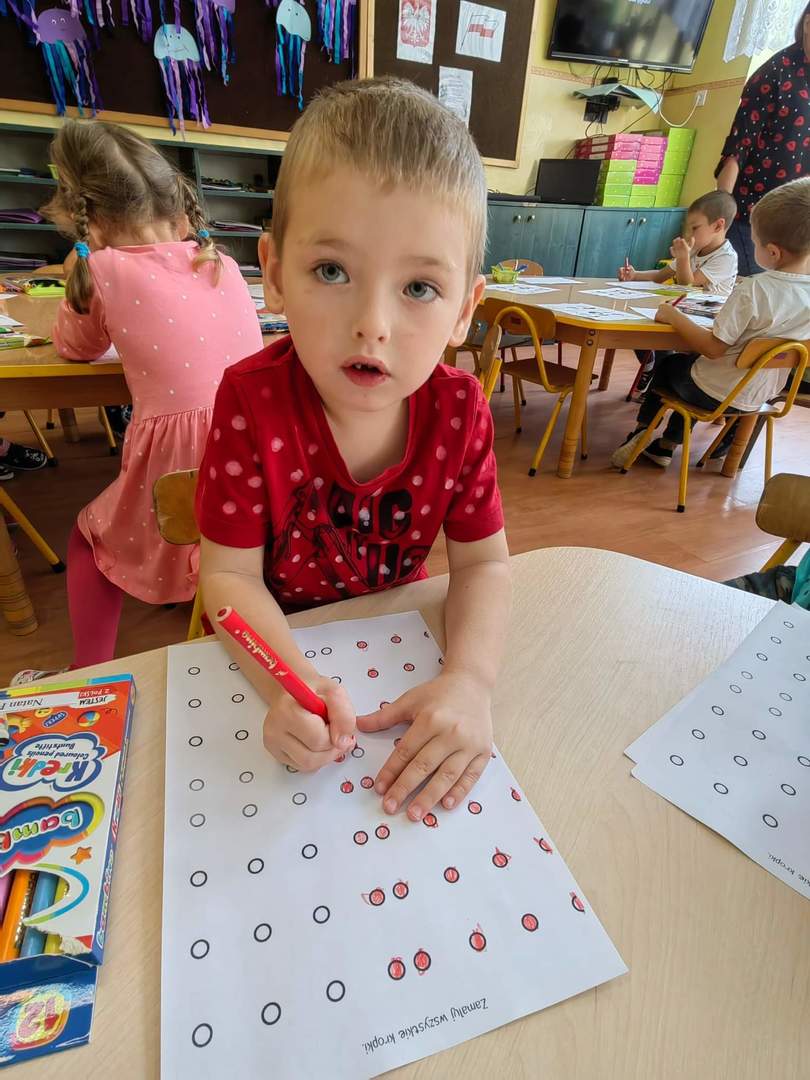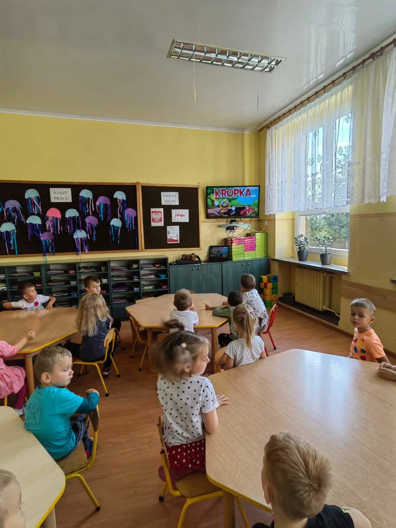 Tego dnia również dostrzegaliśmy kropki tam, gdzie wcześniej nikt na nie, nie zwracał uwagi. Po obejrzeniu ciekawego filmu edukacyjnego pt. „Kropka”, okazało się, że kropki towarzyszą nam w naszym codziennym życiu. Są w literce "i" ,kropkach biedronki, na nosie wielu z nas jako piegi, a nawet zdobią kapelusz muchomora.