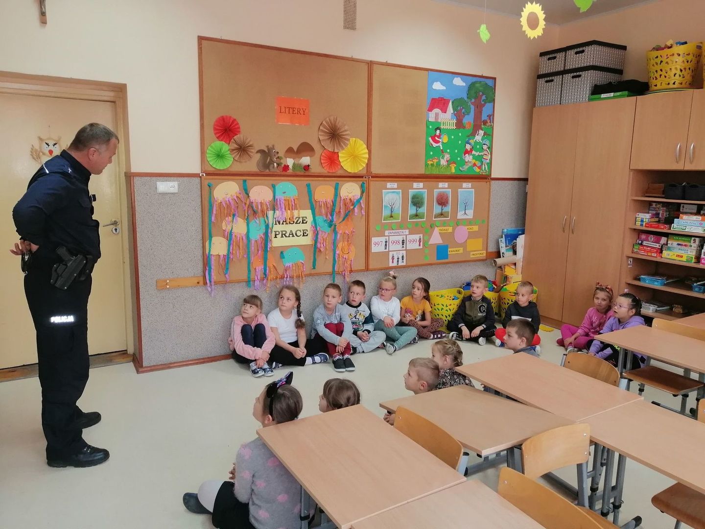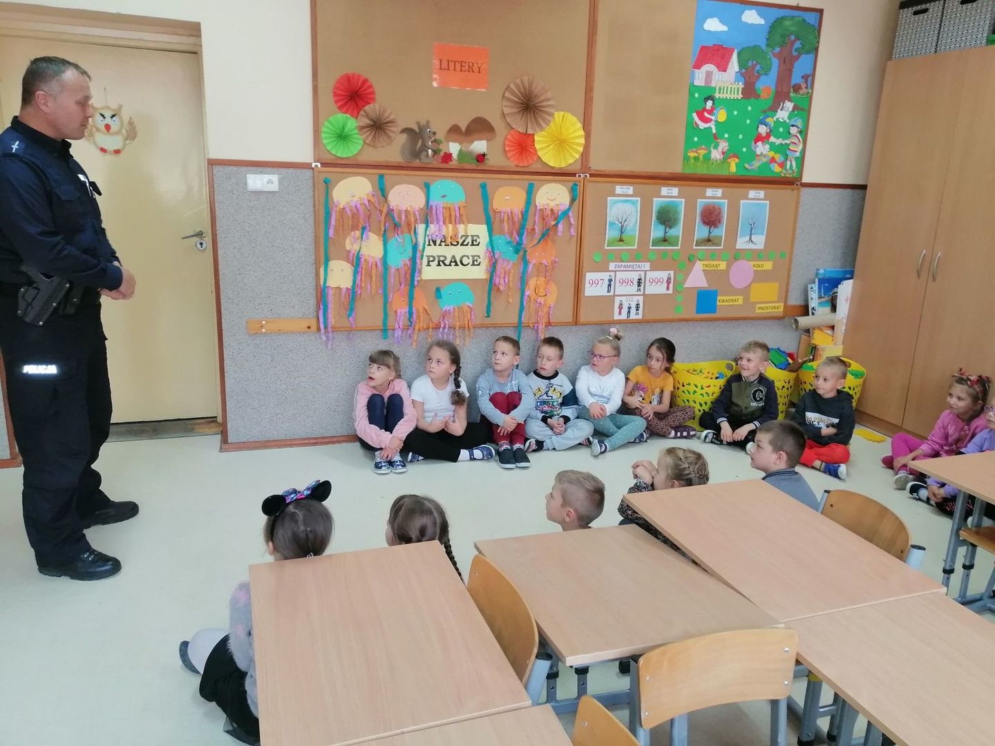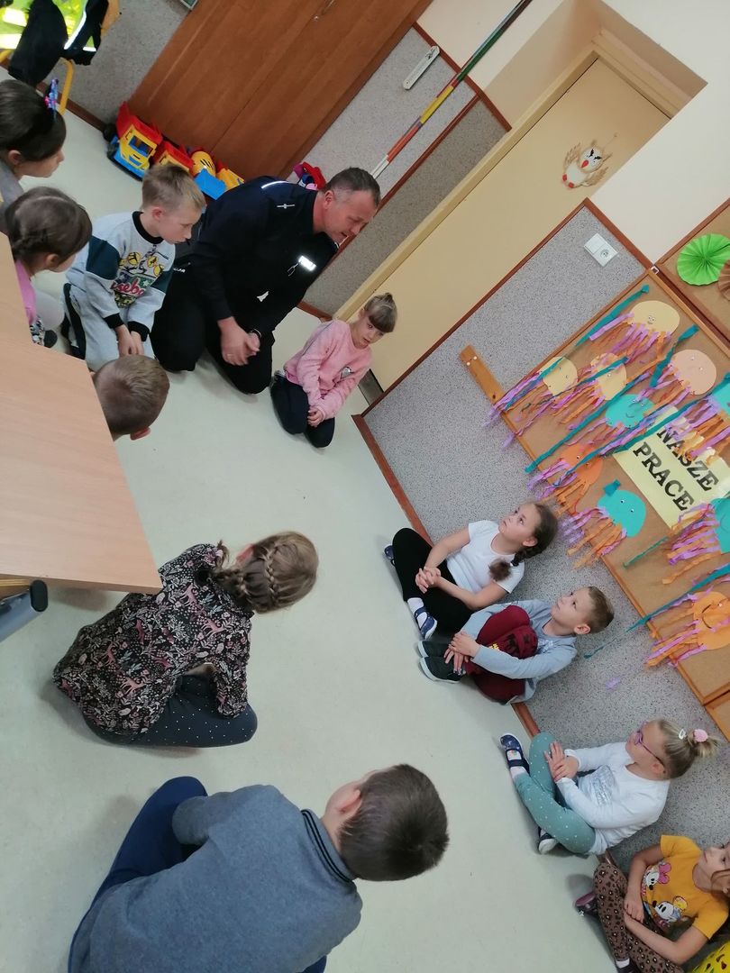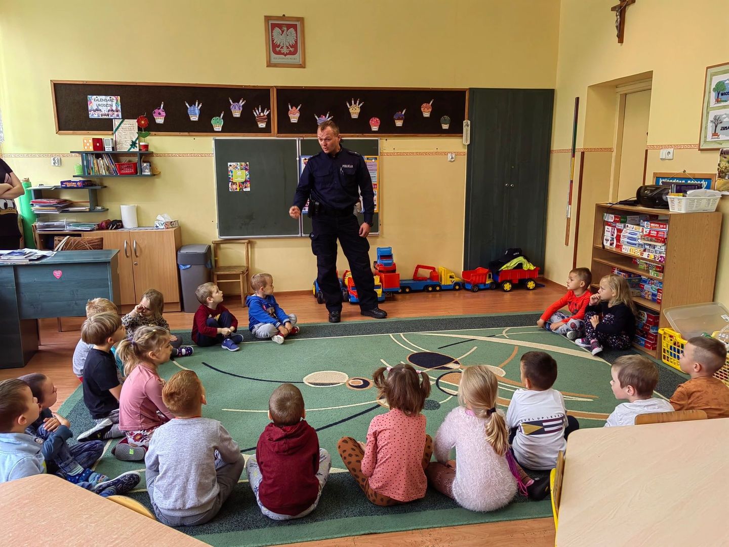 Mł.asp. Łukasz Stanisławski (dzielnicowy naszego rewiru) odwiedził dzieci z grup przedszkolnych w Mokronosie. Mundrur policyjny zrobił na maluchach ogromne wrażenie. Pan policjant przypomniał najmłodszym o najważniejszych zasadach bezpieczeństwa na drodze oraz w przypadku napotkania na groźne zwierzęta. Dzieci słuchały z ogromnym zaiteresowaniem i miejmy nadzieję, że będzie to dla nich ważna lekcja o bezpieczeństwie.