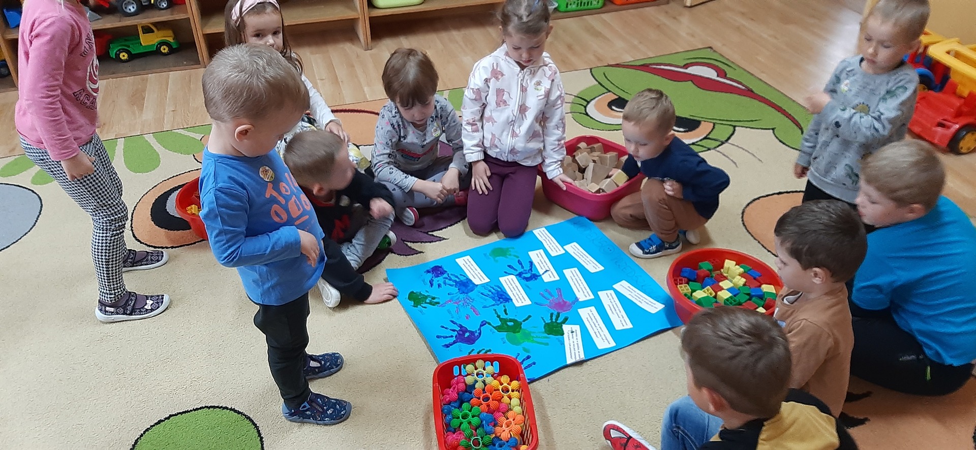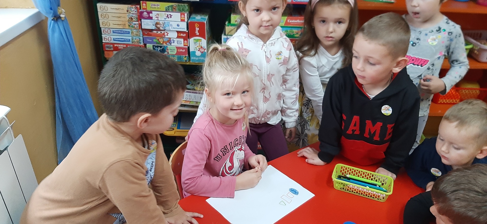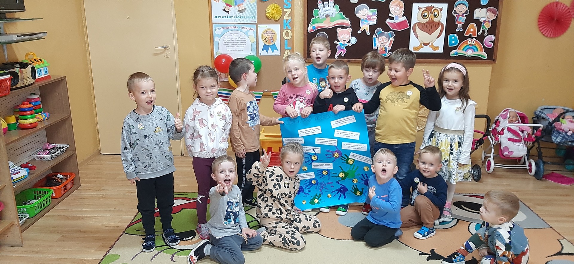 Przedszkolaki chętnie brały udział w zaproponowanych aktywnościach, m.in: były zabawy taneczne, quiz z zagadkami i specjalnymi zadaniami dla naszych dzieci, z którymi one poradziły sobie bez najmniejszych problemów. Quiz ten był formą toru przeszkód do pokonania na końcu którego czekała na maluchy słodka nagroda oraz specjalne dyplomy. Zanim jednak rozpoczęliśmy wspólne świętowanie przedszkolaki stworzyły kodeks, który podpisali przez odcisk swoich dłoni i którego zoobowiązli się przestrzegać.