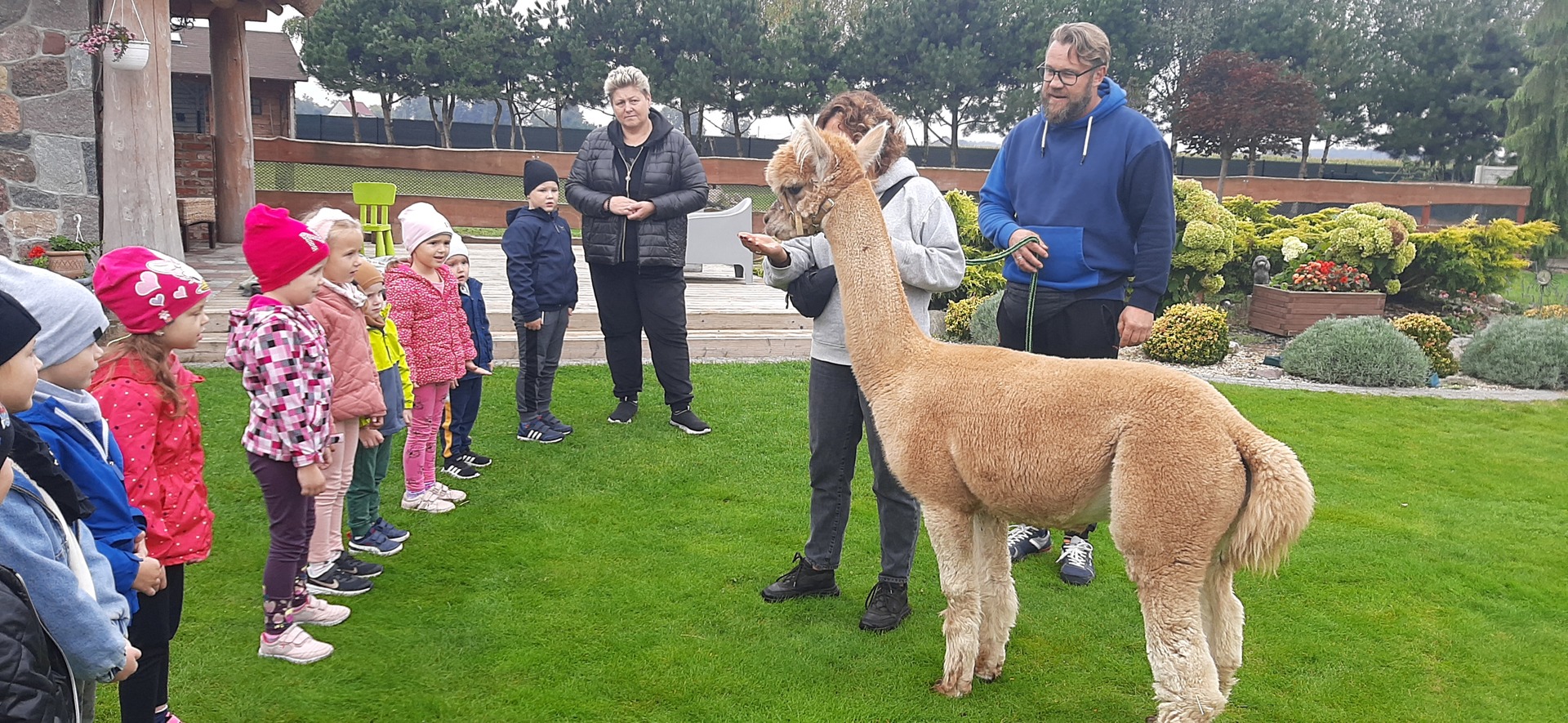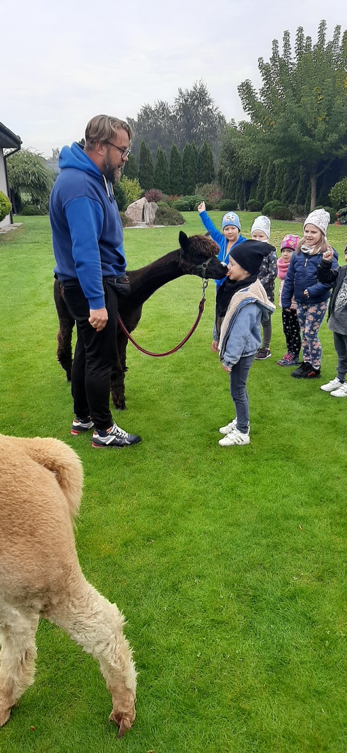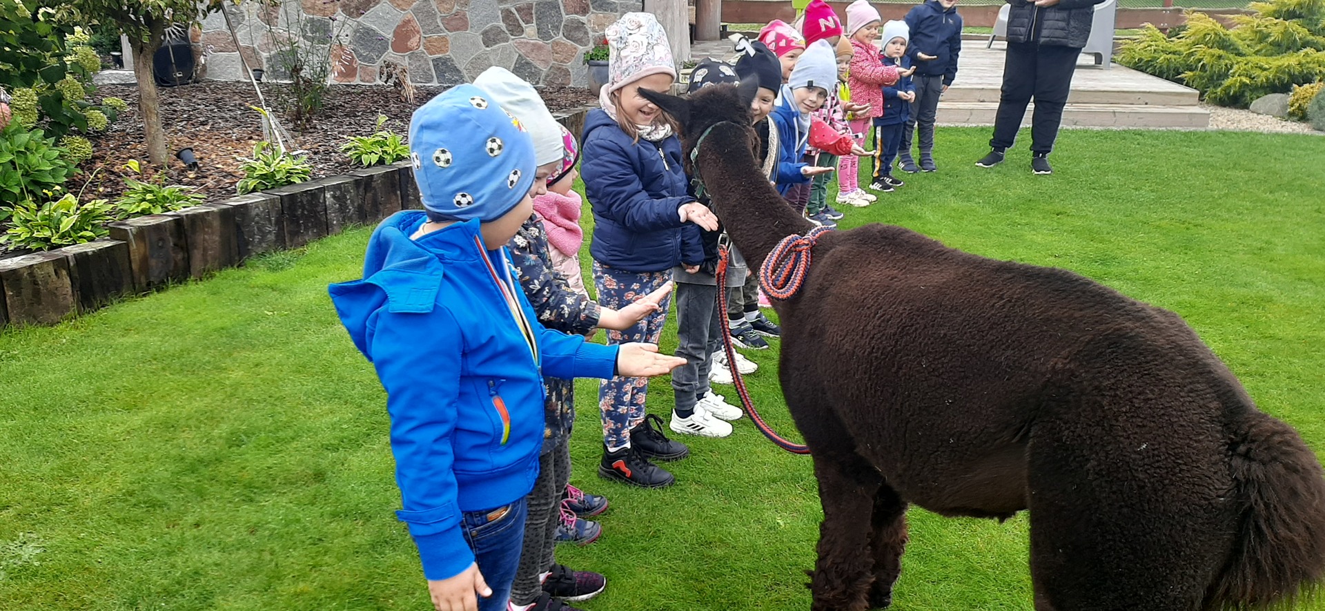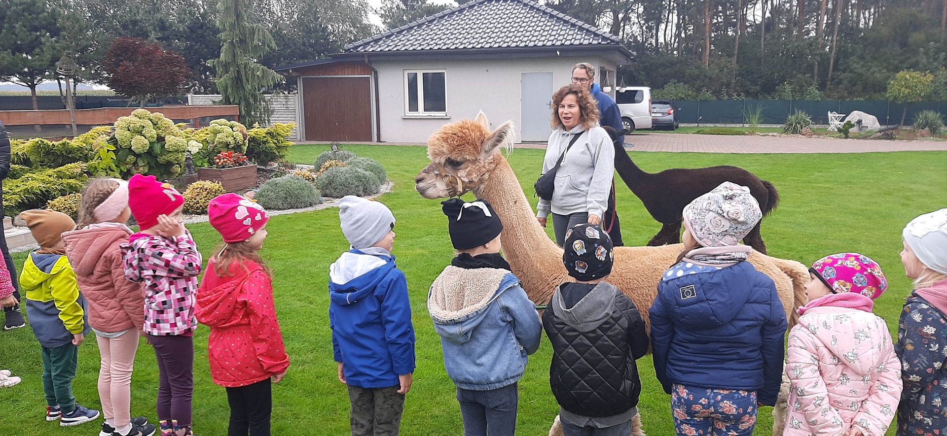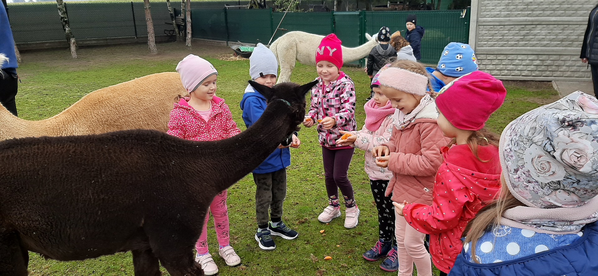 Dzieci miały okazję poznać, pogłaskać i nakarmić piękne żywe pluszaki – alpaki. Te niezwykłe zwierzęta są bardzo przyjazne i wzbudzają sympatię o czym przekonały się przedszkolaki.Alpaki, to zwierzęta o bardzo łagodnym usposobieniu. Są płochliwe i delikatne, zupełnie pozbawione agresji. Szczególnie pozytywnie nastawione są do dzieci. Głaskanie i przytulanie alpak pomaga dzieciom rozluźnić się i otworzyć. Spotkanie z alpakami było bardzo ciekawą lekcją edukacyjną, podczas której przedszkolaki poznały życie i zwyczaje tych przemiłych zwierząt. Dzieci wysłuchały wielu ciekawostek o alpakach. Na koniec wizyty dzieci zostały przepytane z informacji, które zdobyły, test został zaliczony pozytywnie a każde dziecko otrzymało medal. Każdy miał możliwość zrobić sobie zdjęcie z alpakom oraz mógł z nią pospacerować. Nasze maluchy wróciły do domów bardzo zadowolone, z uśmiechami na twarzach i nowo zdobytymi informacjami. Wszystkie przedszkolaki były zachwycone wizytą w zagrodzie.