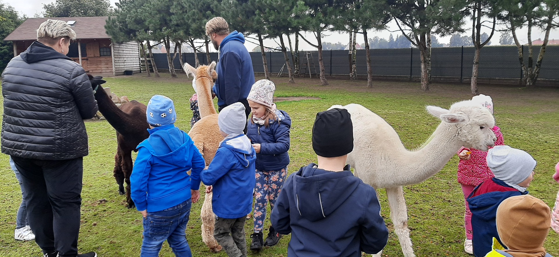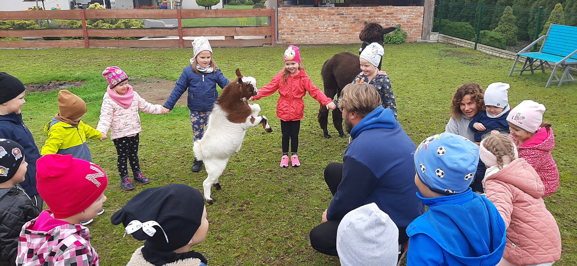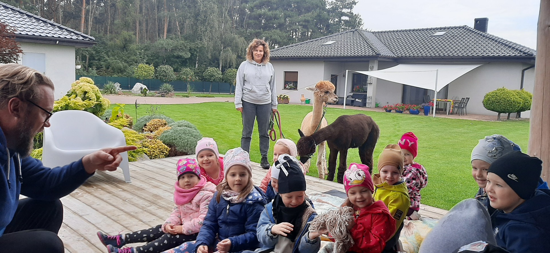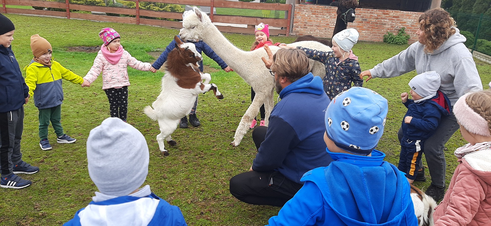 Dzieci miały okazję poznać, pogłaskać i nakarmić piękne żywe pluszaki – alpaki. Te niezwykłe zwierzęta są bardzo przyjazne i wzbudzają sympatię o czym przekonały się przedszkolaki.Alpaki, to zwierzęta o bardzo łagodnym usposobieniu. Są płochliwe i delikatne, zupełnie pozbawione agresji. Szczególnie pozytywnie nastawione są do dzieci. Głaskanie i przytulanie alpak pomaga dzieciom rozluźnić się i otworzyć. Spotkanie z alpakami było bardzo ciekawą lekcją edukacyjną, podczas której przedszkolaki poznały życie i zwyczaje tych przemiłych zwierząt. Dzieci wysłuchały wielu ciekawostek o alpakach. Na koniec wizyty dzieci zostały przepytane z informacji, które zdobyły, test został zaliczony pozytywnie a każde dziecko otrzymało medal. Każdy miał możliwość zrobić sobie zdjęcie z alpakom oraz mógł z nią pospacerować. Nasze maluchy wróciły do domów bardzo zadowolone, z uśmiechami na twarzach i nowo zdobytymi informacjami. Wszystkie przedszkolaki były zachwycone wizytą w zagrodzie.