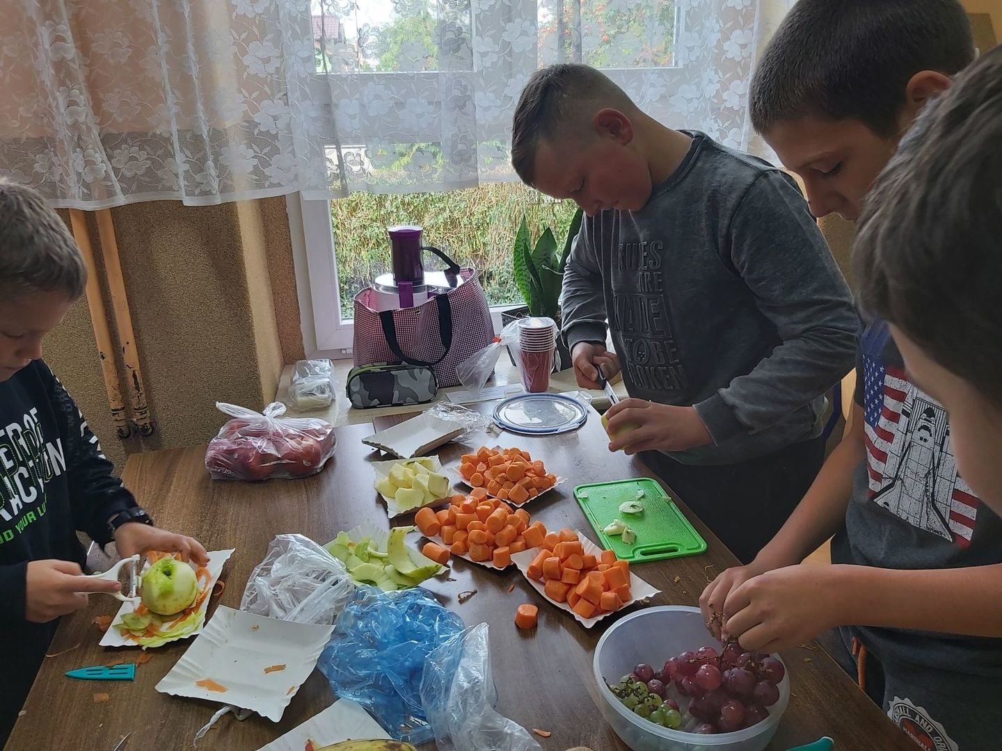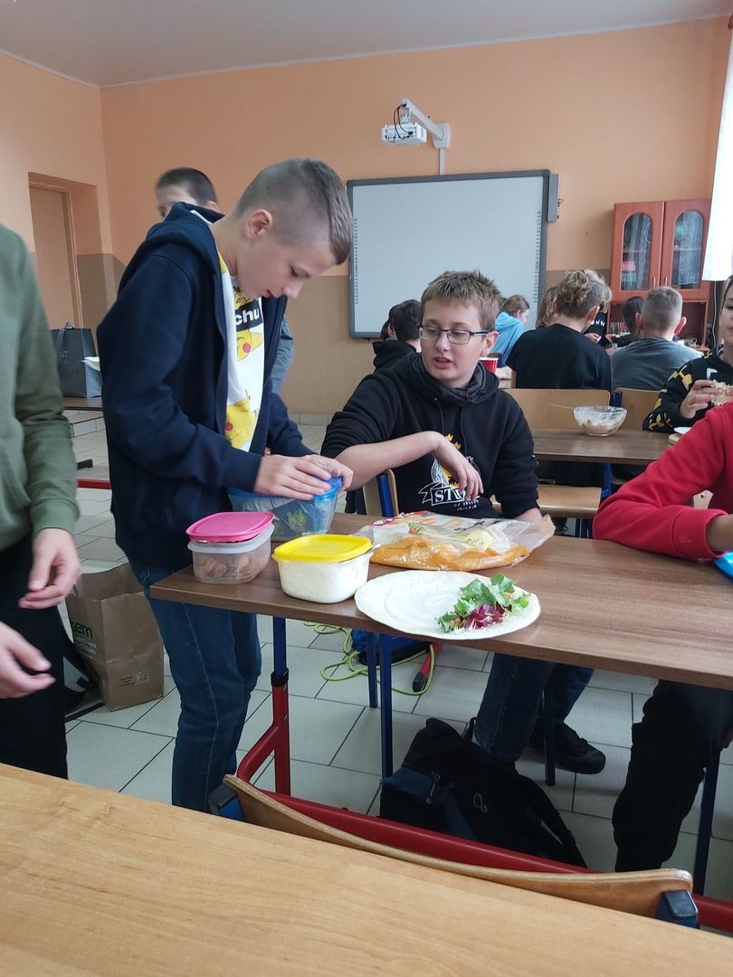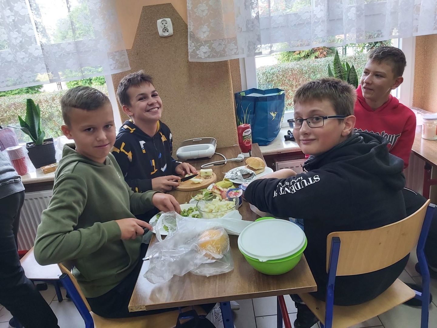 W ramach zajęć rozwijających zainteresowania uczniowie klasy VI pokazali swoje zdolności kulinarne. Celem zajęć było rozwijanie umiejętności kulinarnych, kształtowanie umiejętności przygotowania posiłków z zachowaniem zasad higieny, umiejętność pracy w grupie, kształtowanie umiejętności posługiwania się różnego rodzaju sprzętu kuchennego z zachowaniem zasad bezpieczeństwa oraz umiejętność gospodarowania czasem. Dzieci przygotowały pyszne gofry, tortille, tosty, sałatki owocowe, szaszłyki owocowe oraz świeżo wyciskane soki. Na zakończenie zajęć odbyła się wspólna degustacja oraz rozmowy przy wspólnym stole.