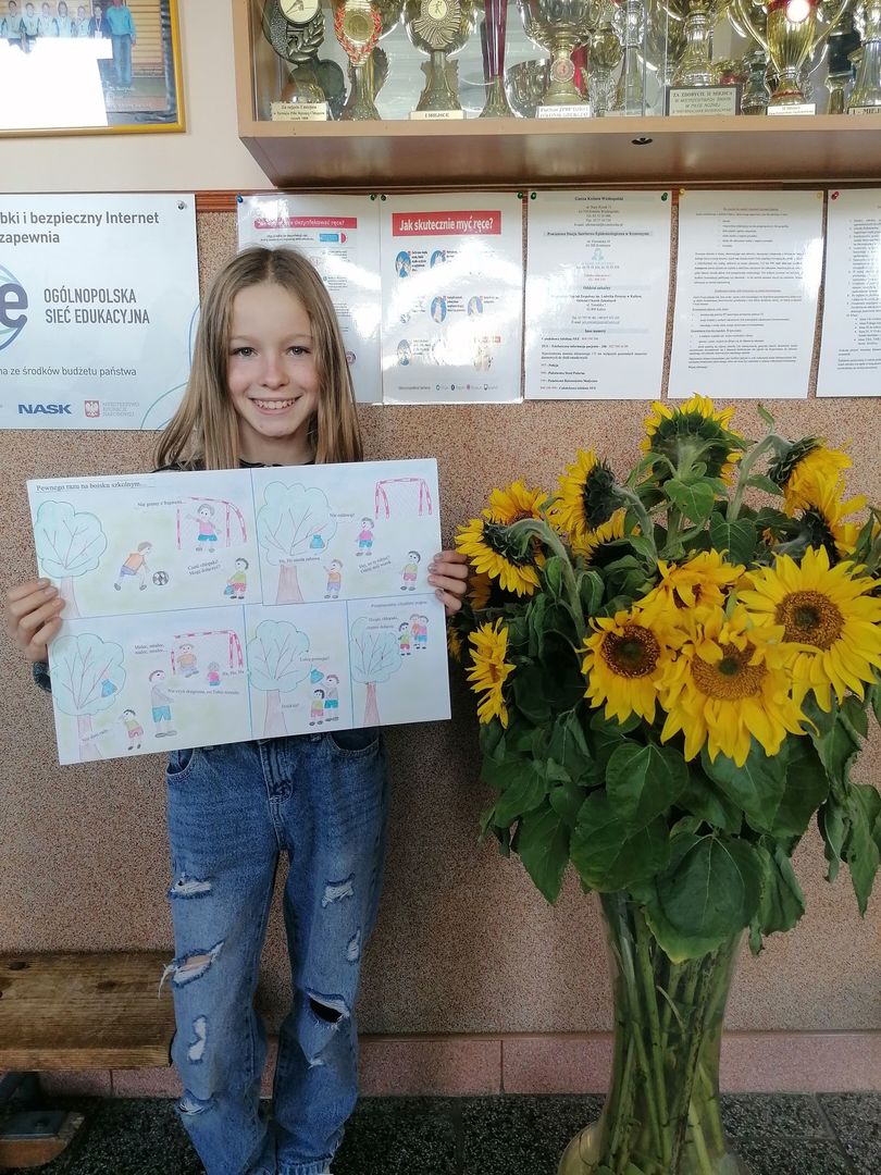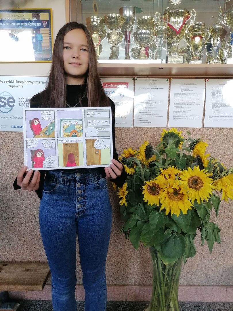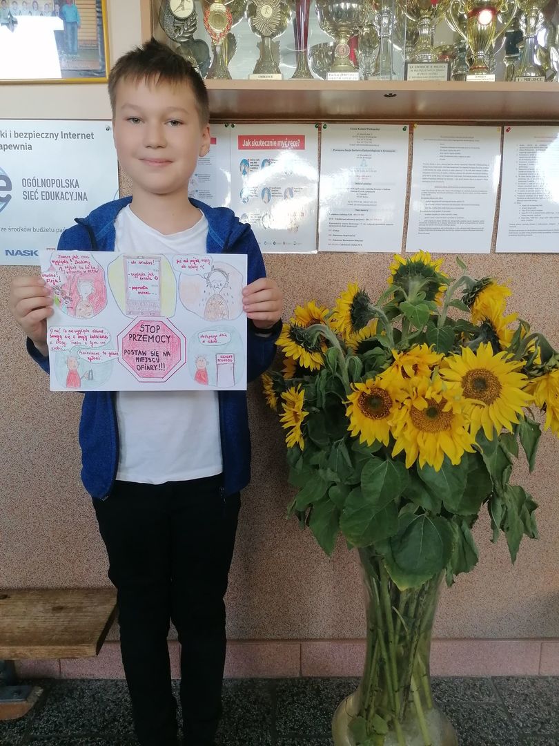 Dnia 17 października br. został rozstrzygnięty konkurs pt. "Razem przeciw przemocy" Reaguję, gdy jestem świadkiem przemocy; Informuję, gdzie szukać pomocy, który został zorganizowany w ramach obchodów "Międzynarodowego Dnia Bez Przemocy". Uczniowie klas I-VIII mieli za zadanie wykonać krótki komiks na temat konstruktywnych sposobów reagowania wobec przemocy.