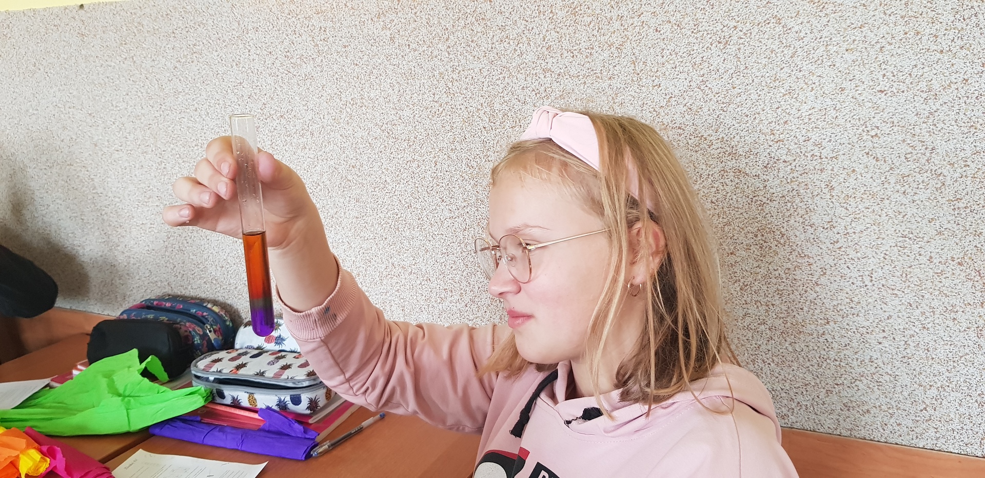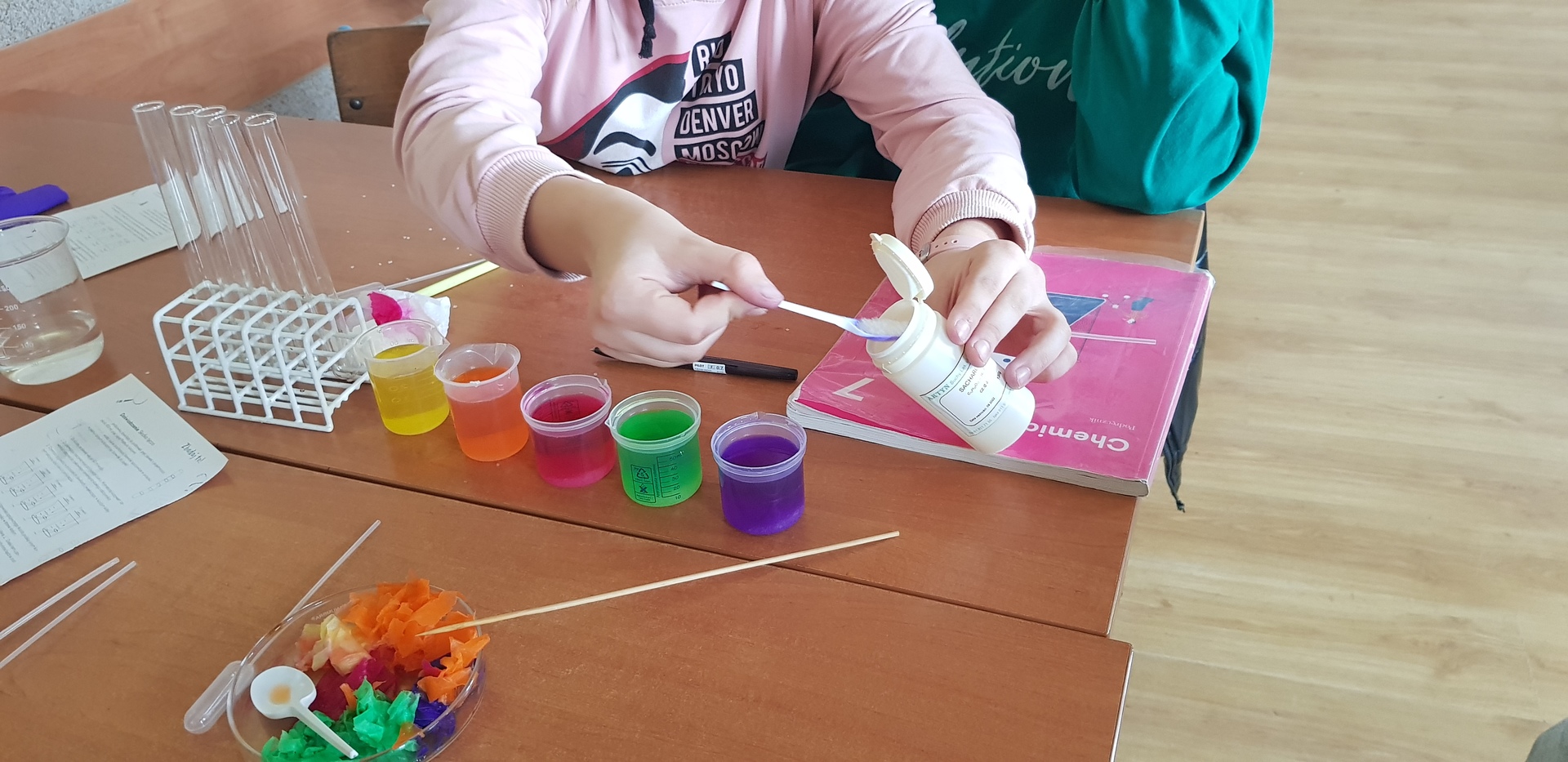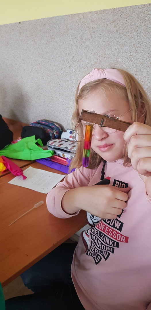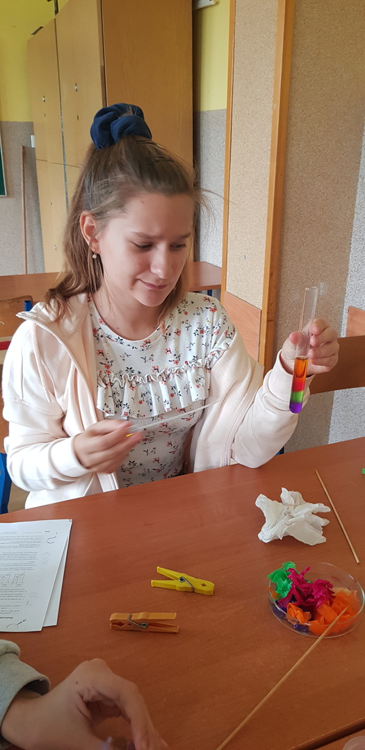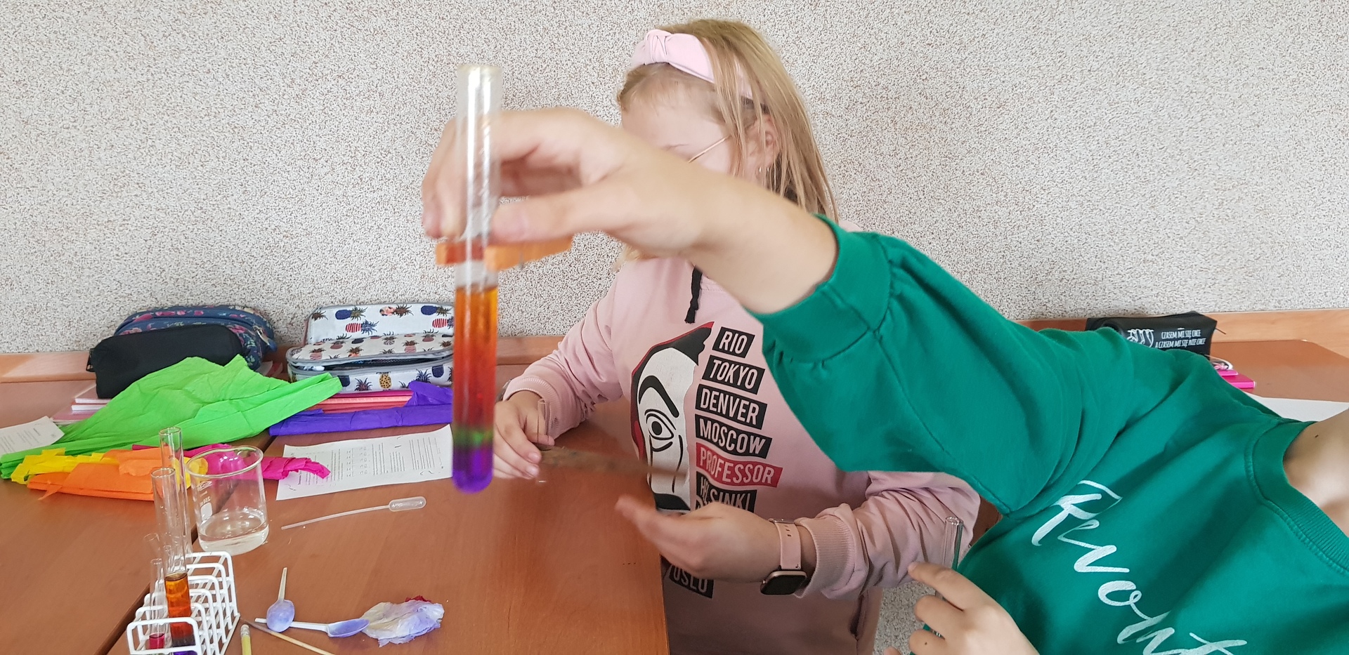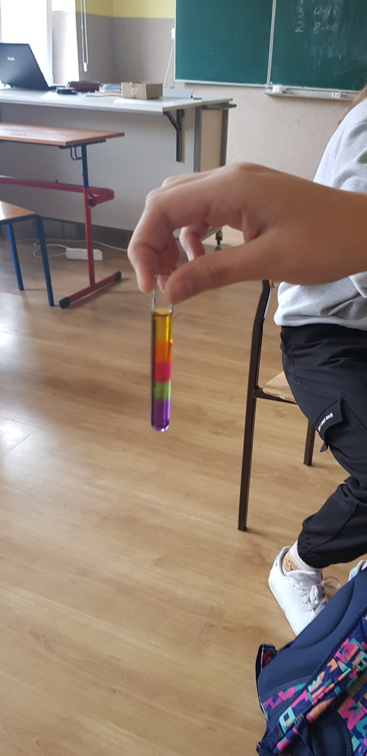 Uczniowie klasy siódmej przygotowując roztwory cukru w wodzie, porównywali ich gęstości. W tym celu utworzyli piękne kolorowe tęcze w probówkach.