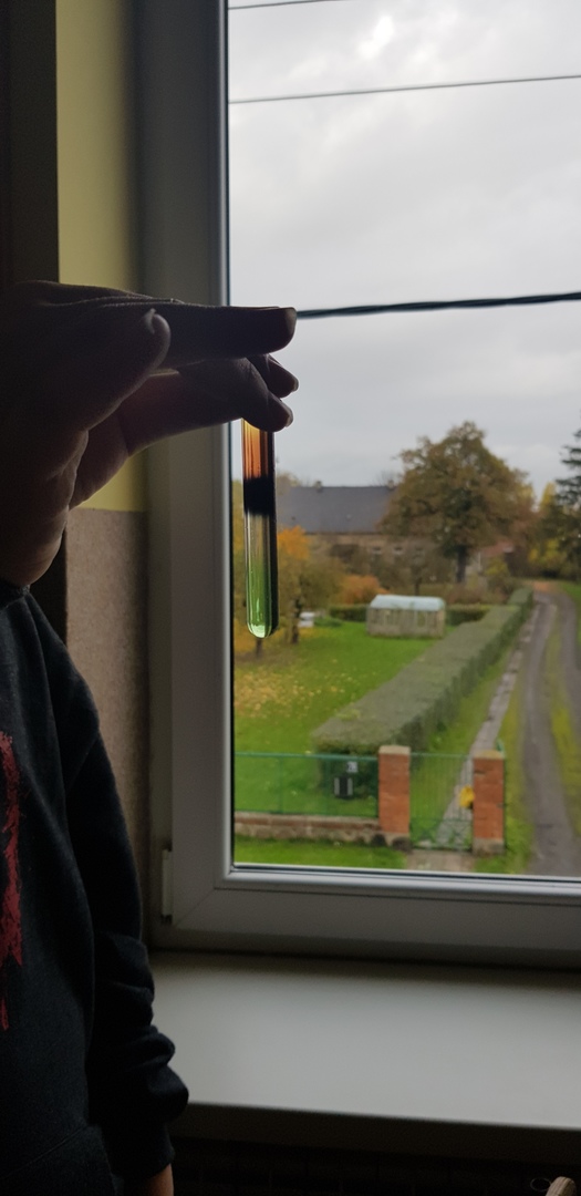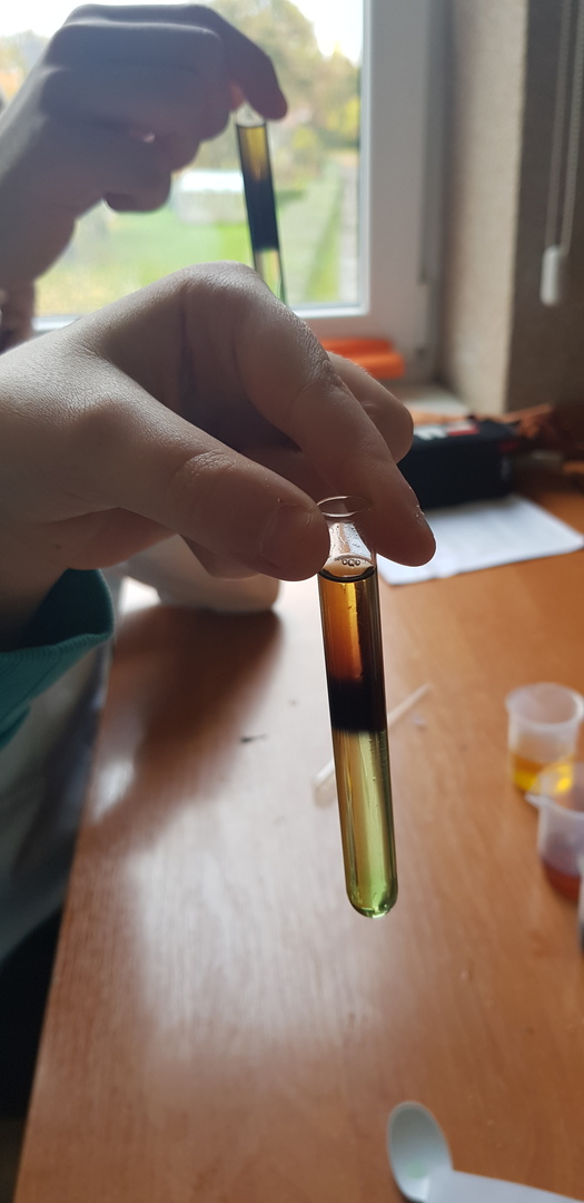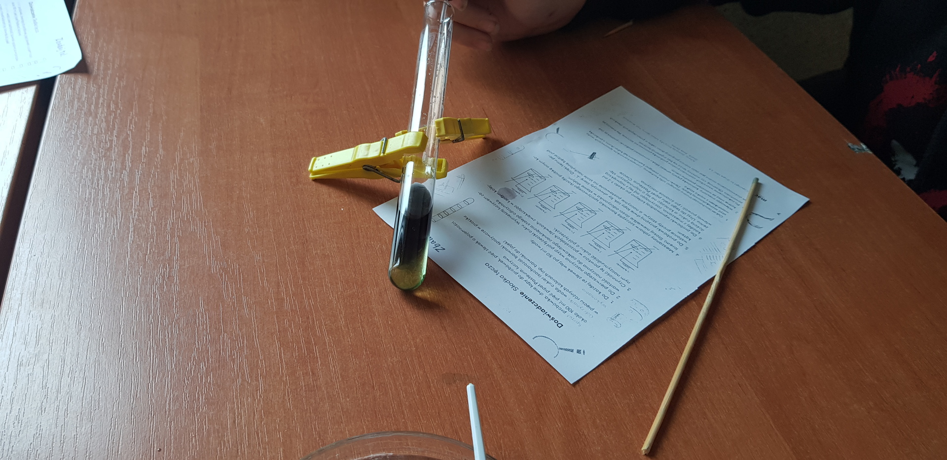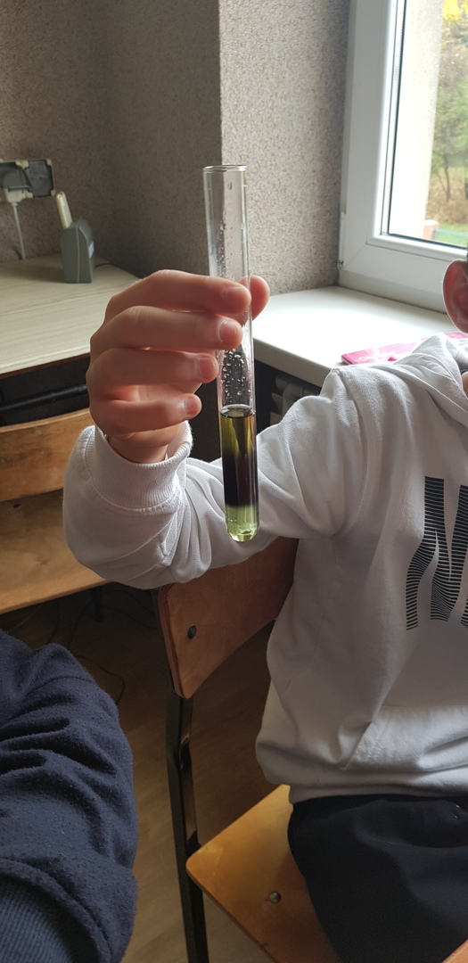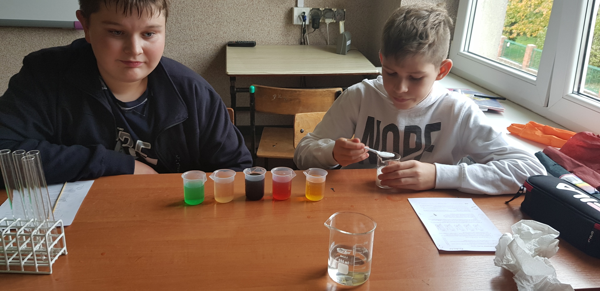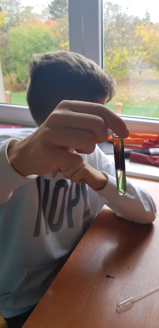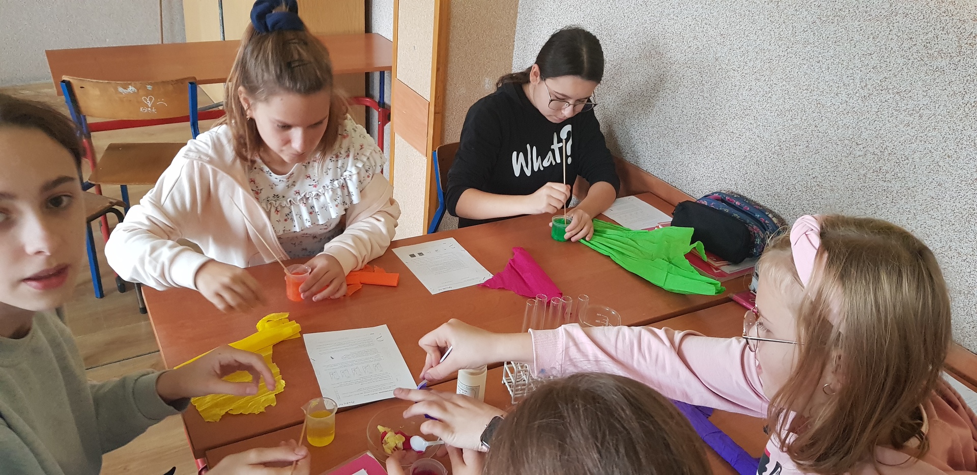 Uczniowie klasy siódmej przygotowując roztwory cukru w wodzie, porównywali ich gęstości. W tym celu utworzyli piękne kolorowe tęcze w probówkach.