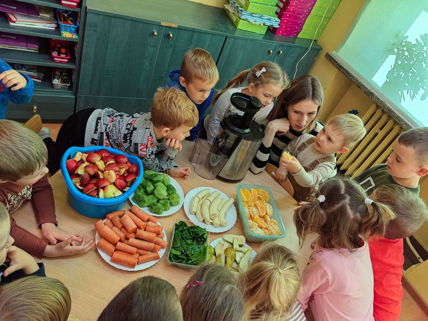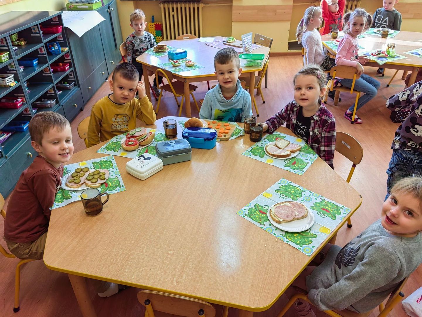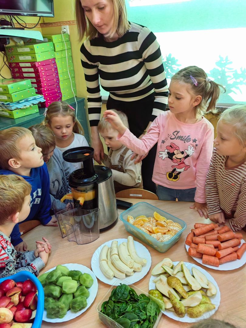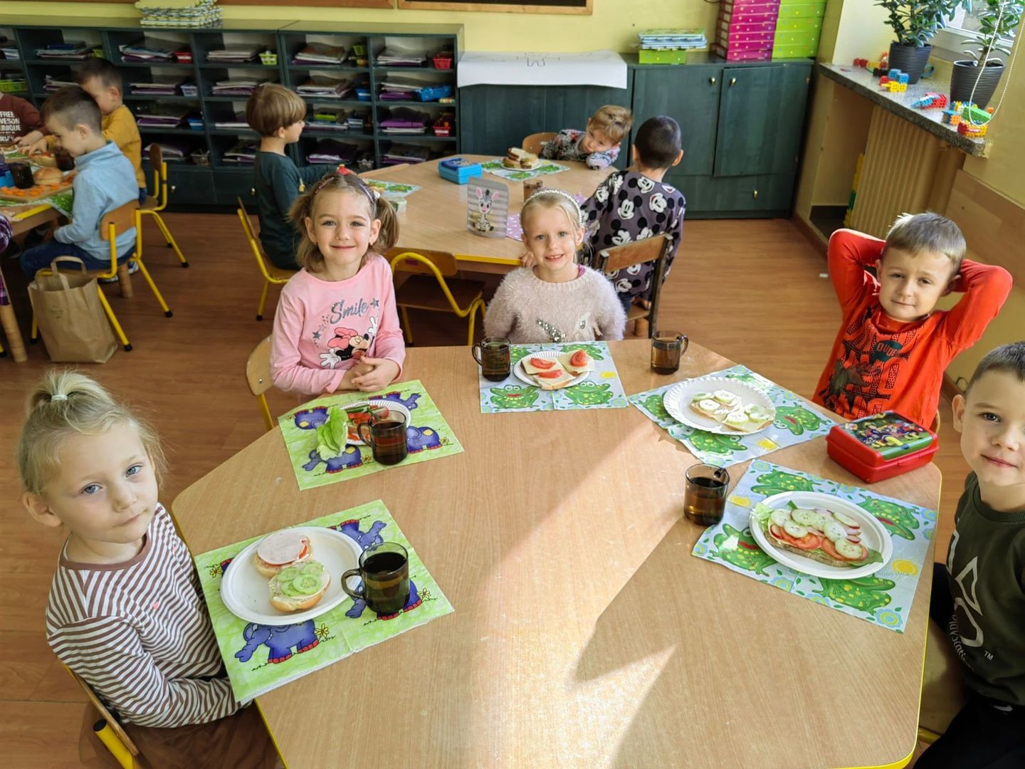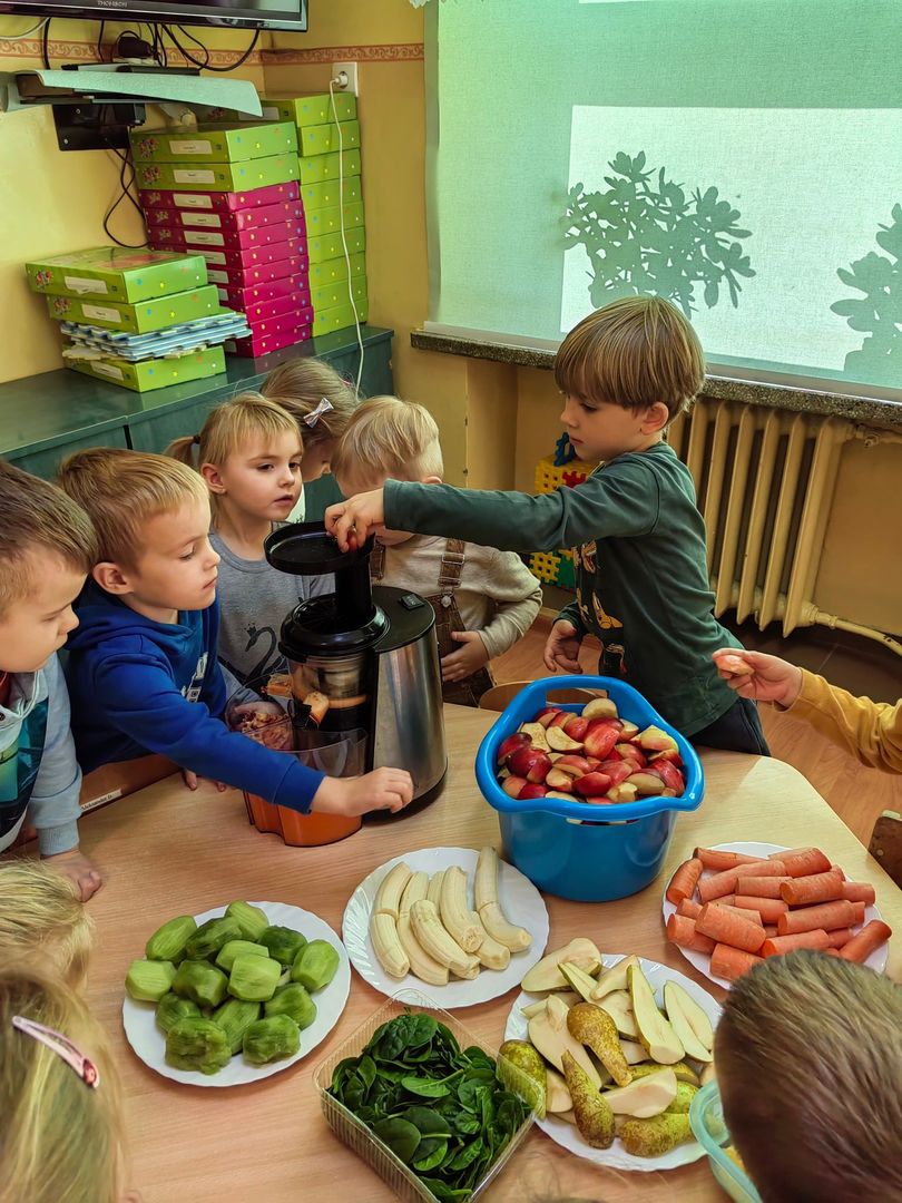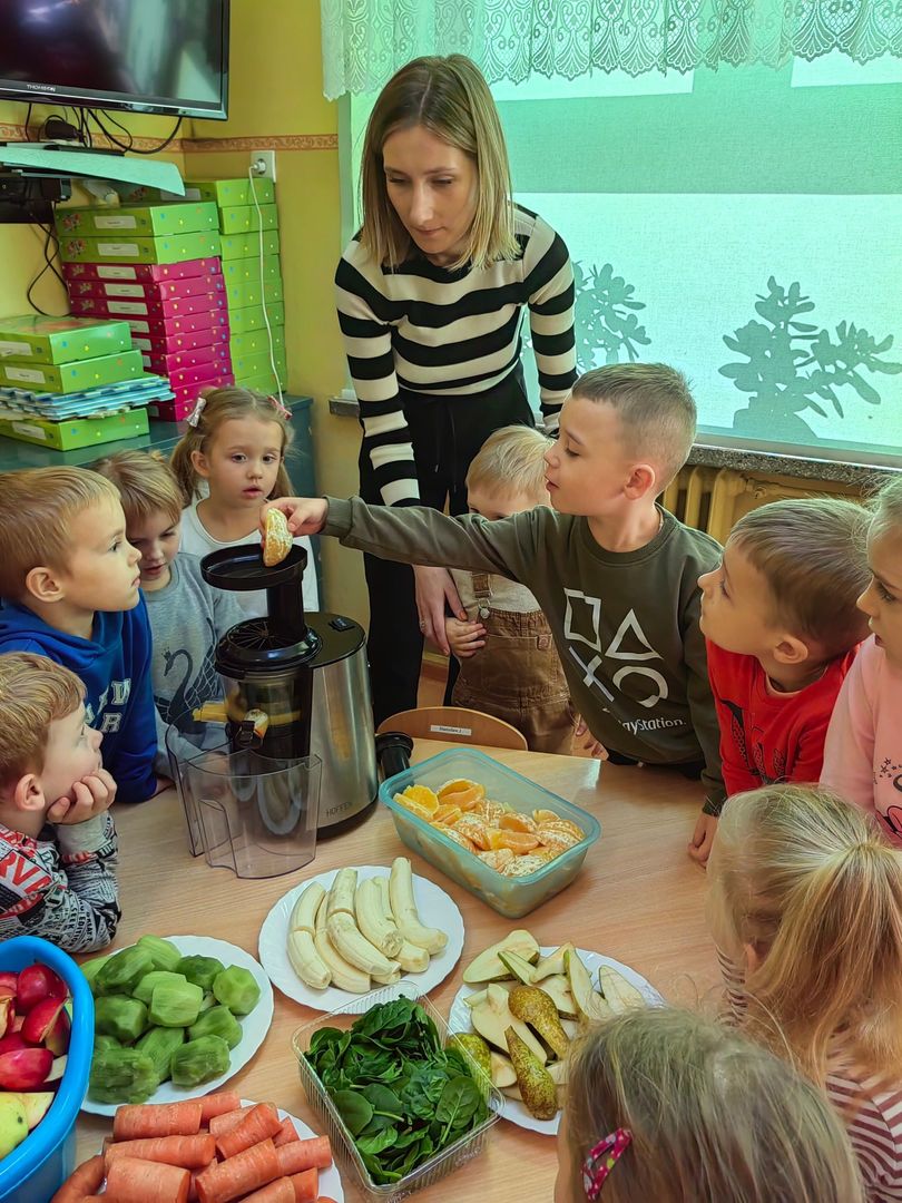 Dziś dzieci z oddziału przedszkolnego 4-5 latki od samego rana świętowały Dzień Zdrowego Śniadania. Samodzielnie przygotowały pyszne i zdrowe kanapki. Miłą niespodzianką okazały się zajęcia, które przeprowadziła p. Lidia Staniek, technolog żywności i żywienia człowieka. Przekazała dzieciom wiele ciekawych wskazówek oraz rad jak zdrowo się odżywiać i na czym powinna być oparta dieta każdego człowieka. Zwróciła również uwagę na wszystkie niezdrowe produkty, które wpływają niekorzystnie na organizm człowieka. Cała grupa wspólnie stworzyła plakat dzieląc produkty na zdrowe oraz niezdrowe. Końcowym elementem spotkania było przygotowanie owocowych soków. Sprawiło to dzieciom wiele radości, wykazały się pomocna dłonią w produkcji napojów. Najlepszym momentem była ich degustacja. Pyszne, bogate w witaminy, kolorowe soki zniknęły w mgnieniu oka.