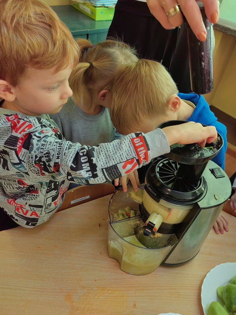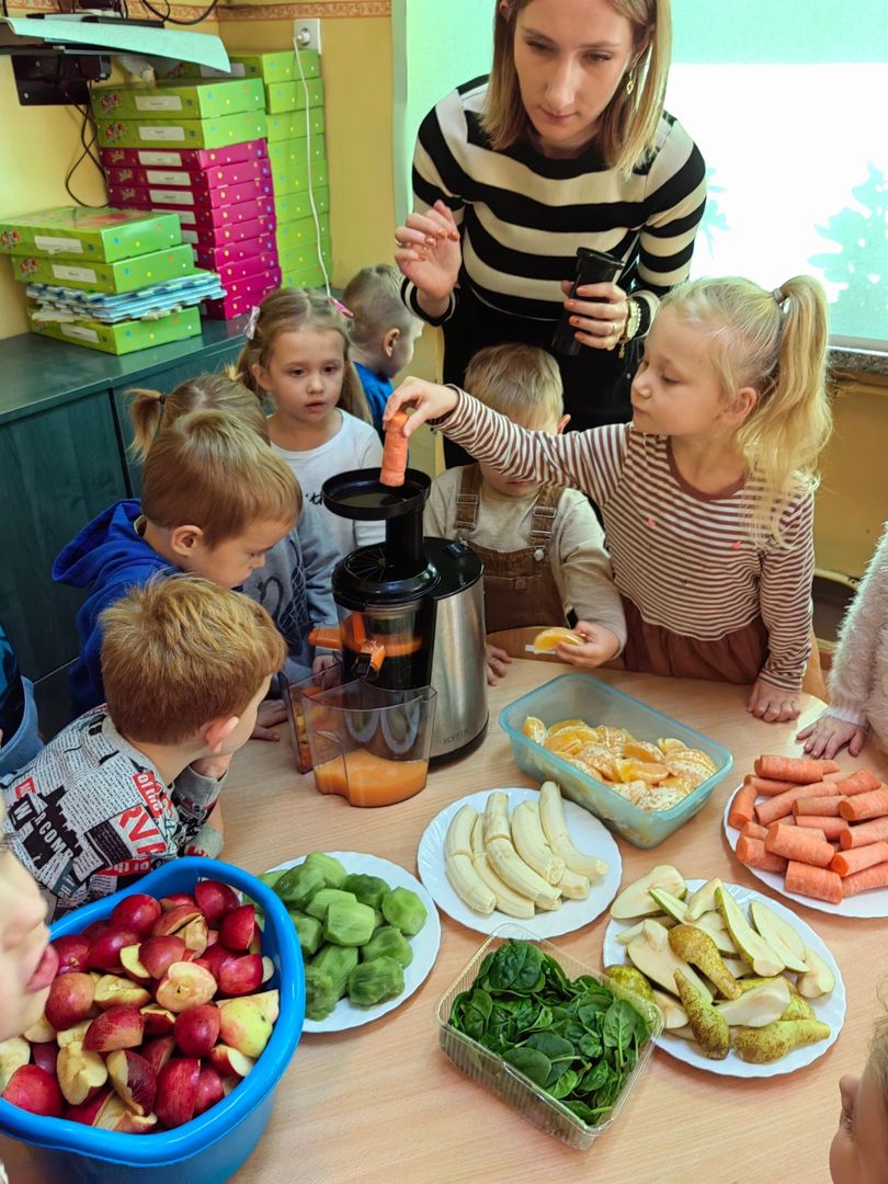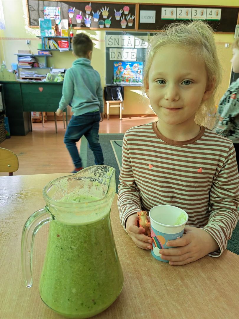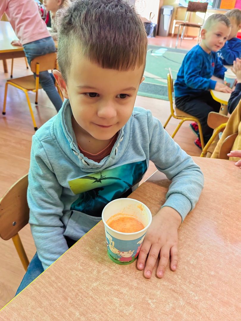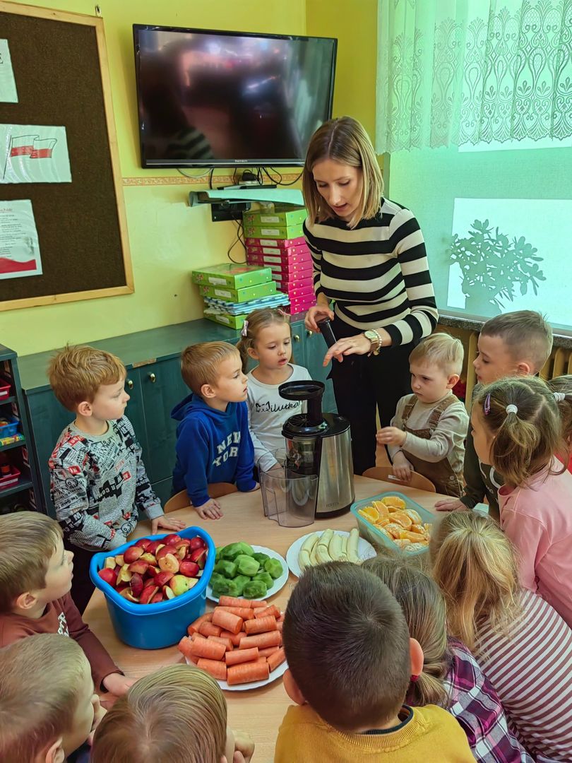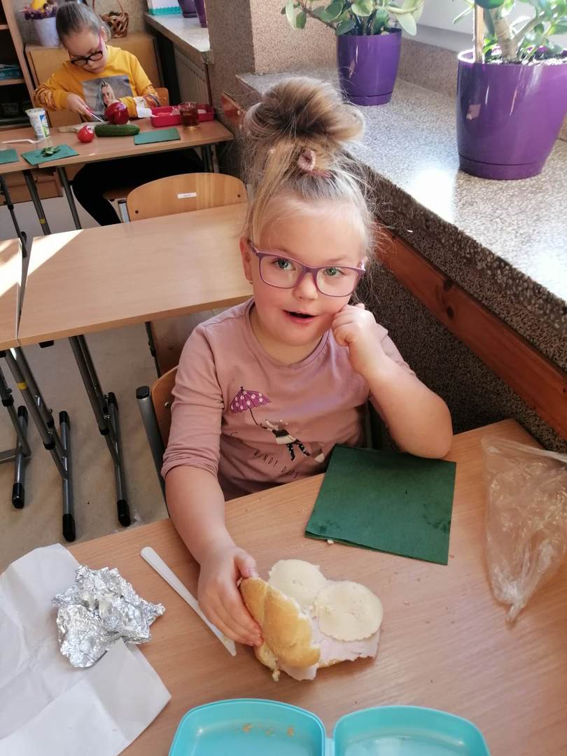 Dziś dzieci z oddziału przedszkolnego 4-5 latki od samego rana świętowały Dzień Zdrowego Śniadania. Samodzielnie przygotowały pyszne i zdrowe kanapki. Miłą niespodzianką okazały się zajęcia, które przeprowadziła p. Lidia Staniek, technolog żywności i żywienia człowieka. Przekazała dzieciom wiele ciekawych wskazówek oraz rad jak zdrowo się odżywiać i na czym powinna być oparta dieta każdego człowieka. Zwróciła również uwagę na wszystkie niezdrowe produkty, które wpływają niekorzystnie na organizm człowieka. Cała grupa wspólnie stworzyła plakat dzieląc produkty na zdrowe oraz niezdrowe. Końcowym elementem spotkania było przygotowanie owocowych soków. Sprawiło to dzieciom wiele radości, wykazały się pomocna dłonią w produkcji napojów. Najlepszym momentem była ich degustacja. Pyszne, bogate w witaminy, kolorowe soki zniknęły w mgnieniu oka.
