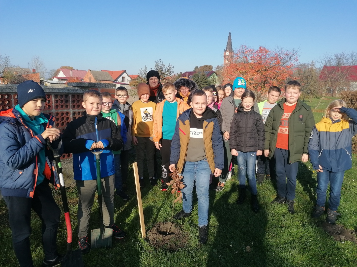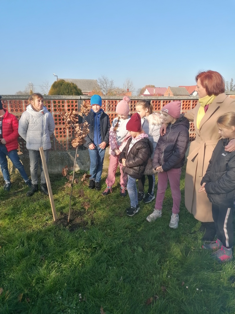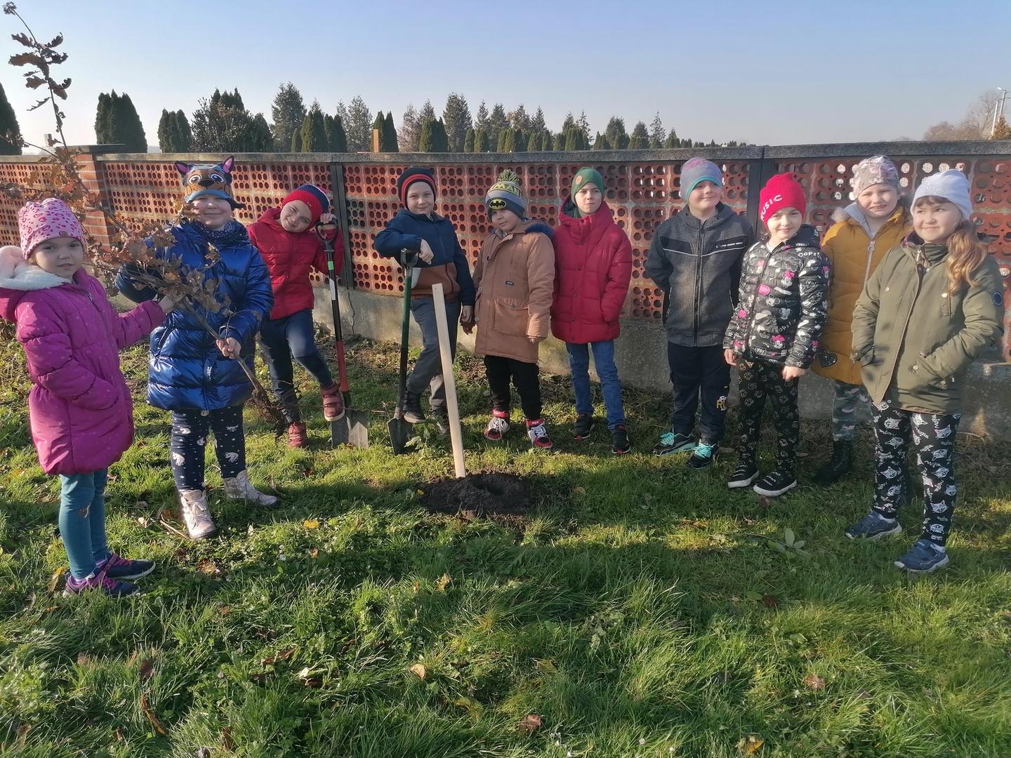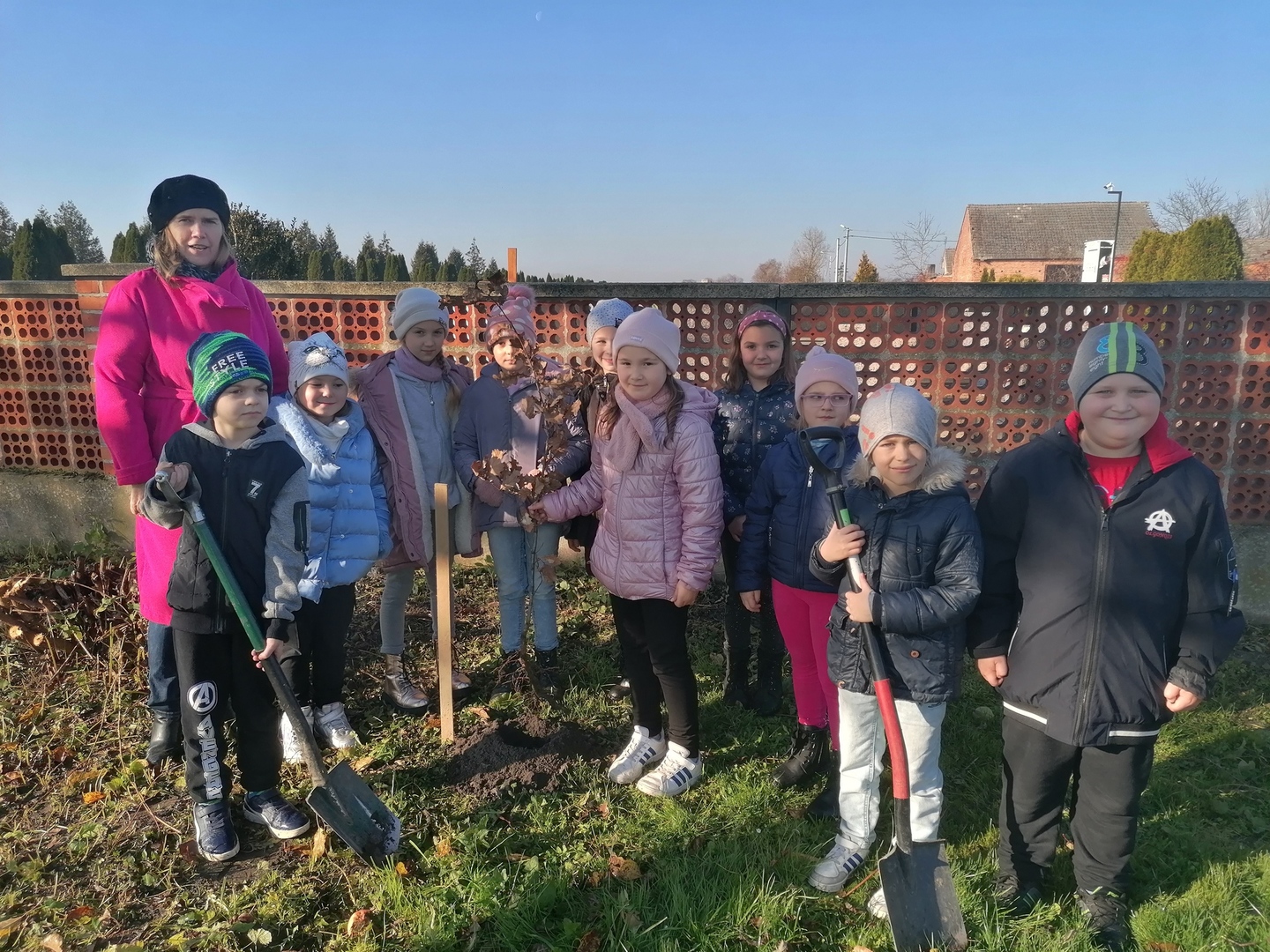 W ramach programu edukacji ekologicznej w naszej szkole w dniu 15 listopada br., w piękne, słoneczne przedpołudnie uczniowie posadzili drzewa na terenie ogrodu szkolnego. Każda klasa otrzymała symboliczną sadzonkę dębu, natomiast dzieci z oddziałów przedszkolnych otrzymały sadzonkę jarzębiny. Podczas całego pobytu w szkole będą pielęgnować i obserwować wzrost drzew. Po wielu latach, jako dorośli ludzie będą mogli zobaczyć co zrobili jako uczniowie tej szkoły. Niech posadzone drzewa będą symbolem upływającego czasu i na zawsze pozostaną ostoją przyrody wokół naszej szkoły.