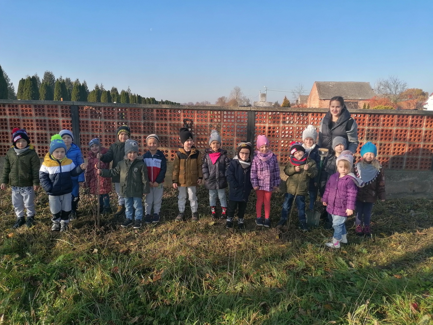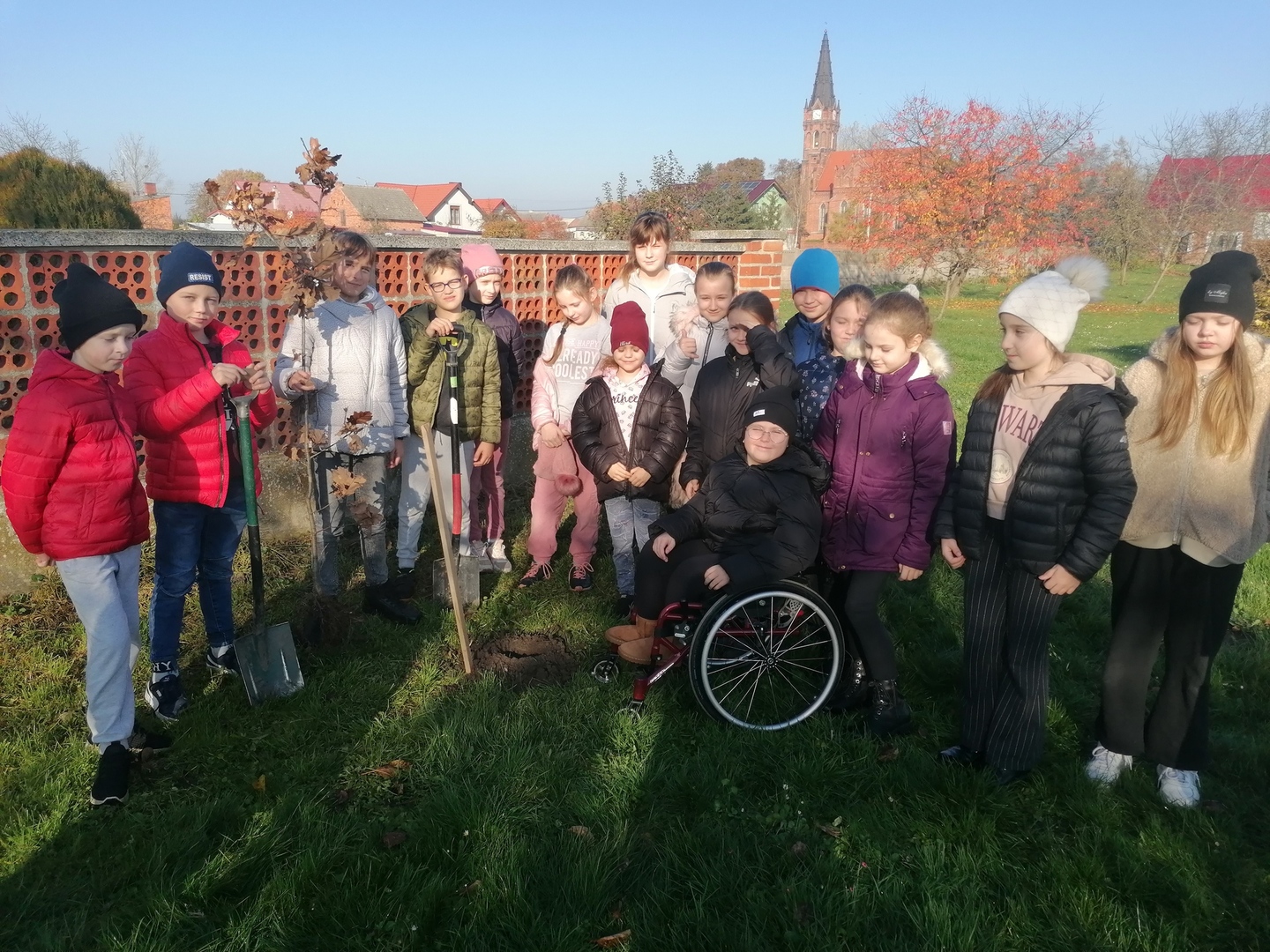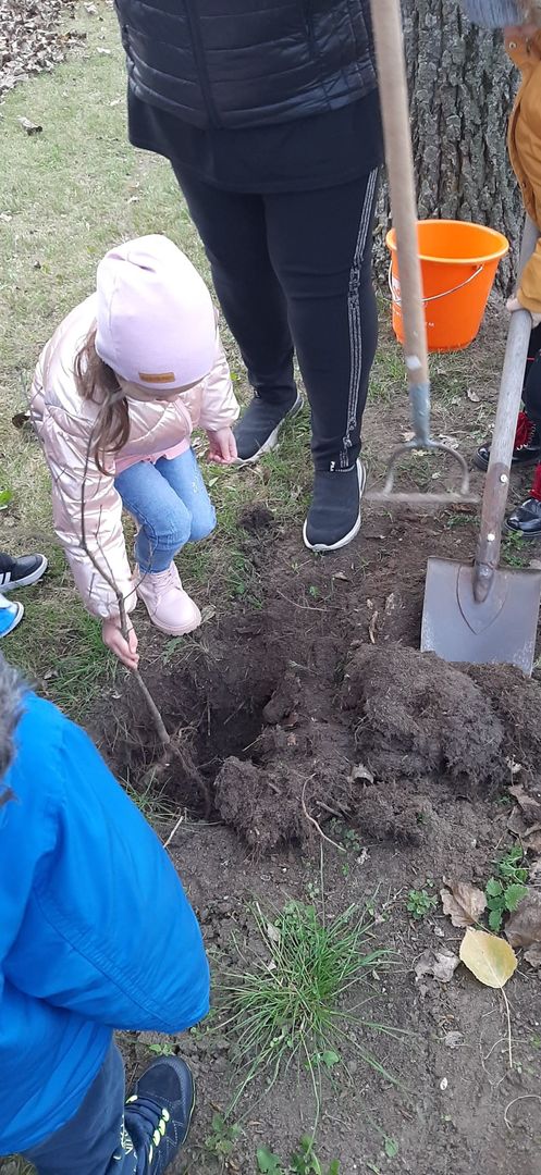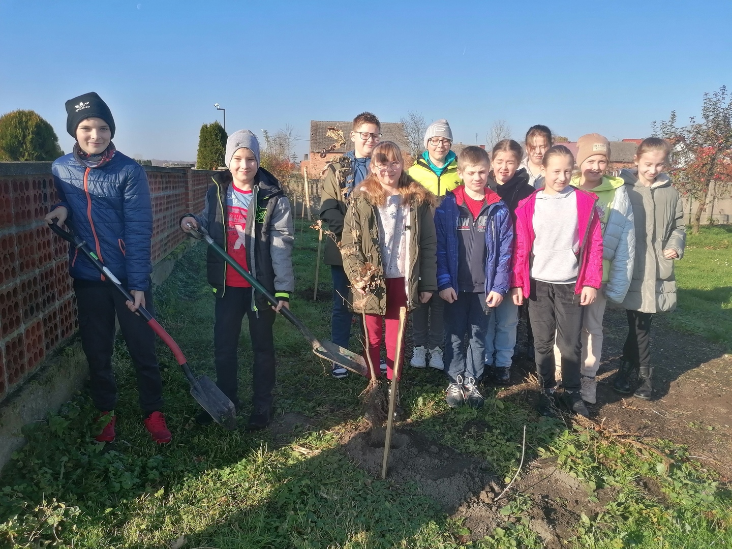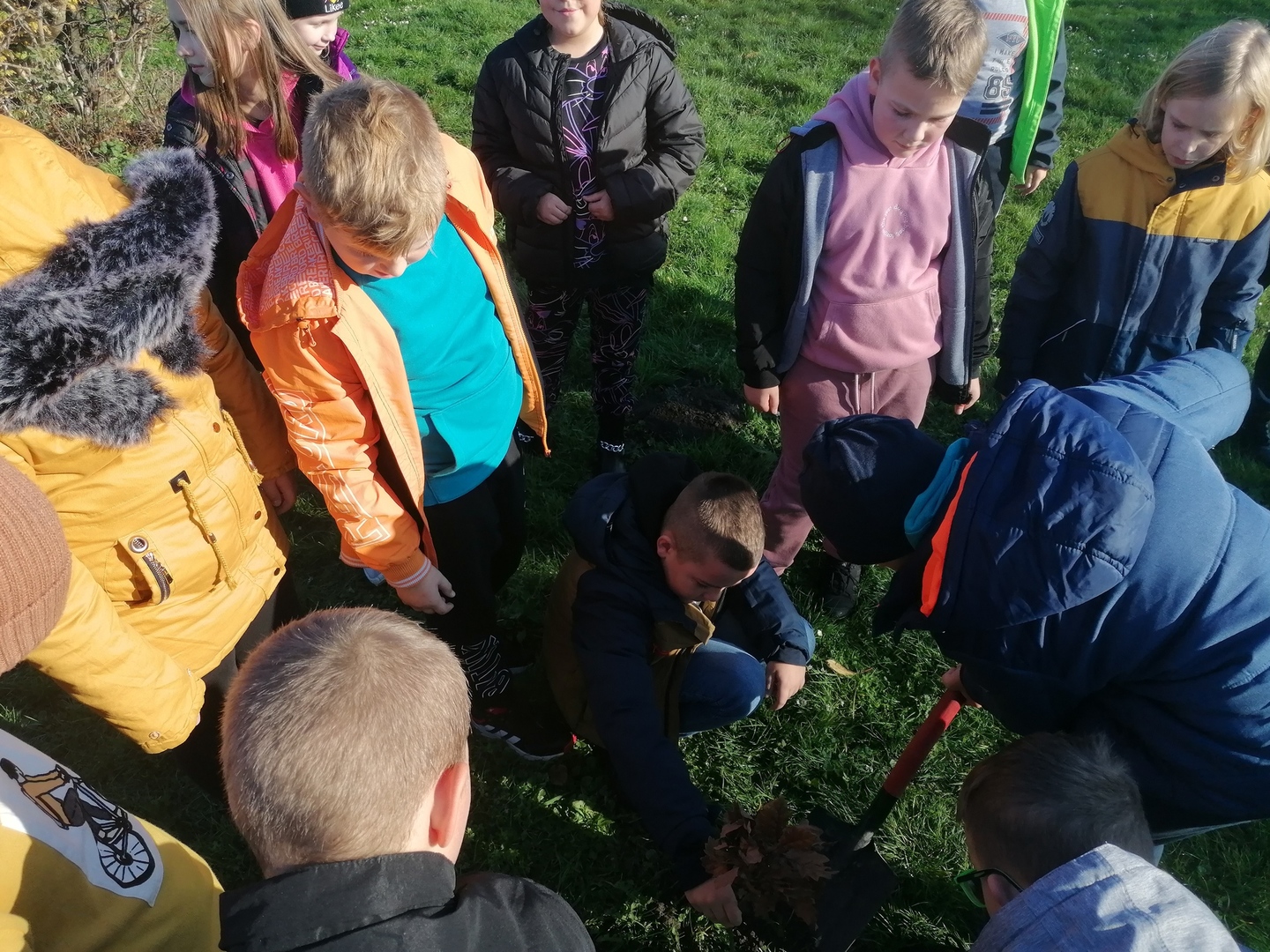 W ramach programu edukacji ekologicznej w naszej szkole w dniu 15 listopada br., w piękne, słoneczne przedpołudnie uczniowie posadzili drzewa na terenie ogrodu szkolnego. Każda klasa otrzymała symboliczną sadzonkę dębu, natomiast dzieci z oddziałów przedszkolnych otrzymały sadzonkę jarzębiny. Podczas całego pobytu w szkole będą pielęgnować i obserwować wzrost drzew. Po wielu latach, jako dorośli ludzie będą mogli zobaczyć co zrobili jako uczniowie tej szkoły. Niech posadzone drzewa będą symbolem upływającego czasu i na zawsze pozostaną ostoją przyrody wokół naszej szkoły.